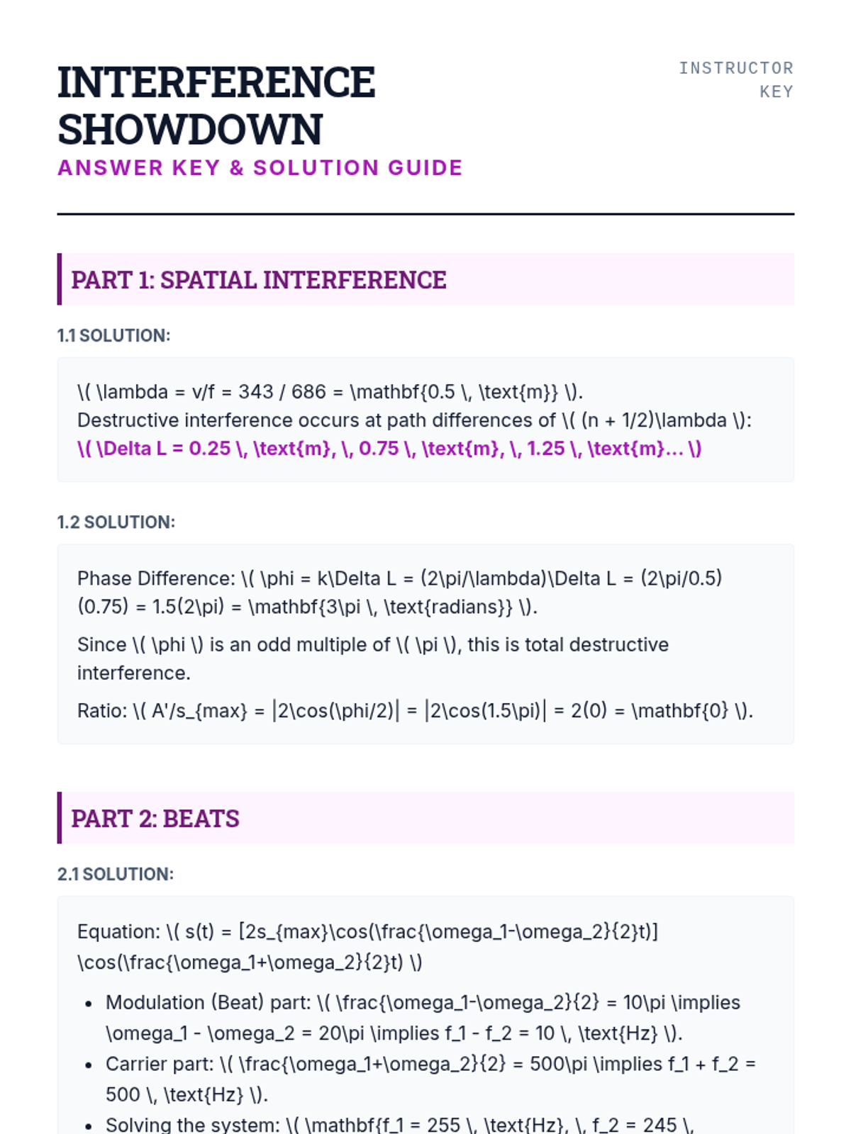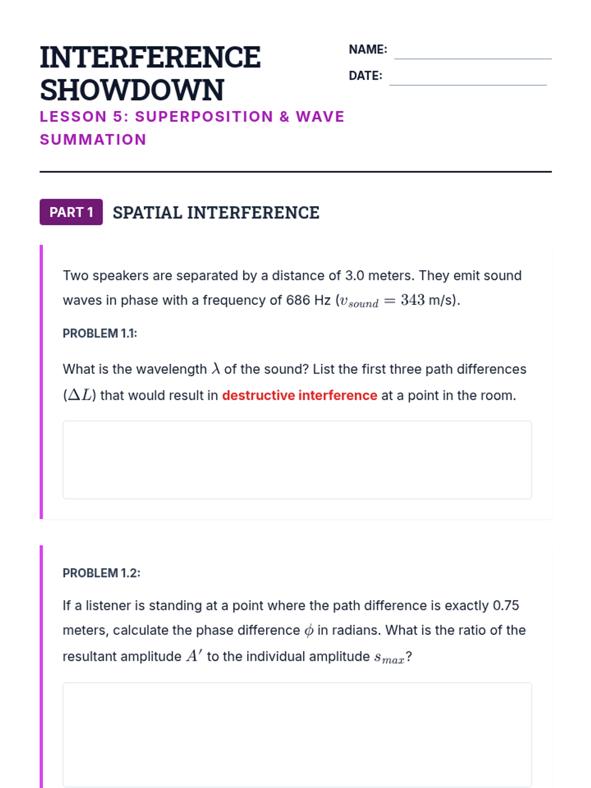 Students apply the principle of linear superposition to model interference patterns and beat frequencies. The lesson involves calculating the resulting amplitude of combined waves and analyzing constructive versus destructive interference conditions.