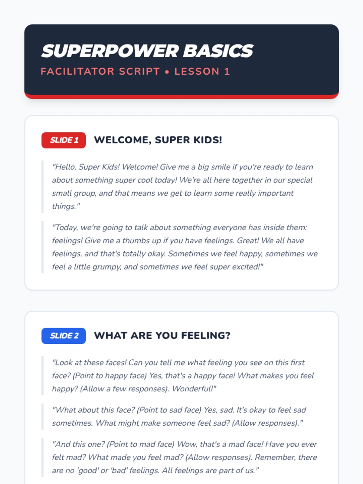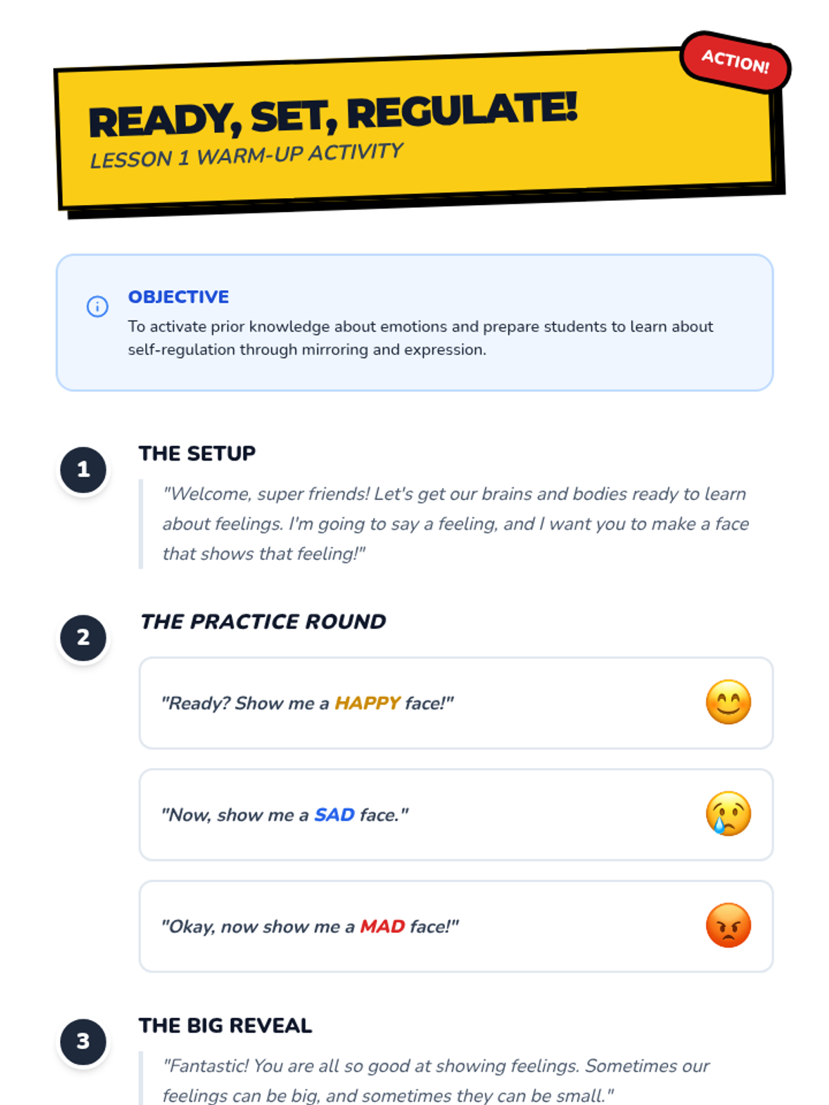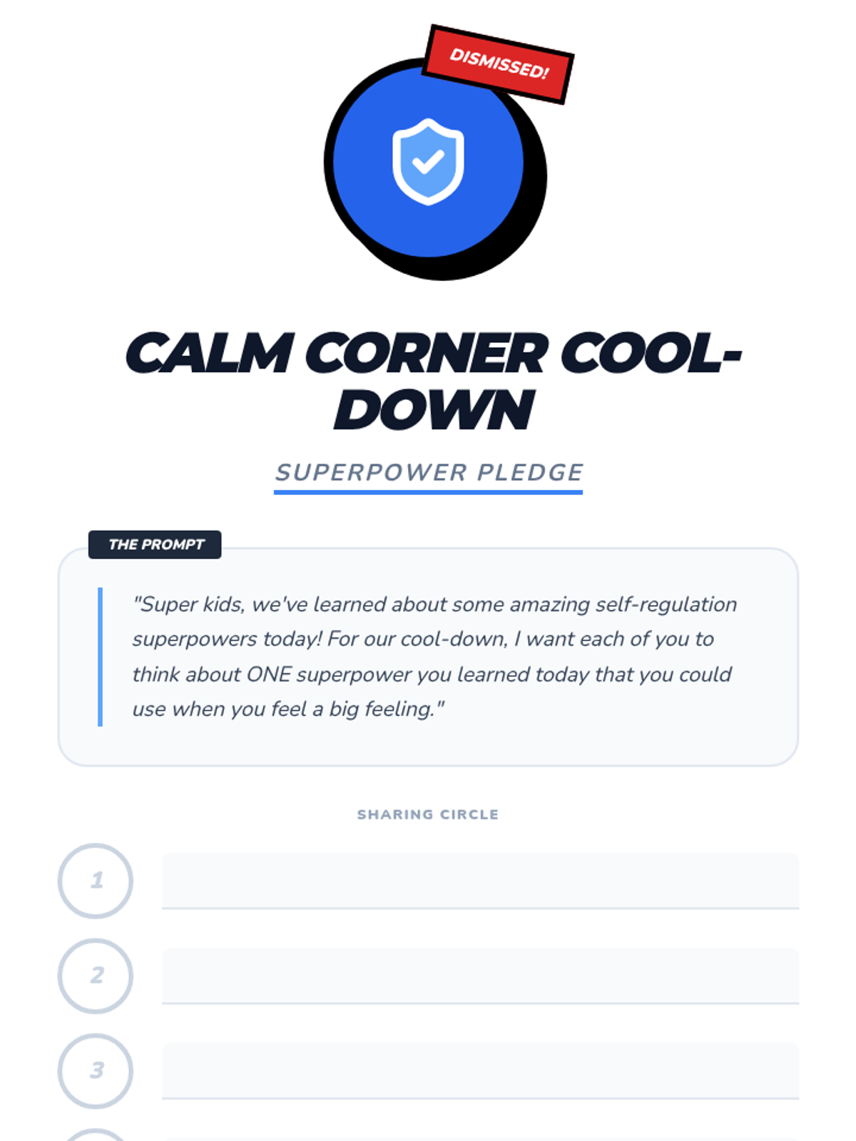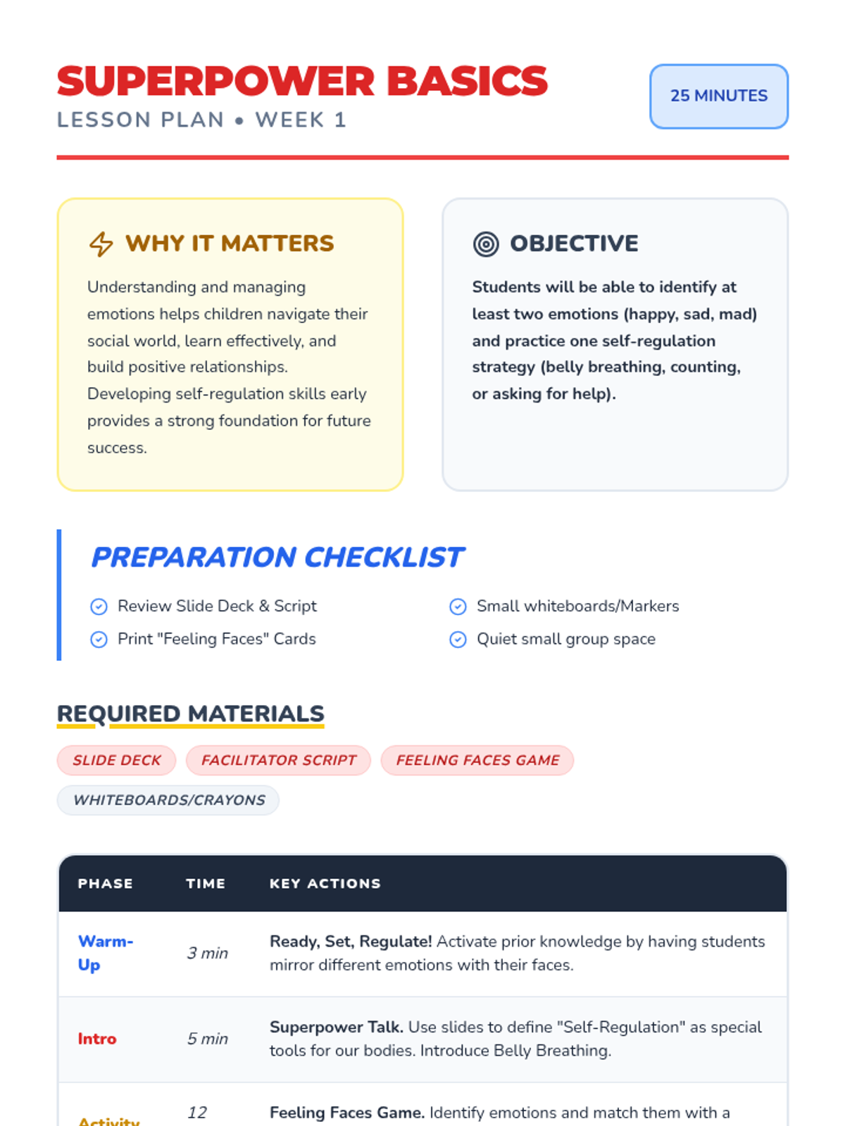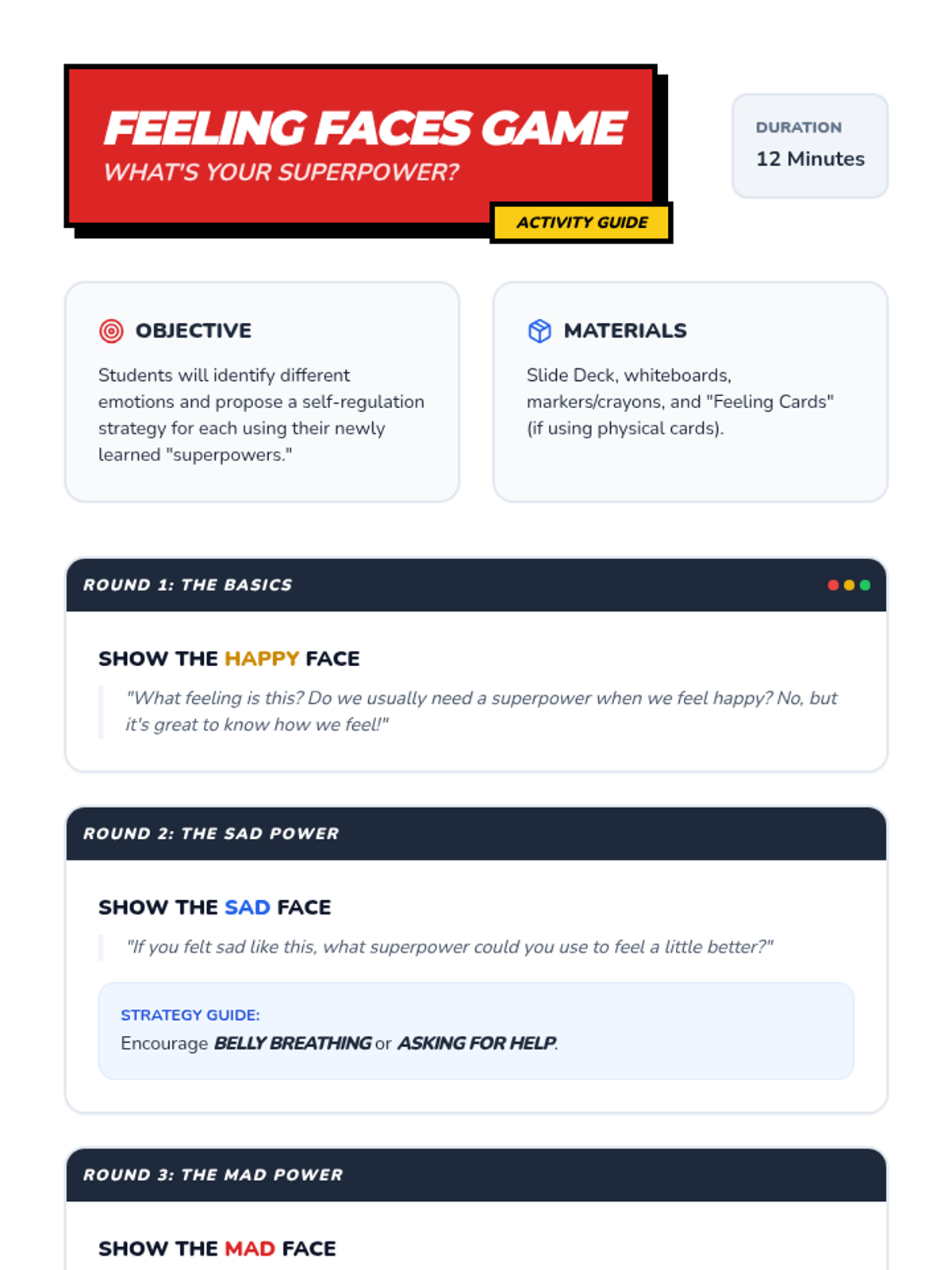 Introduce Kindergarten students to the concept of self-regulation through the metaphor of "superpowers." Students learn to identify basic emotions and practice initial calming strategies like belly breathing and counting.