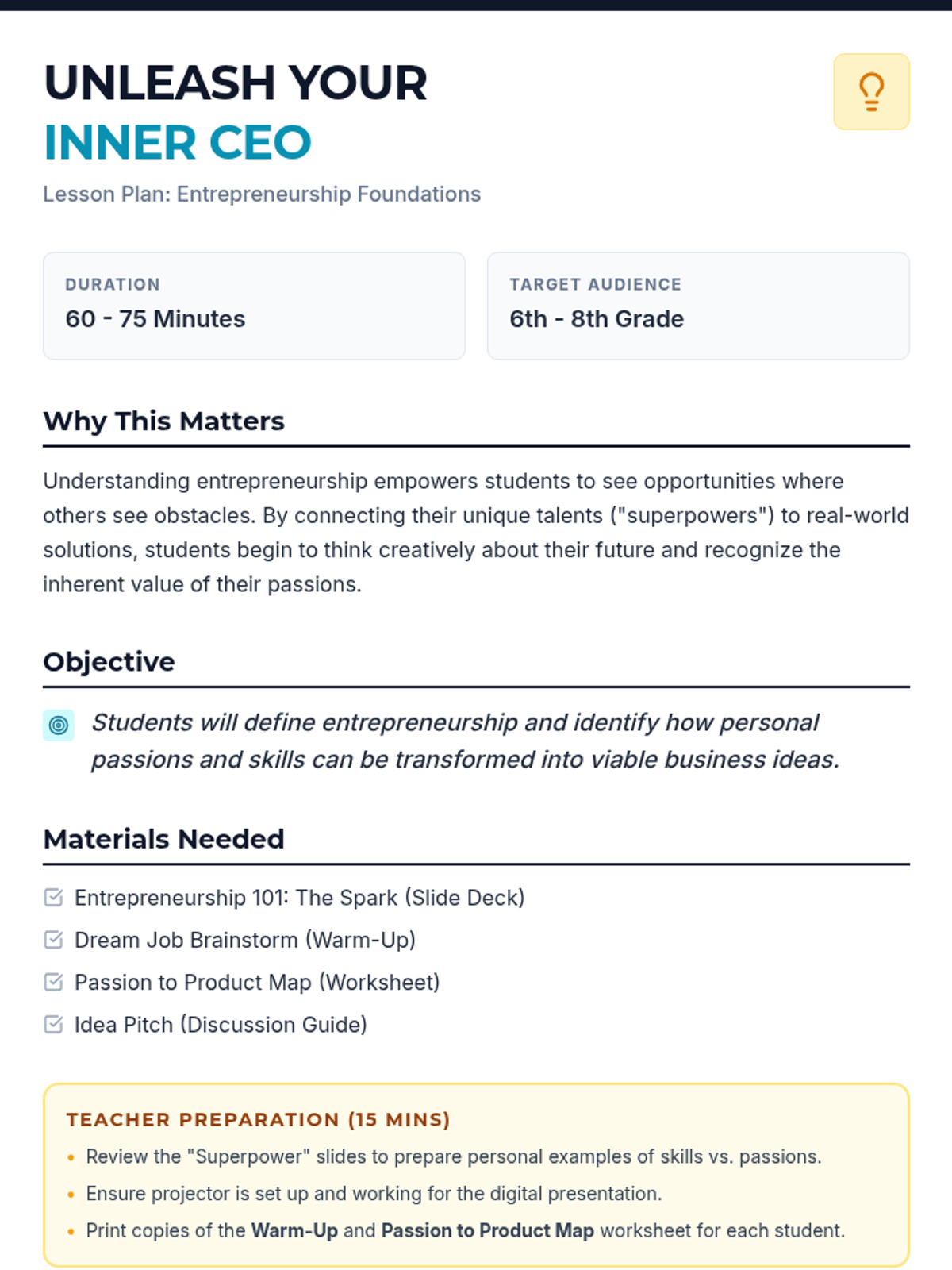 This lesson introduces 6th-8th grade students to entrepreneurship by connecting their personal 'superpowers' (skills and passions) to innovative business ideas. Students will define entrepreneurship, explore famous examples, and map out their own unique product or service concept.