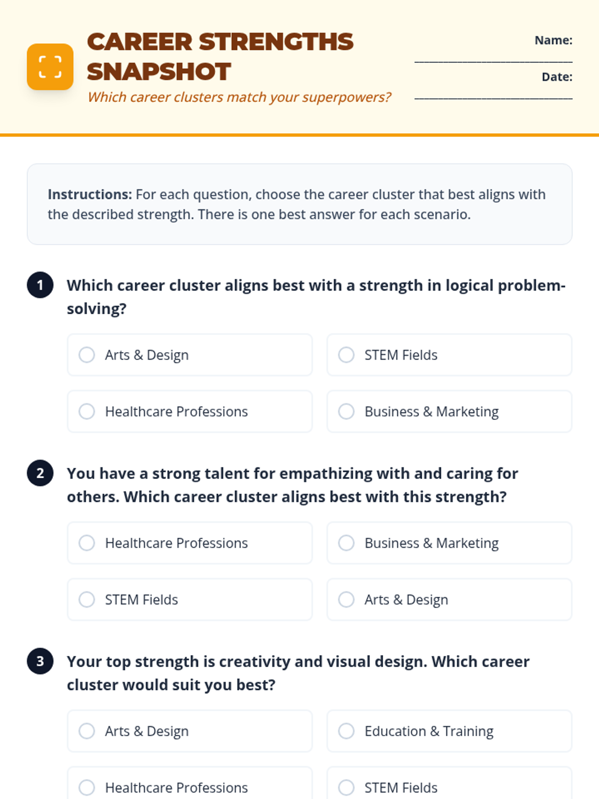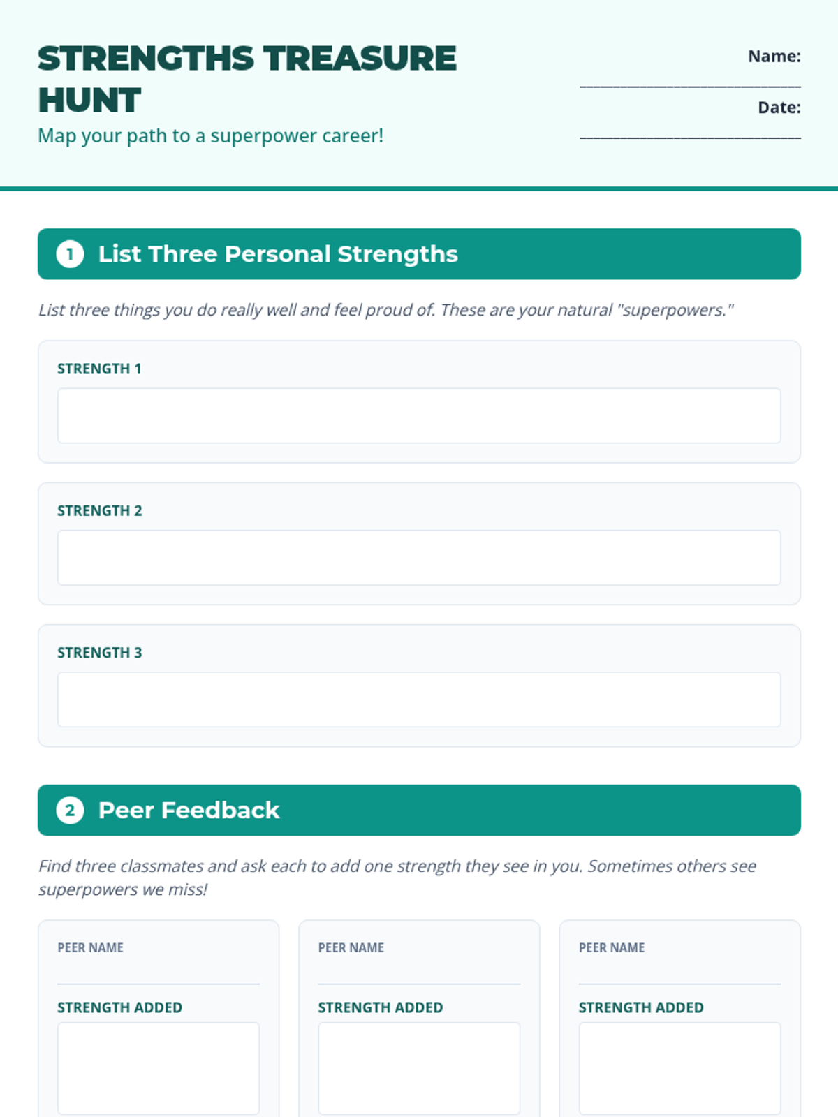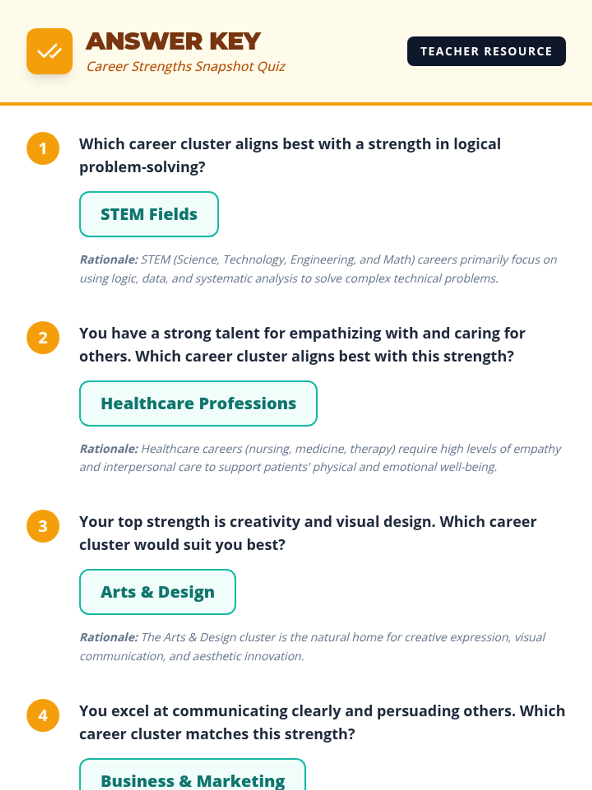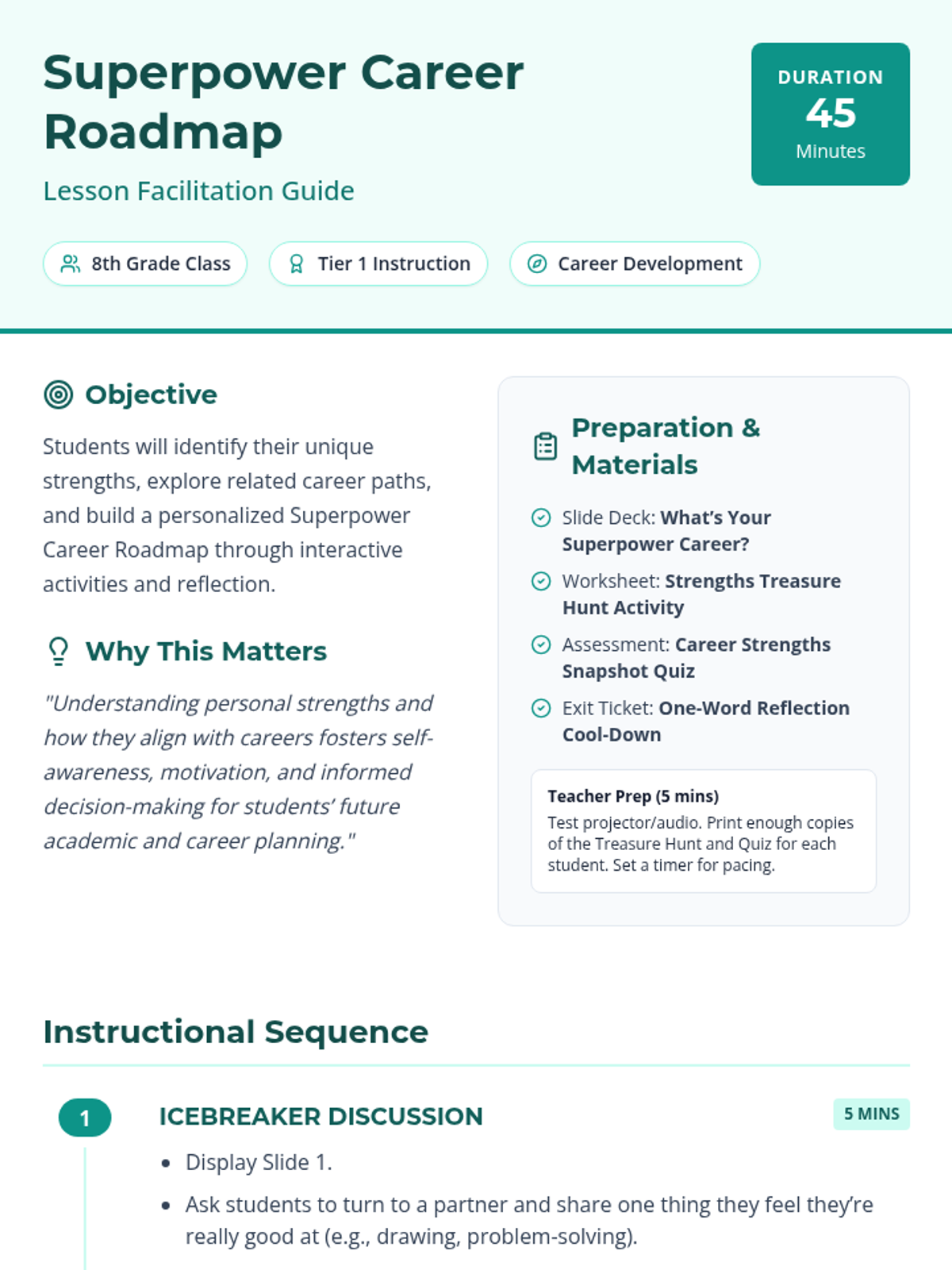 A 45-minute Tier 1 lesson for 8th graders to identify their personal strengths and explore matching career clusters through interactive activities.