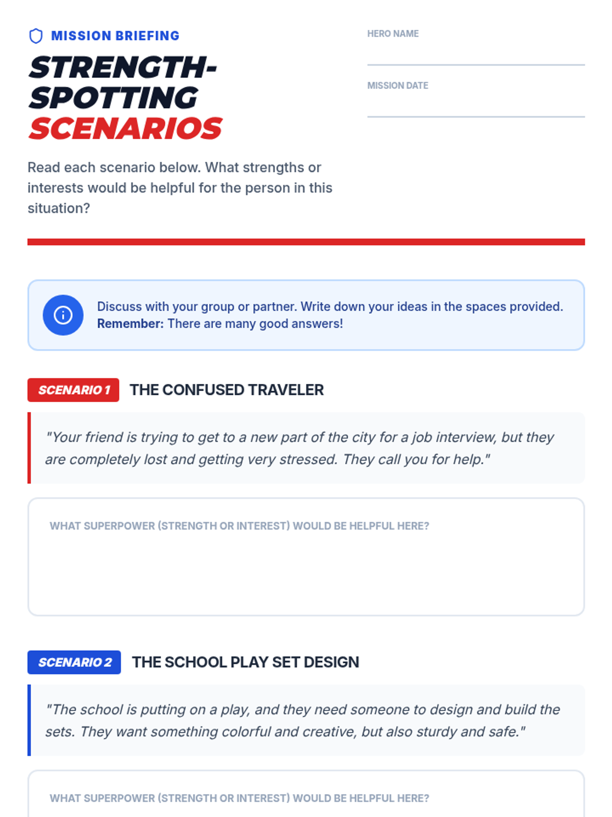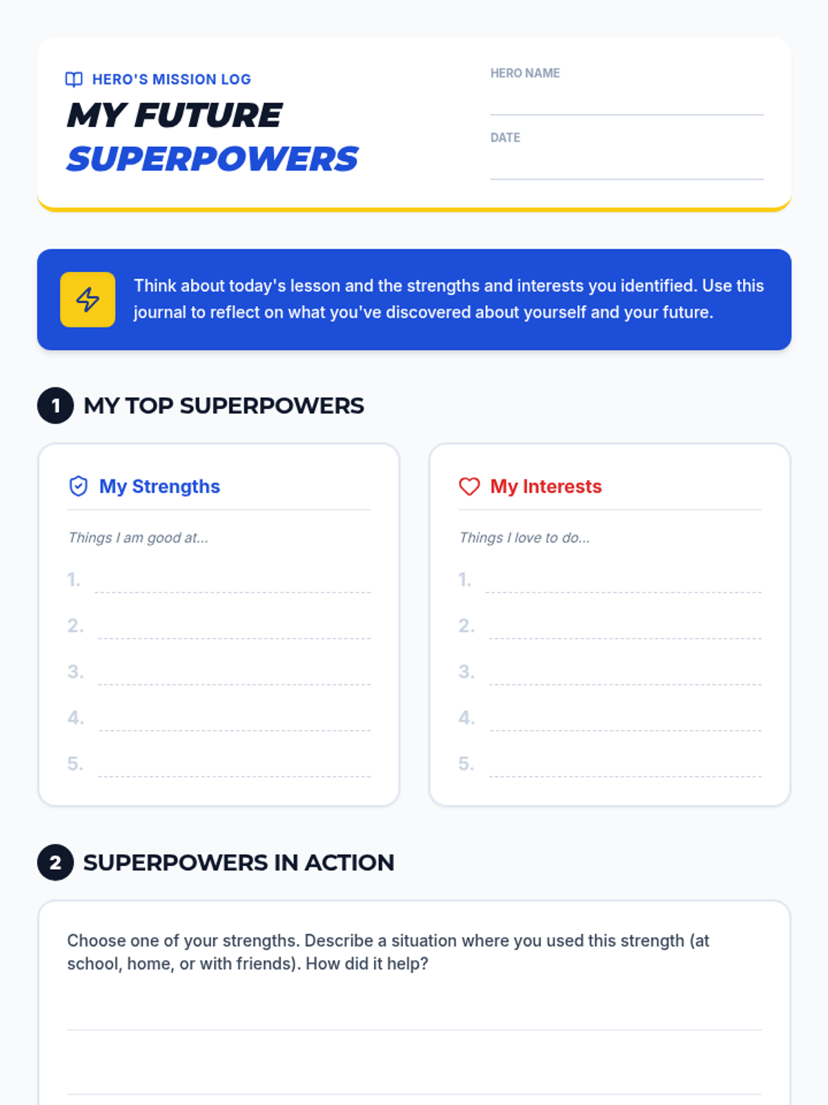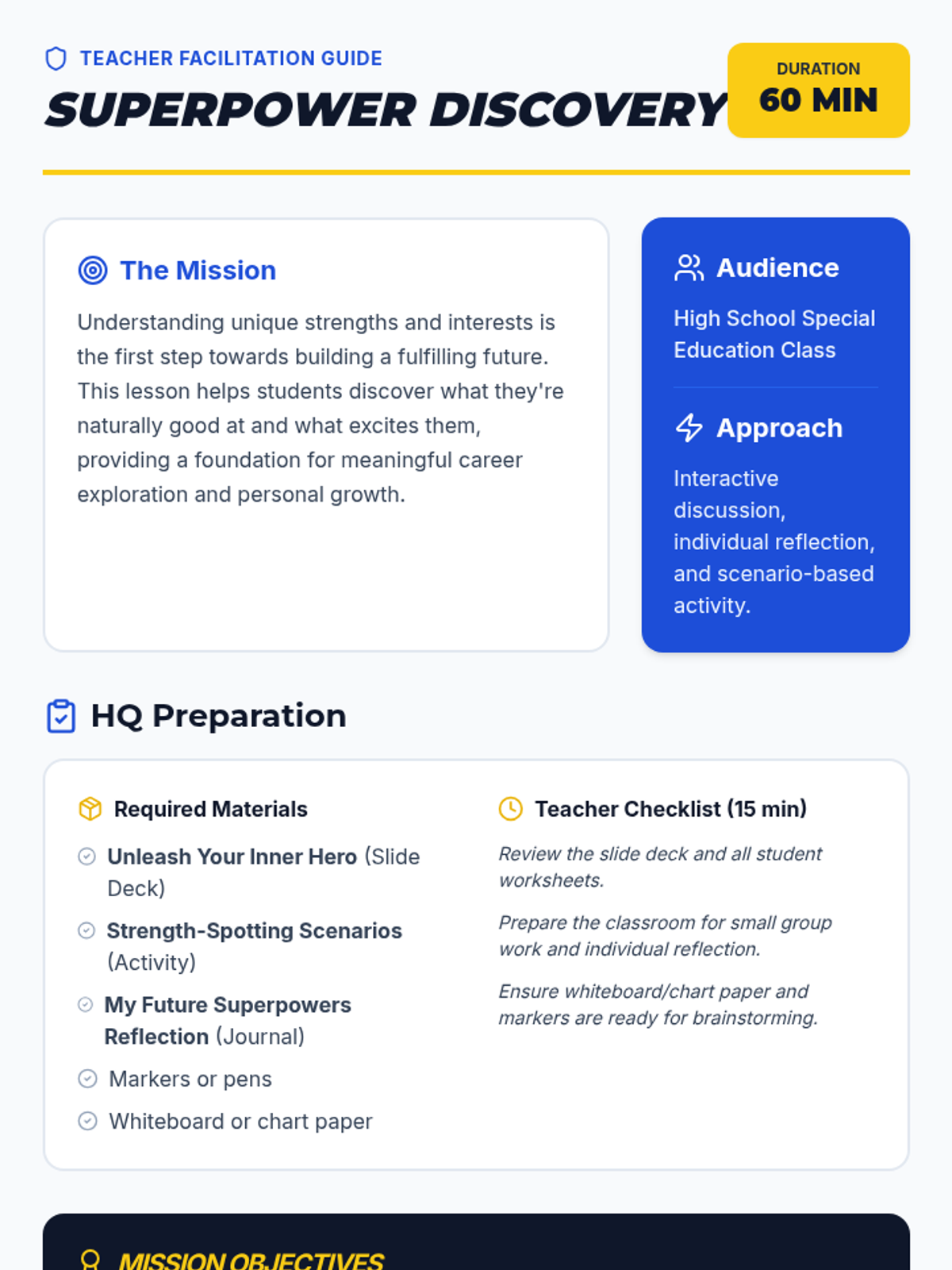 A career exploration lesson for high school special education students focused on identifying personal strengths and interests as 'superpowers' and connecting them to future career paths.