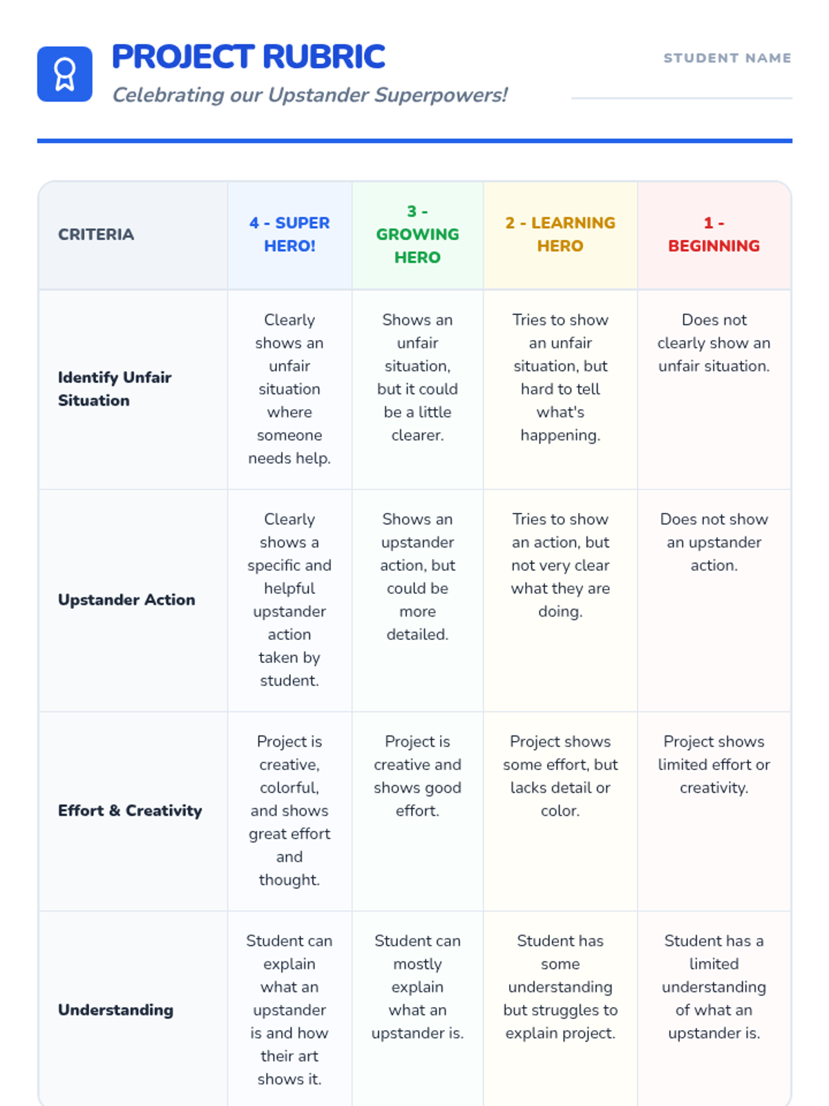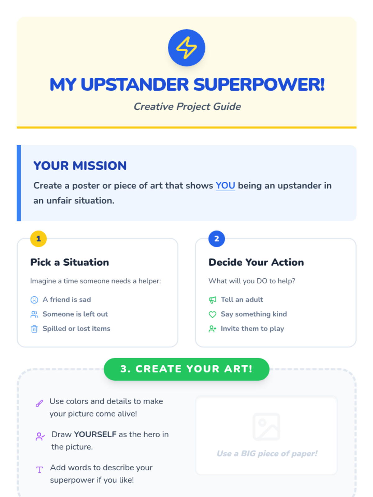 The unit culminates in a creative art project where students illustrate themselves using their upstander superpowers to help others.