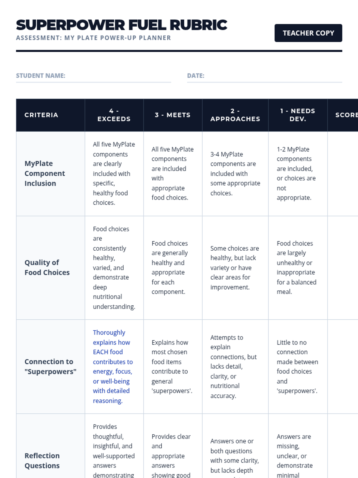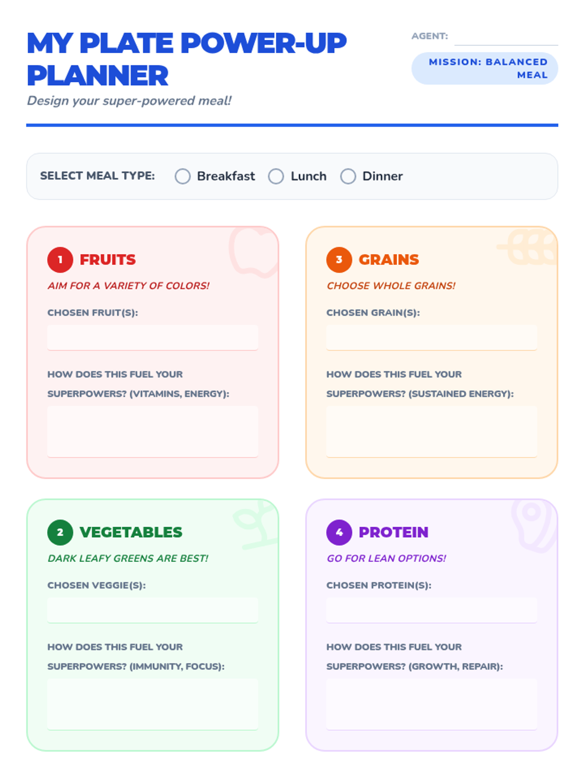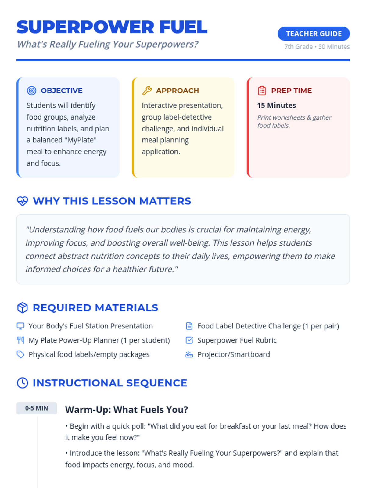A 50-minute nutrition lesson for 7th graders that connects food choices to personal 'superpowers' like energy and focus. Students analyze food labels and design a balanced meal using the MyPlate model.
