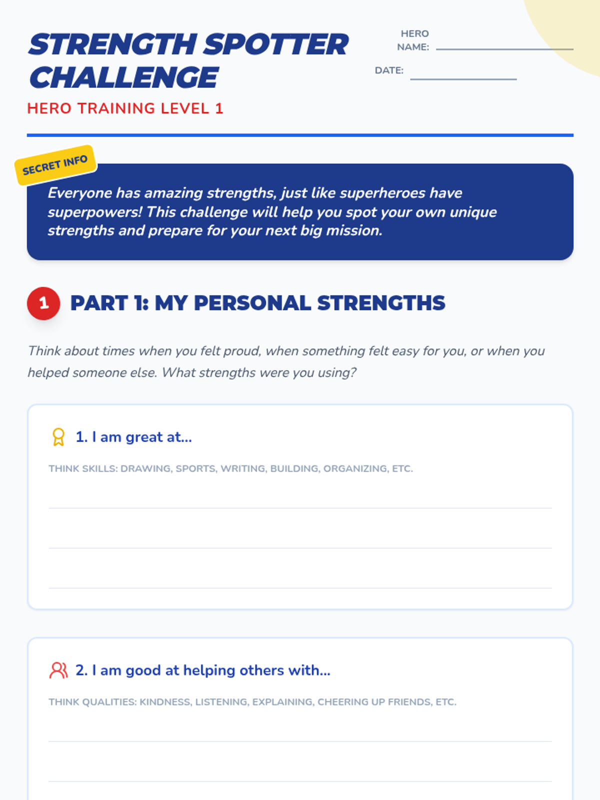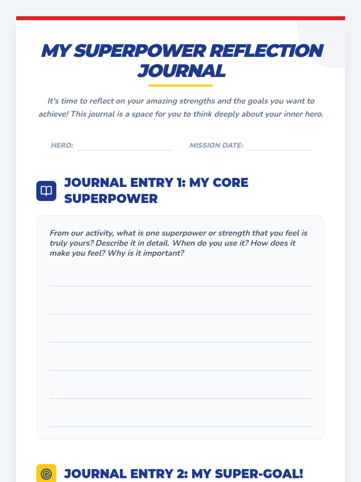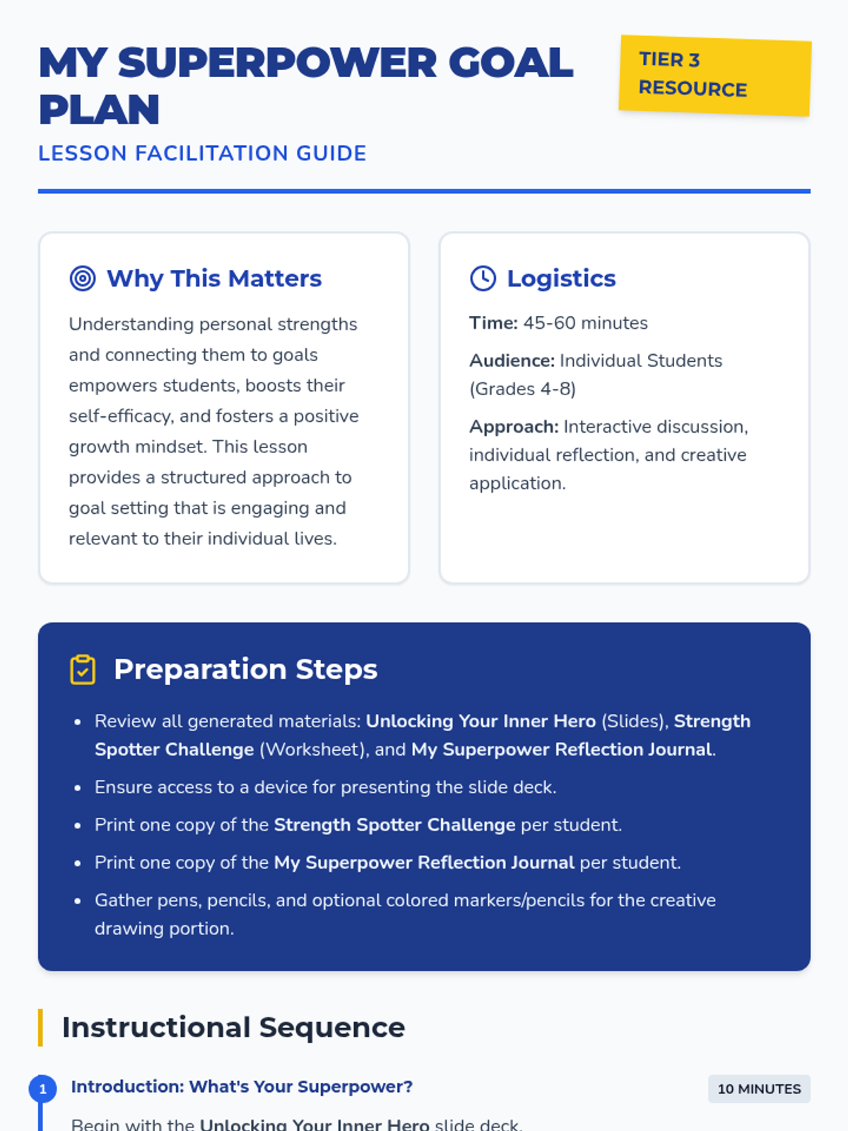 A Tier 3 individual lesson designed to help students identify their personal strengths and connect them to achievable goals through a superhero-themed framework. This 45-60 minute lesson fosters self-efficacy and a growth mindset in students grades 4-8.