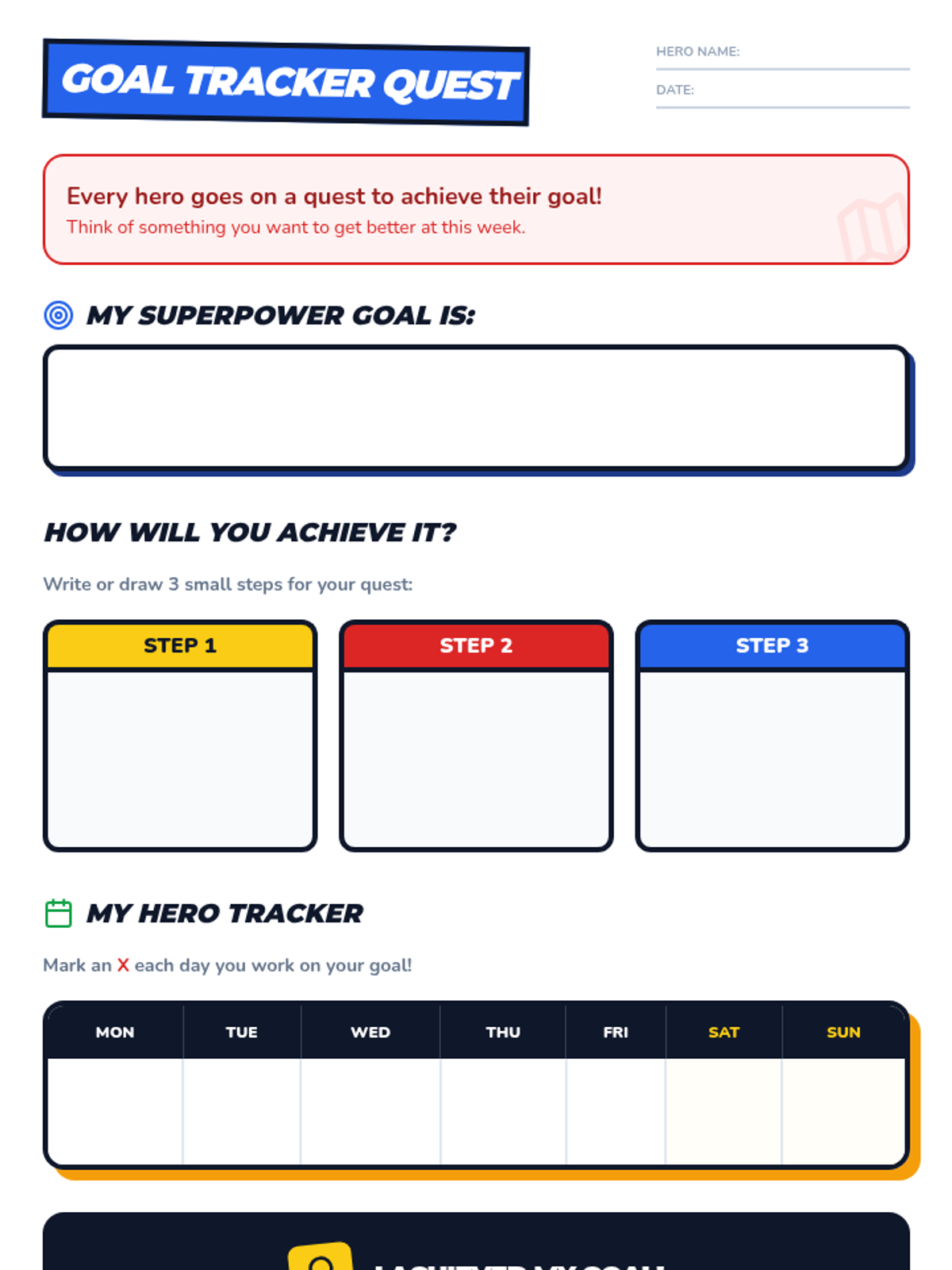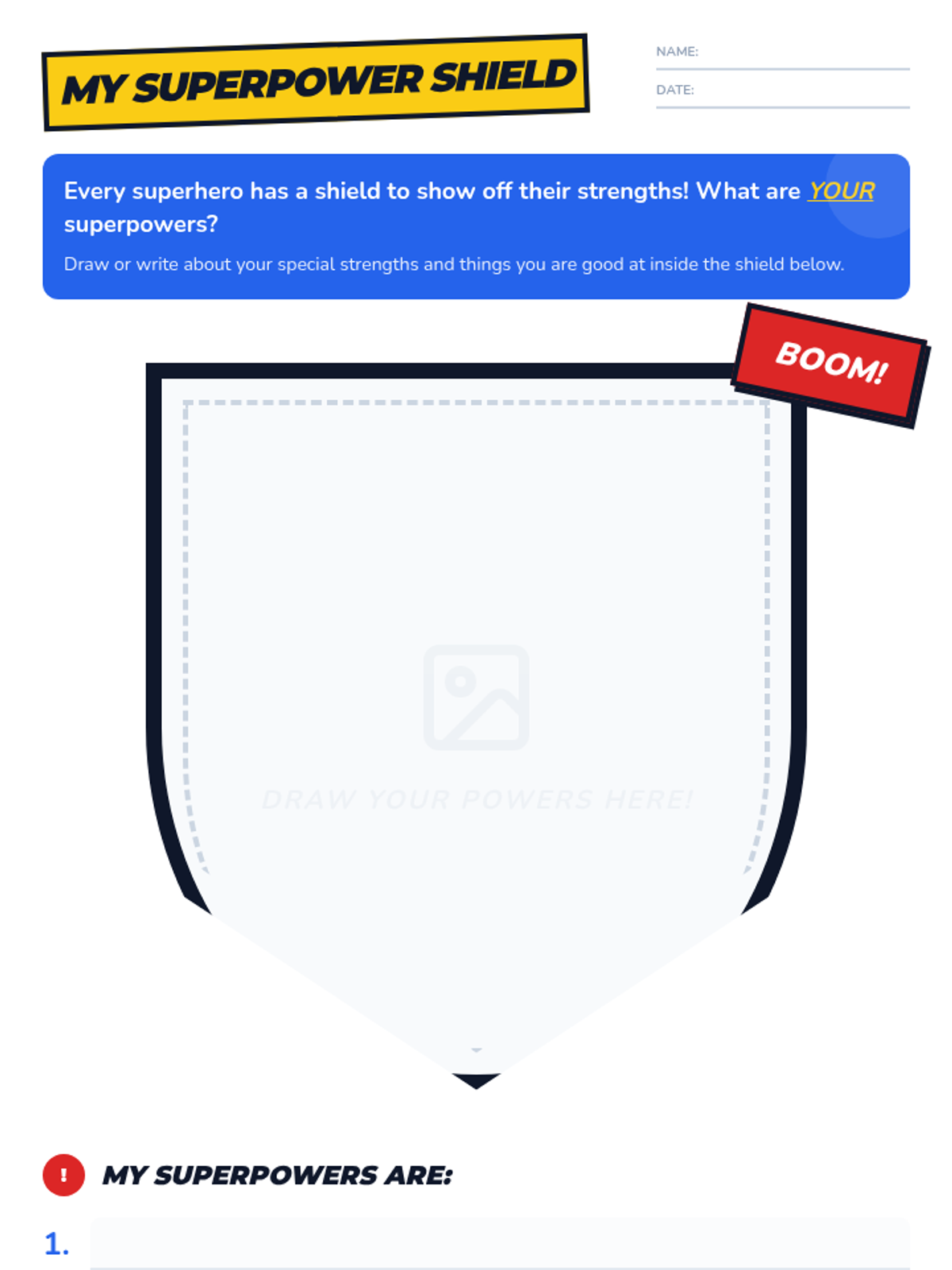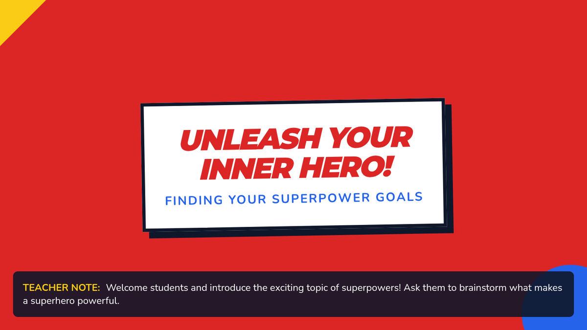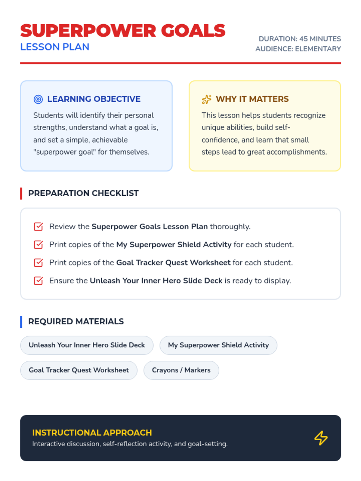 This lesson helps young students identify their personal strengths and set simple, achievable goals through a superhero-themed lens. Students will create their own 'Superpower Shield' and a 'Goal Tracker Quest' to build self-efficacy.
