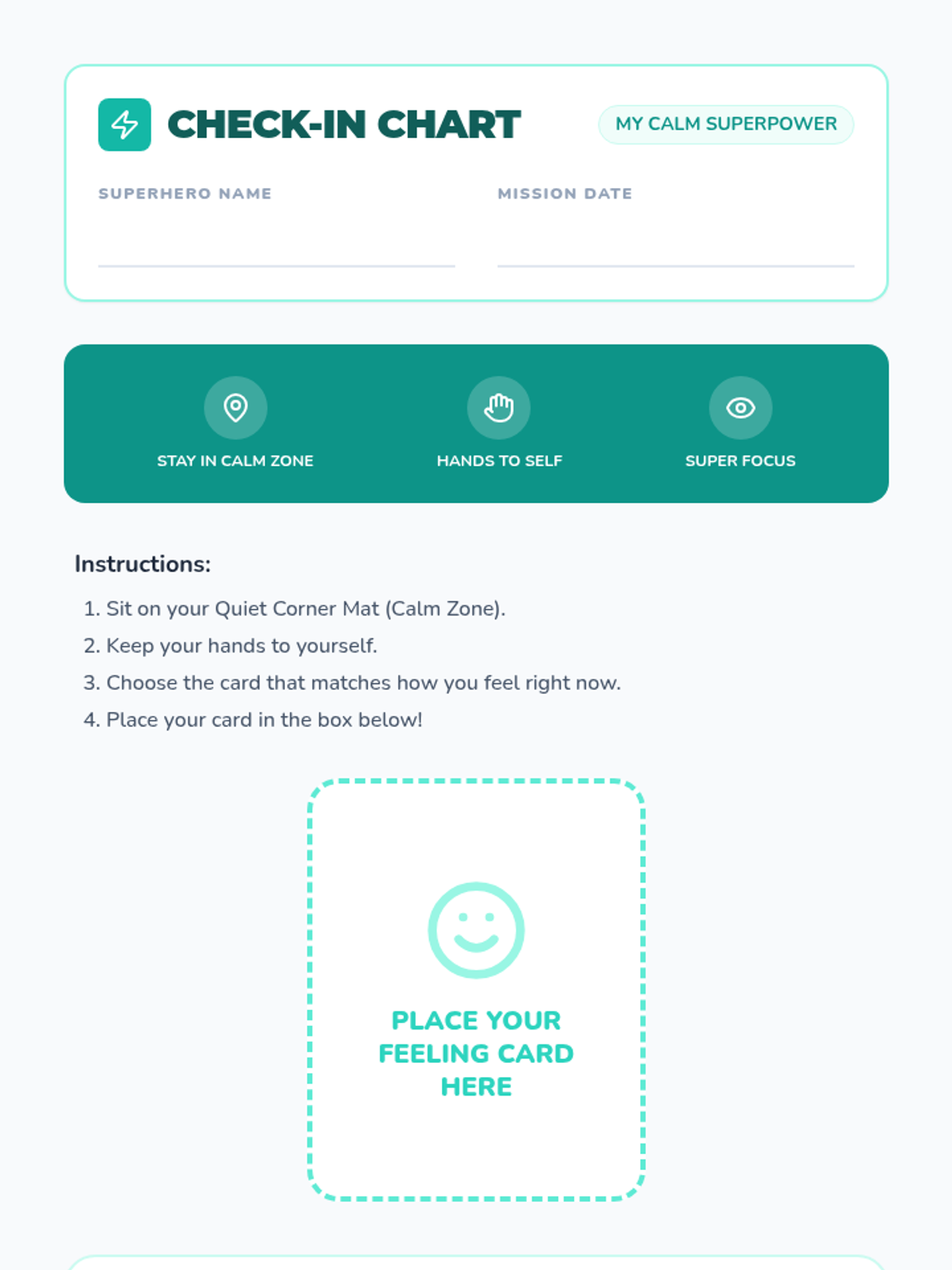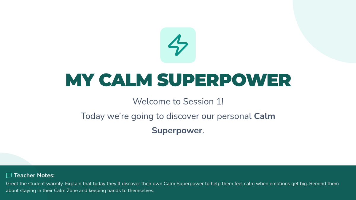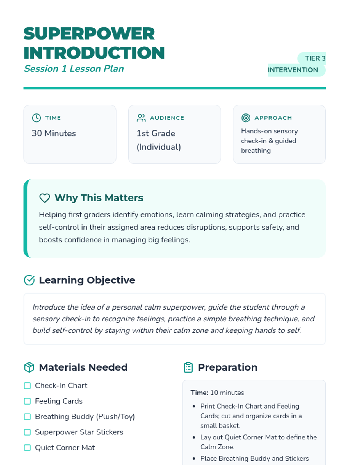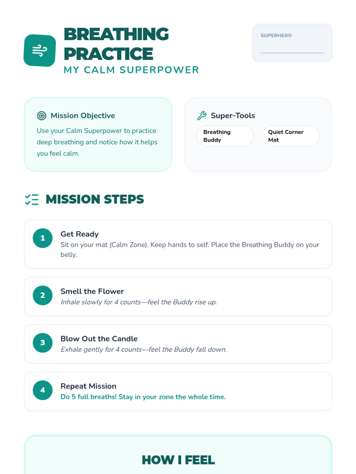 The first session of the My Calm Superpower program, introducing 1st graders to their internal 'Calm Superpower' through sensory check-ins and belly breathing with a Breathing Buddy.
