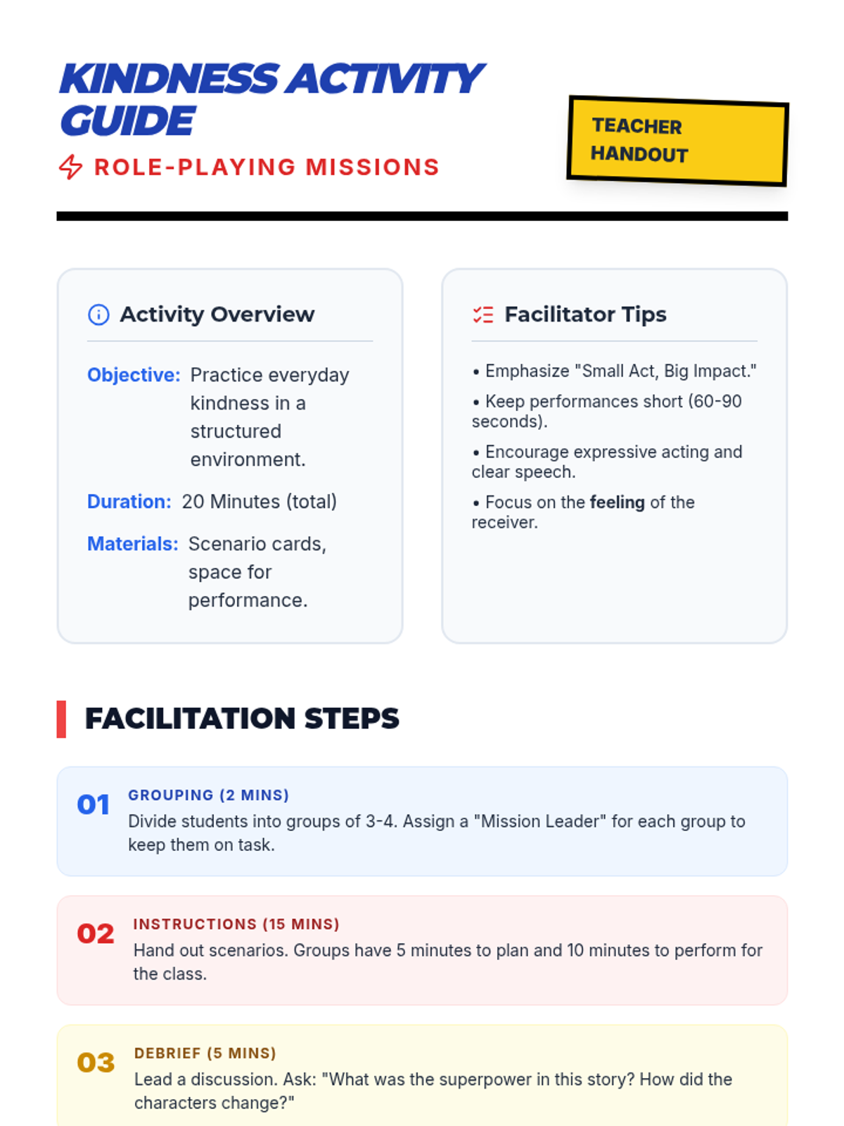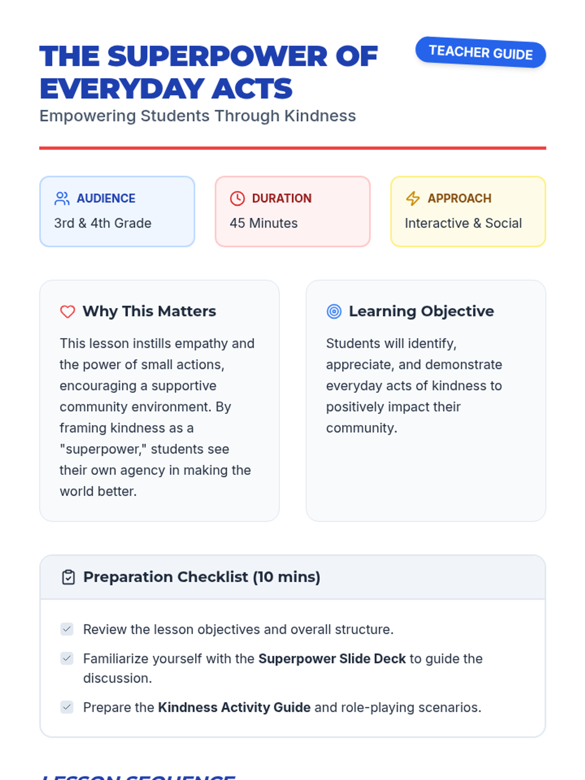 A 45-minute lesson for 3rd and 4th graders that frames everyday kindness as a "superpower," using role-playing and discussion to build community empathy.