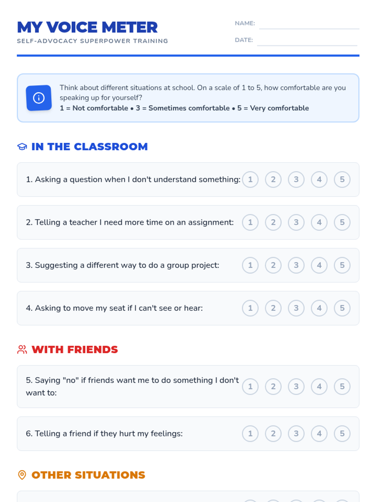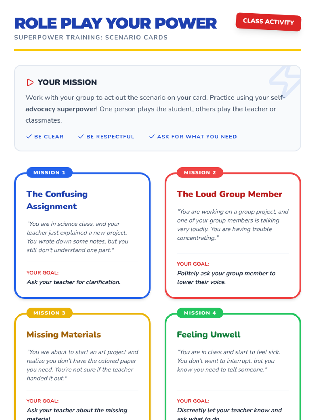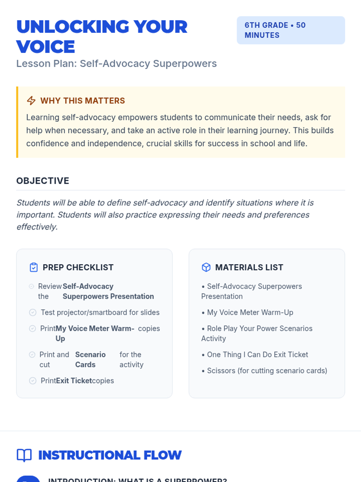 A 50-minute Tier 3 intervention lesson designed to help 6th graders discover self-advocacy as their personal superpower, building confidence in expressing their needs.