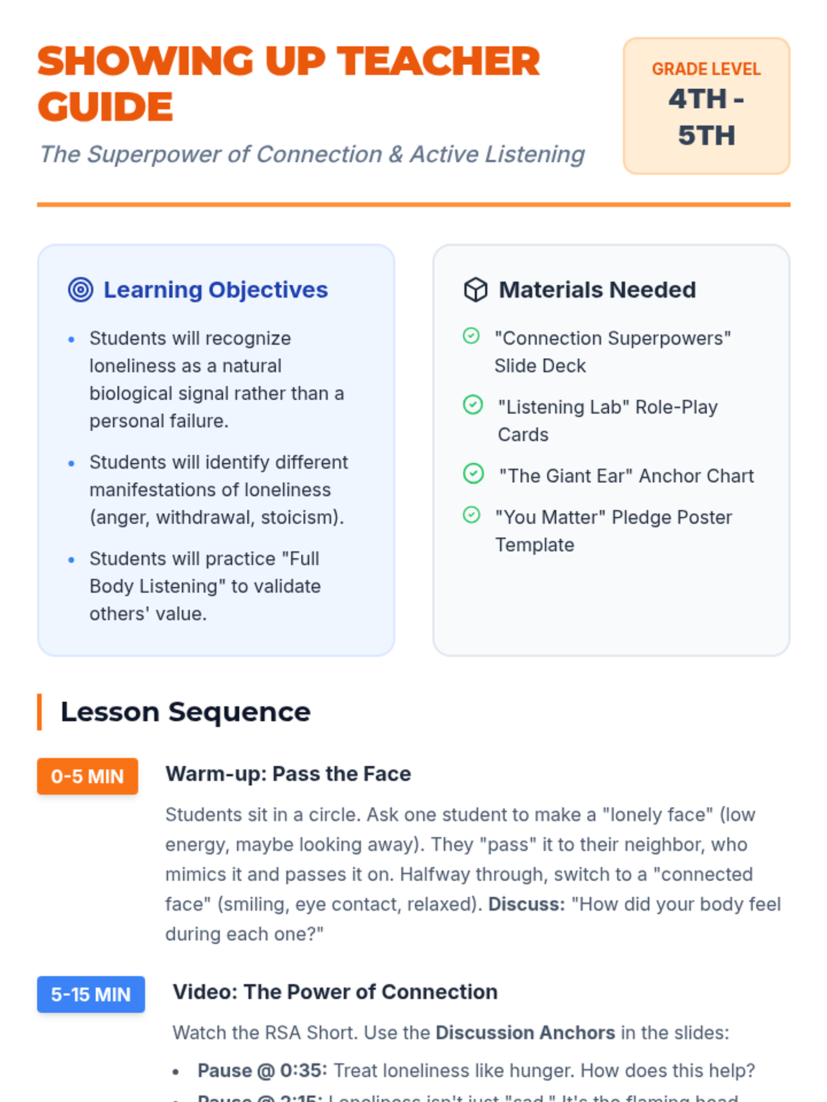 A lesson for grades 4-5 focused on understanding loneliness as a common human experience and developing the 'superpower' of connection through active listening and 'showing up' for others. Based on Vivek Murthy's insights, it transforms complex social-emotional concepts into actionable habits.