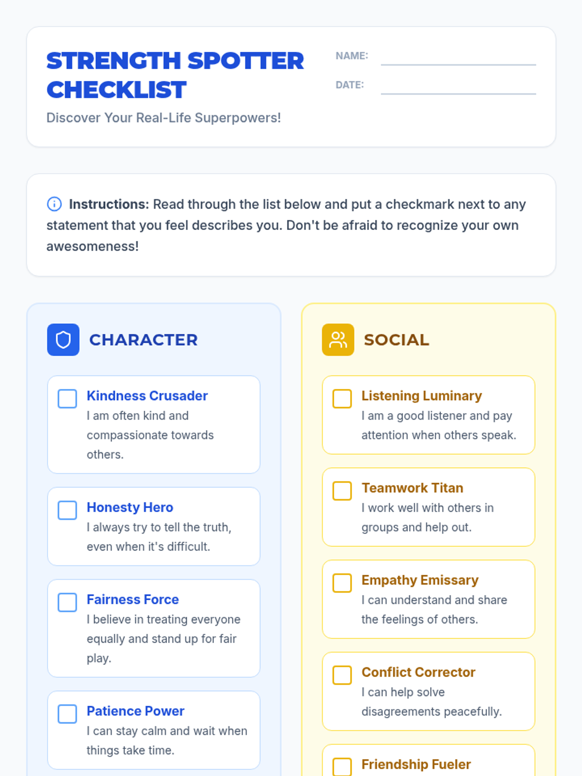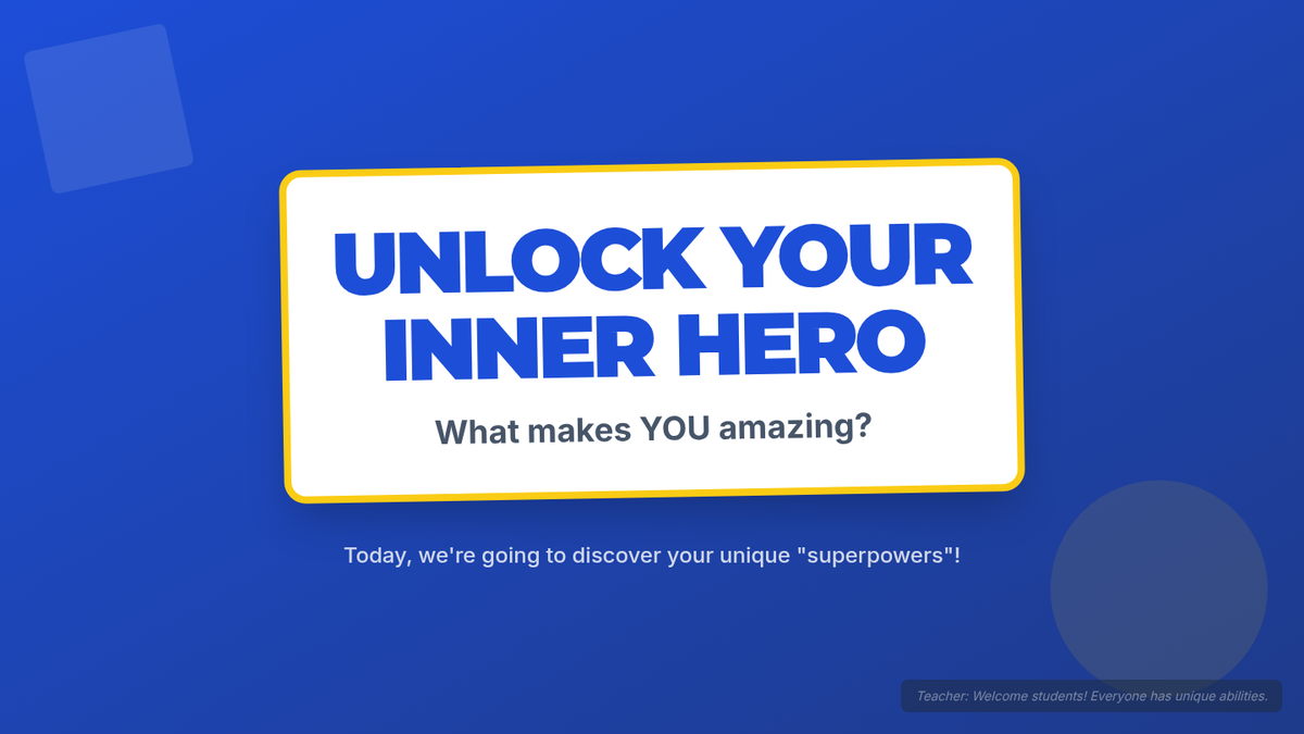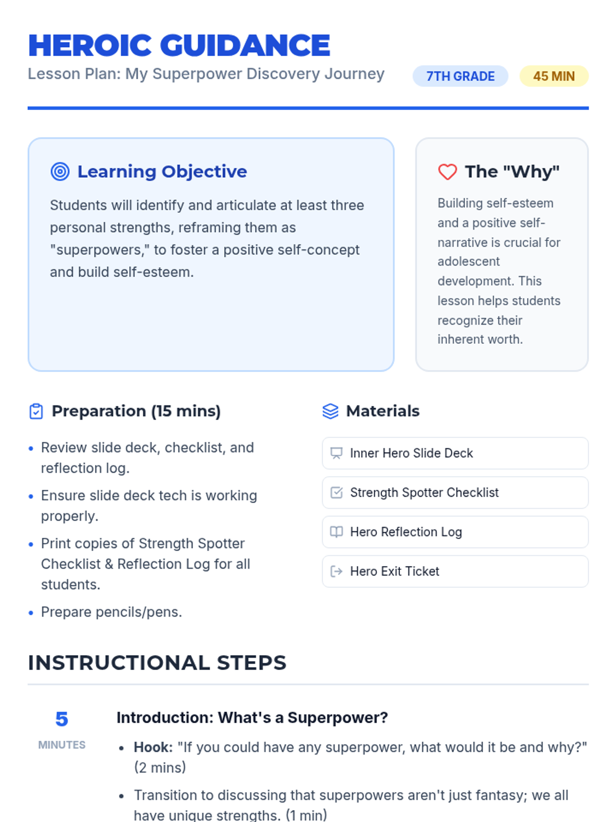 A lesson designed to help 7th-grade students identify their personal strengths and reframe them as 'superpowers' to build self-esteem and a positive self-narrative.
