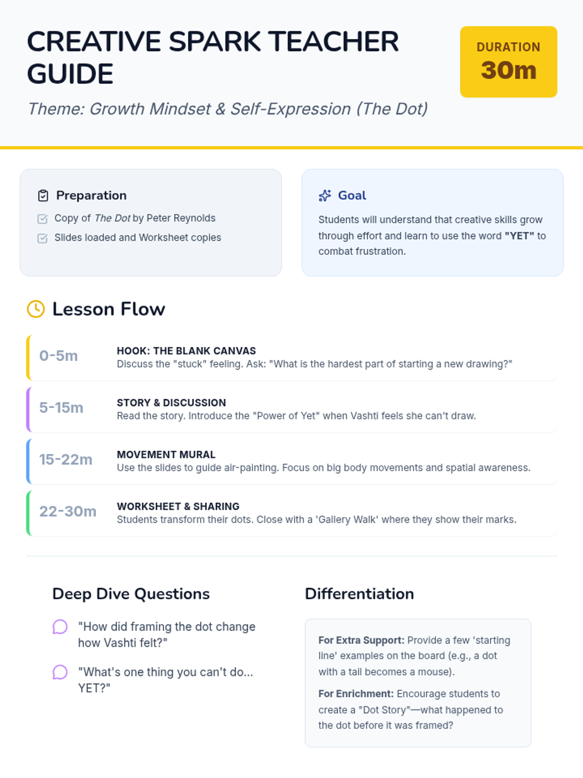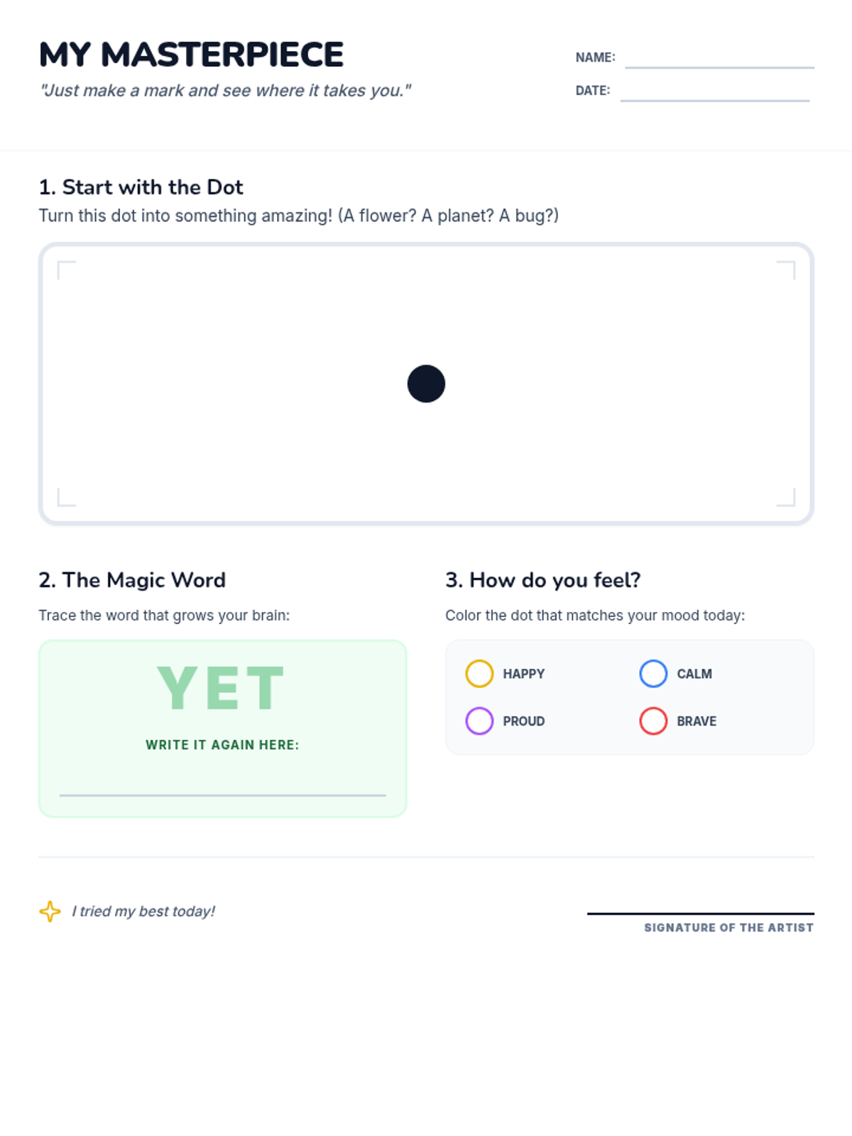 A 30-minute SEL lesson for 2nd graders centered on Peter Reynolds' 'The Dot.' Students explore growth mindset and self-expression through a guided story, a movement-based 'Mural' activity, and a creative drawing worksheet.