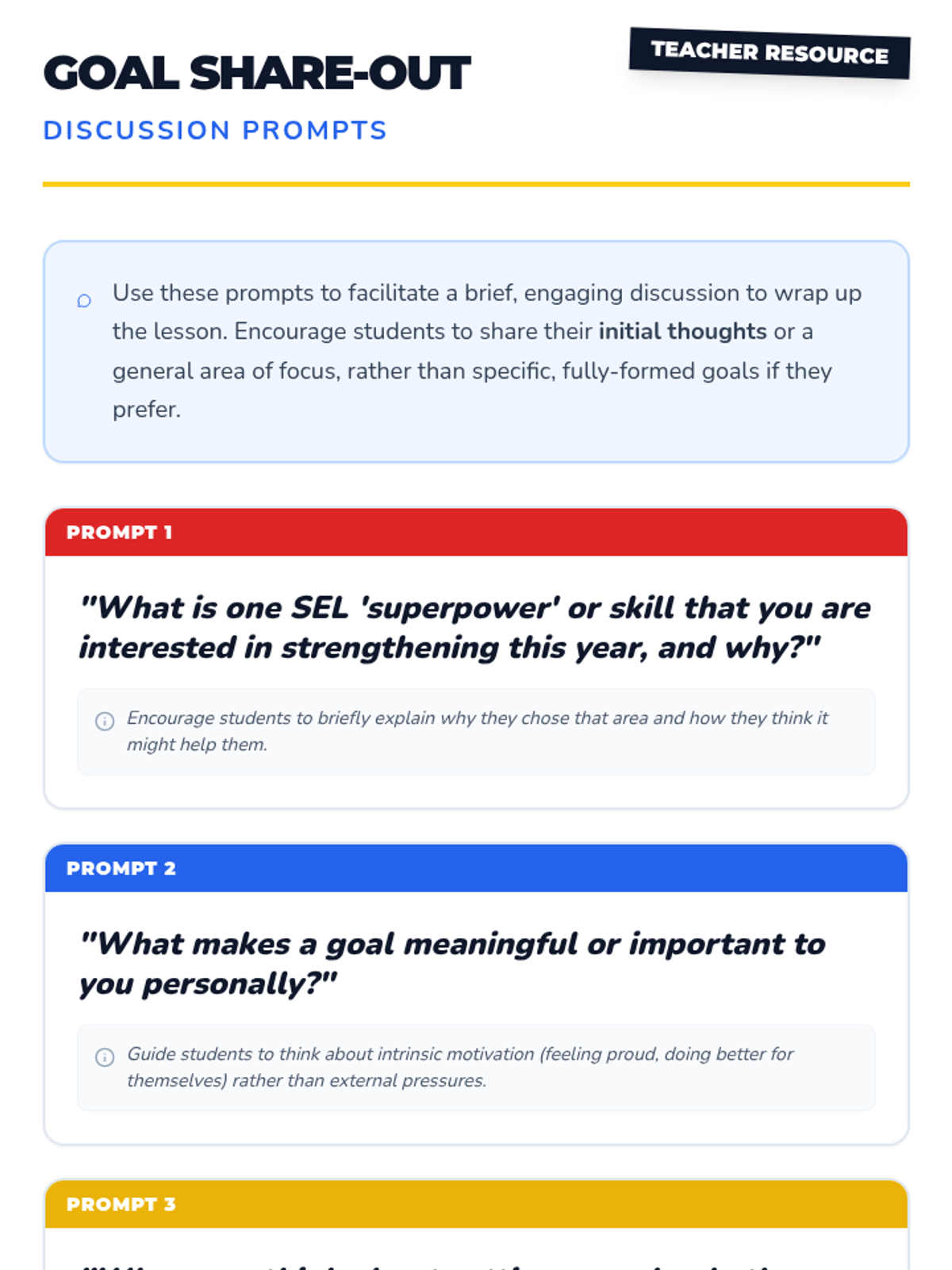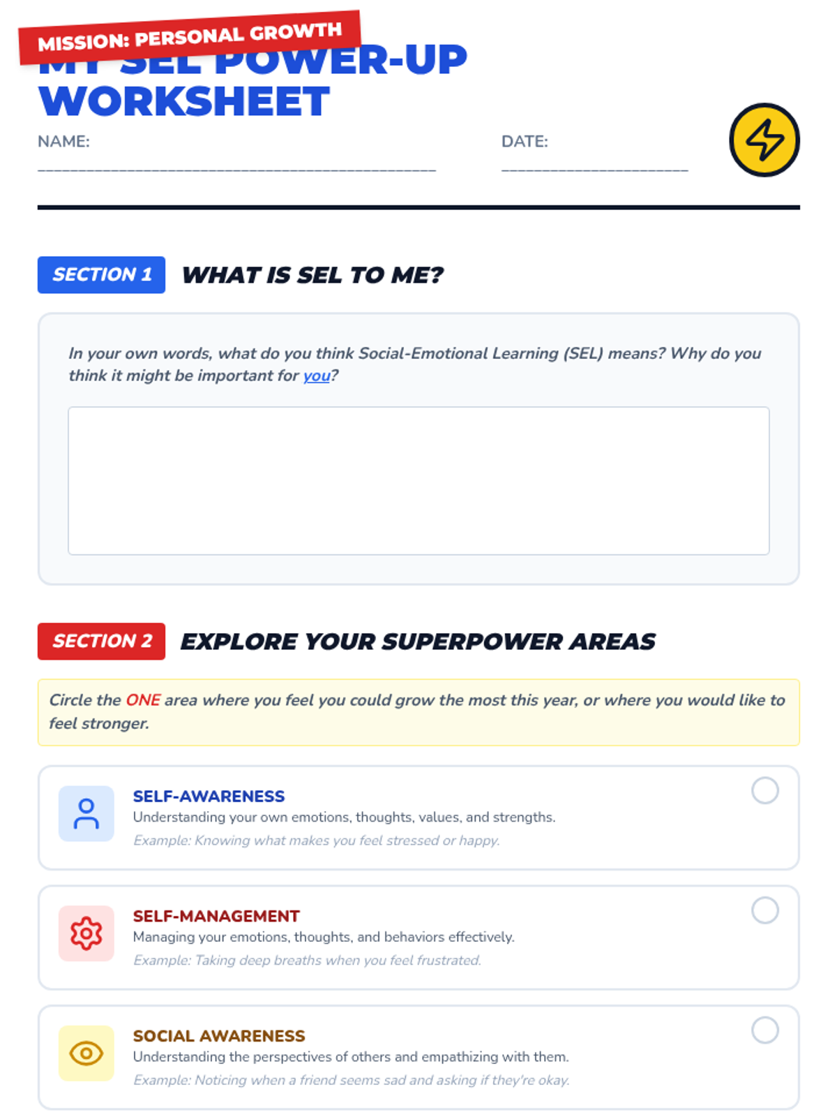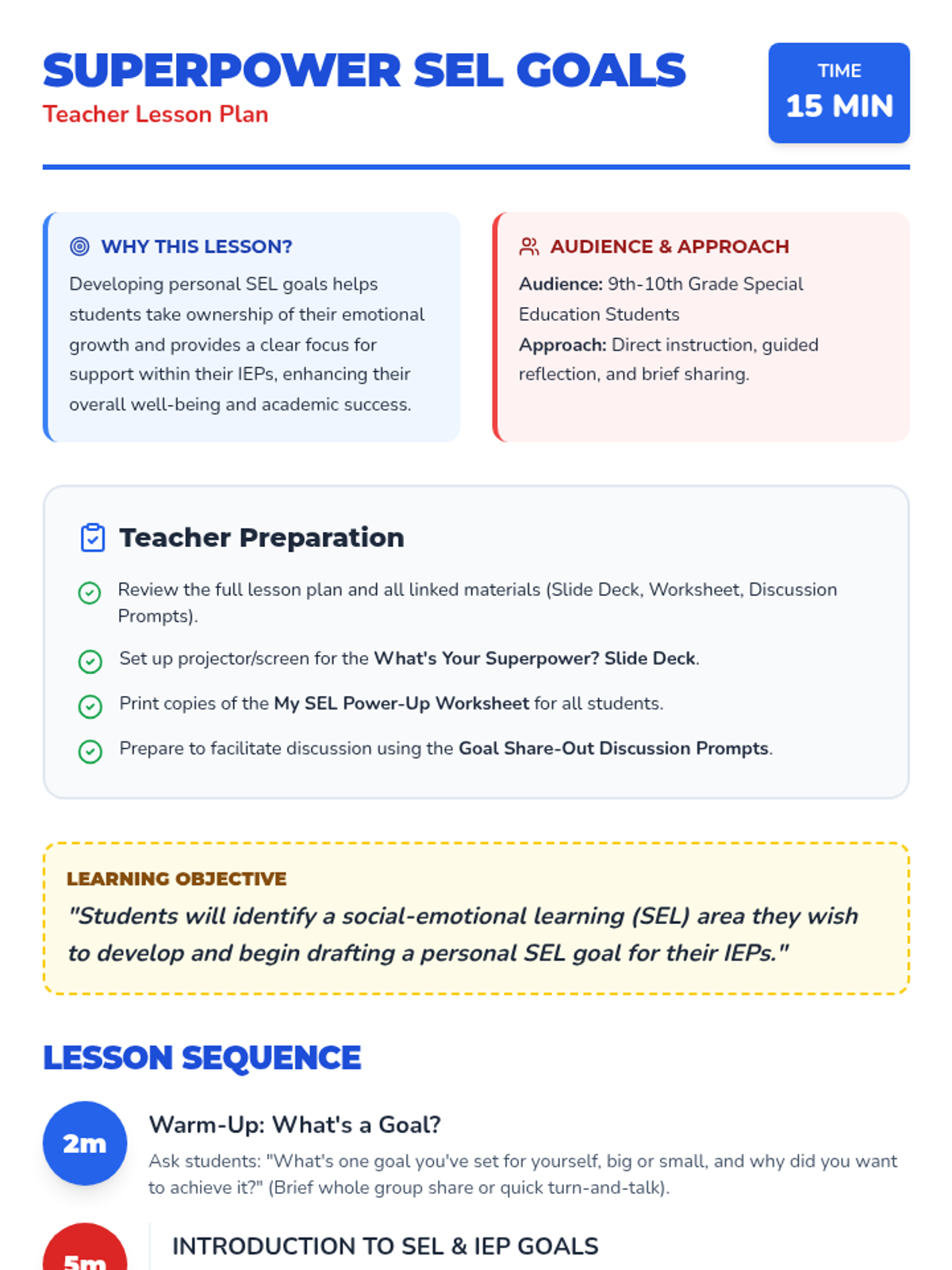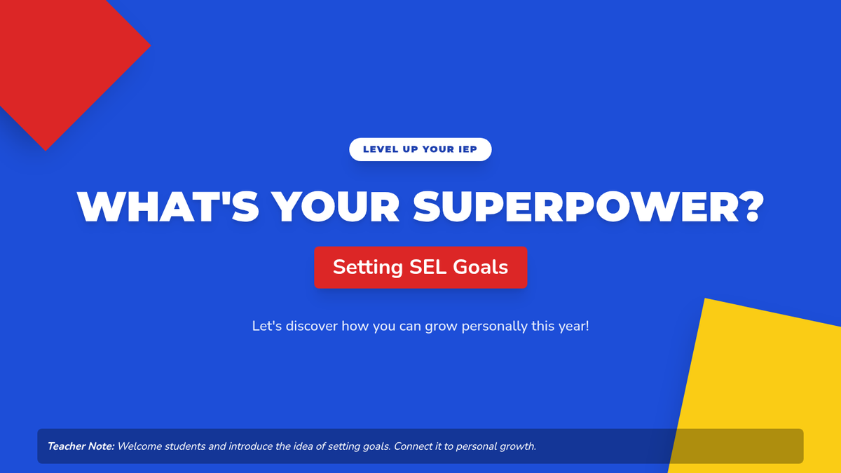 A 15-minute introductory lesson for 9th and 10th-grade special education students to identify and draft social-emotional learning (SEL) goals for their IEPs using a 'superpower' theme.