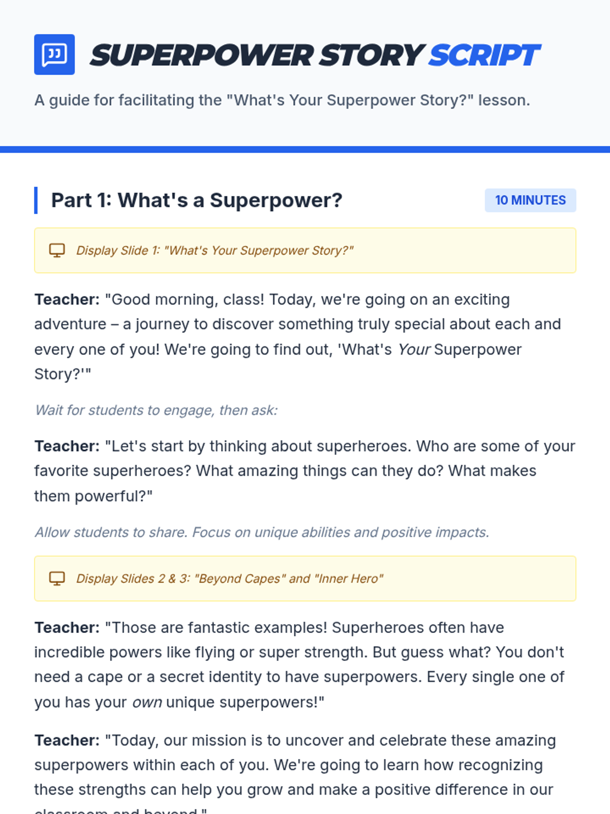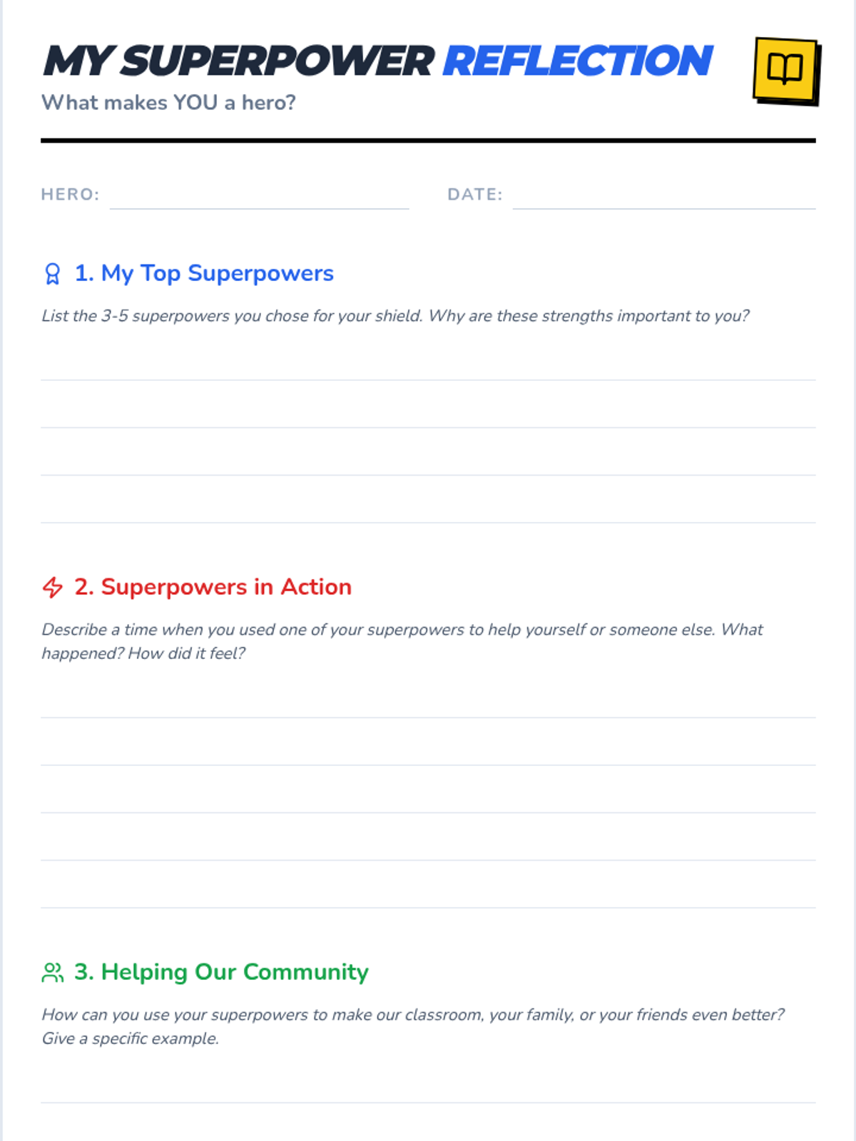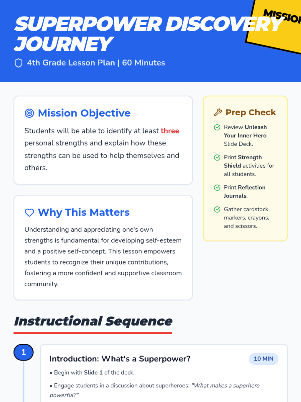 This lesson empowers 4th-grade students to identify and celebrate their unique personal strengths, or 'superpowers,' through creative shield-making and reflective journaling. Students explore how their individual qualities contribute to a positive classroom community and personal growth.