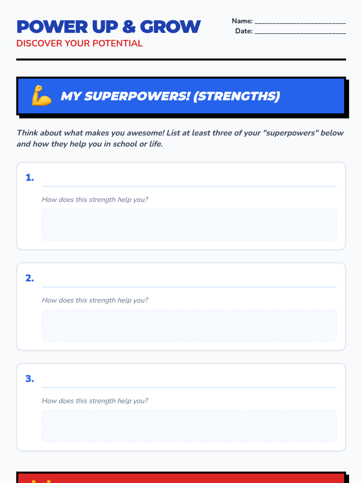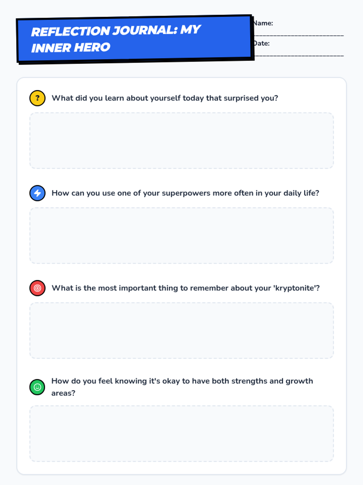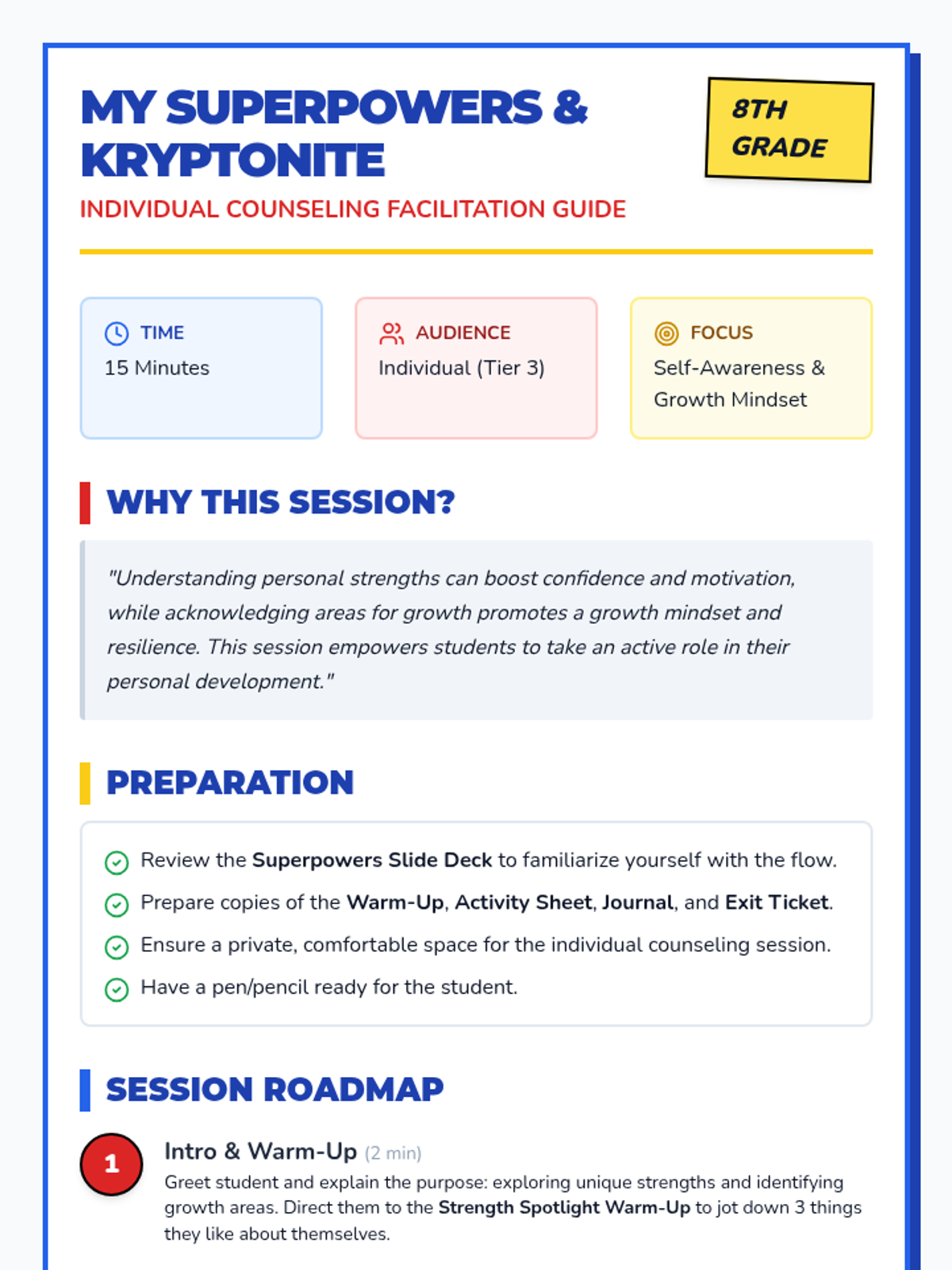 A 15-minute individual counseling session for 8th graders focused on identifying personal strengths (superpowers) and areas for growth (kryptonite) to build self-esteem and a growth mindset.