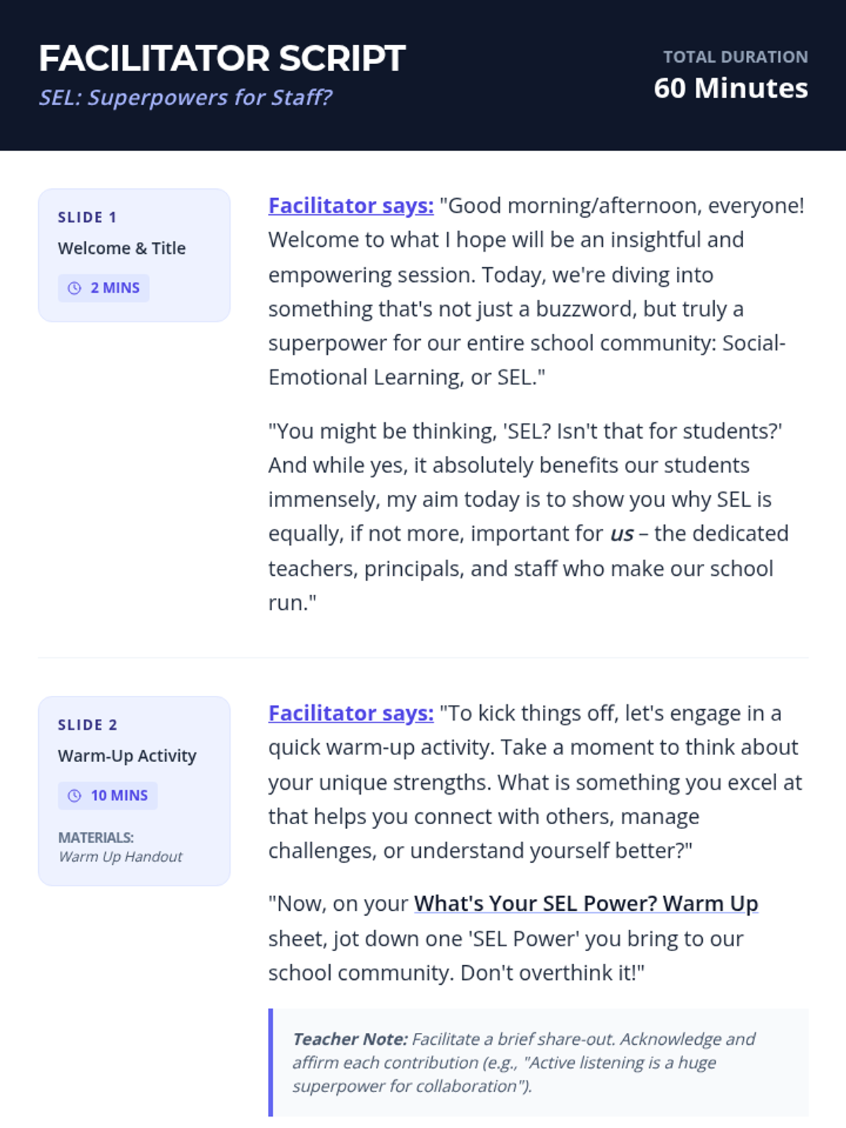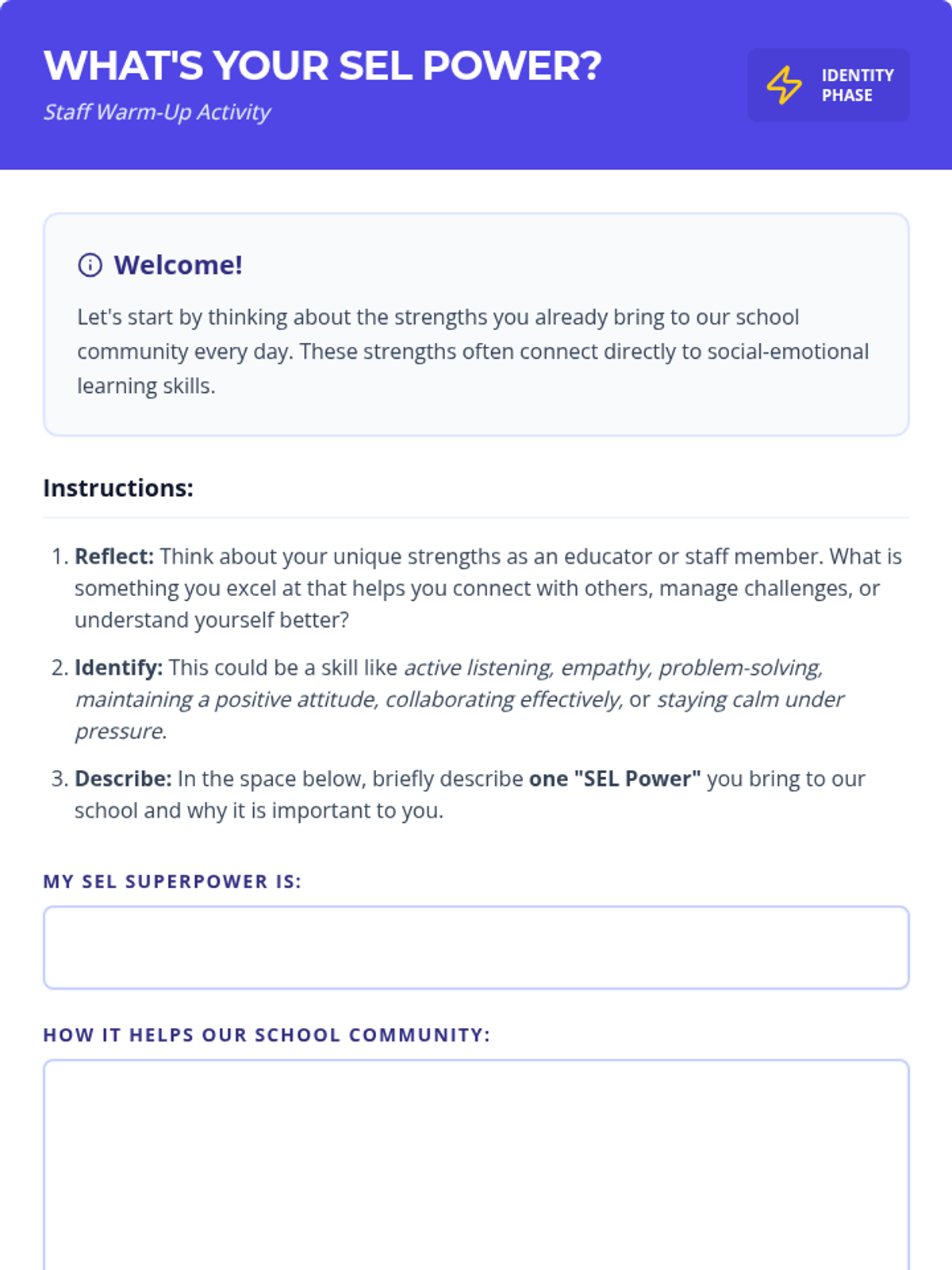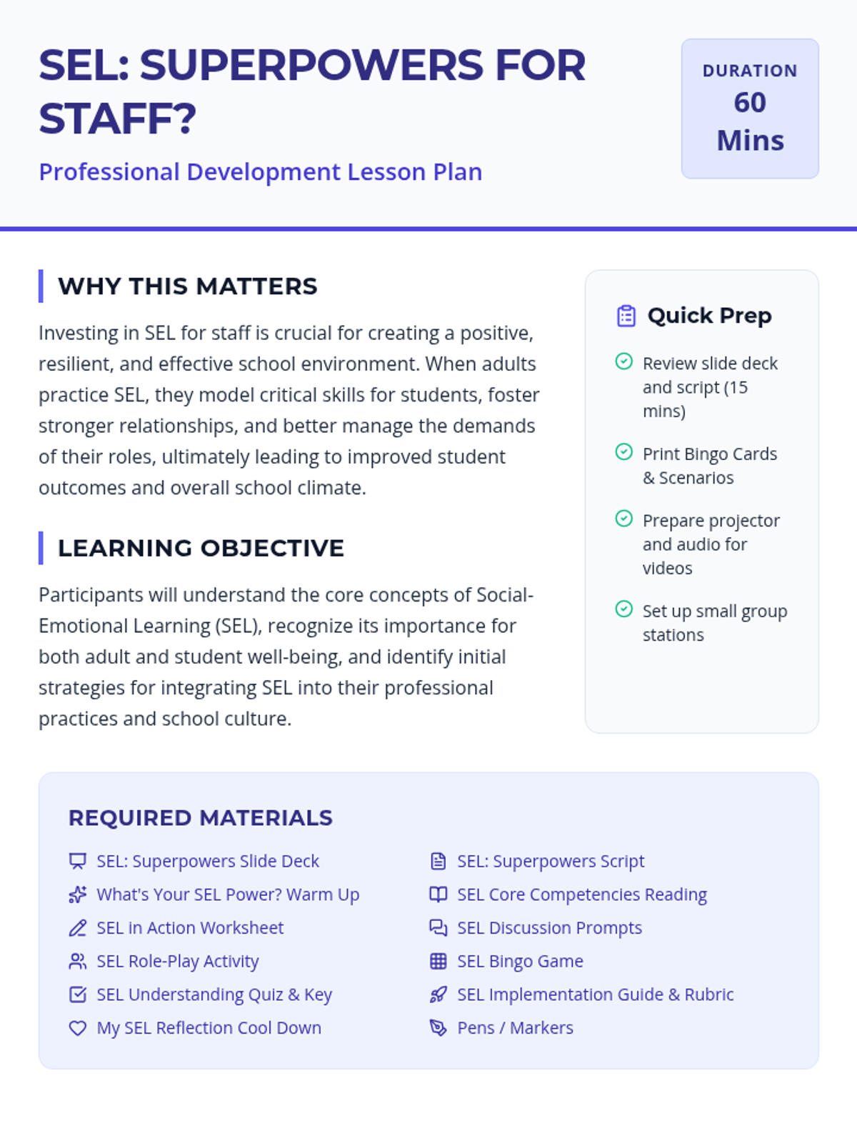 This professional development session introduces SEL to school staff, emphasizing its importance for adult well-being and student success through interactive activities and reflection.