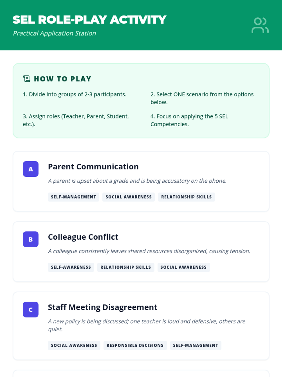 A high-energy, 30-minute coaching session focused on five critical self-advocacy scenarios. Includes role-play, visual aids, and practical toolkits for immediate application in real-world settings.