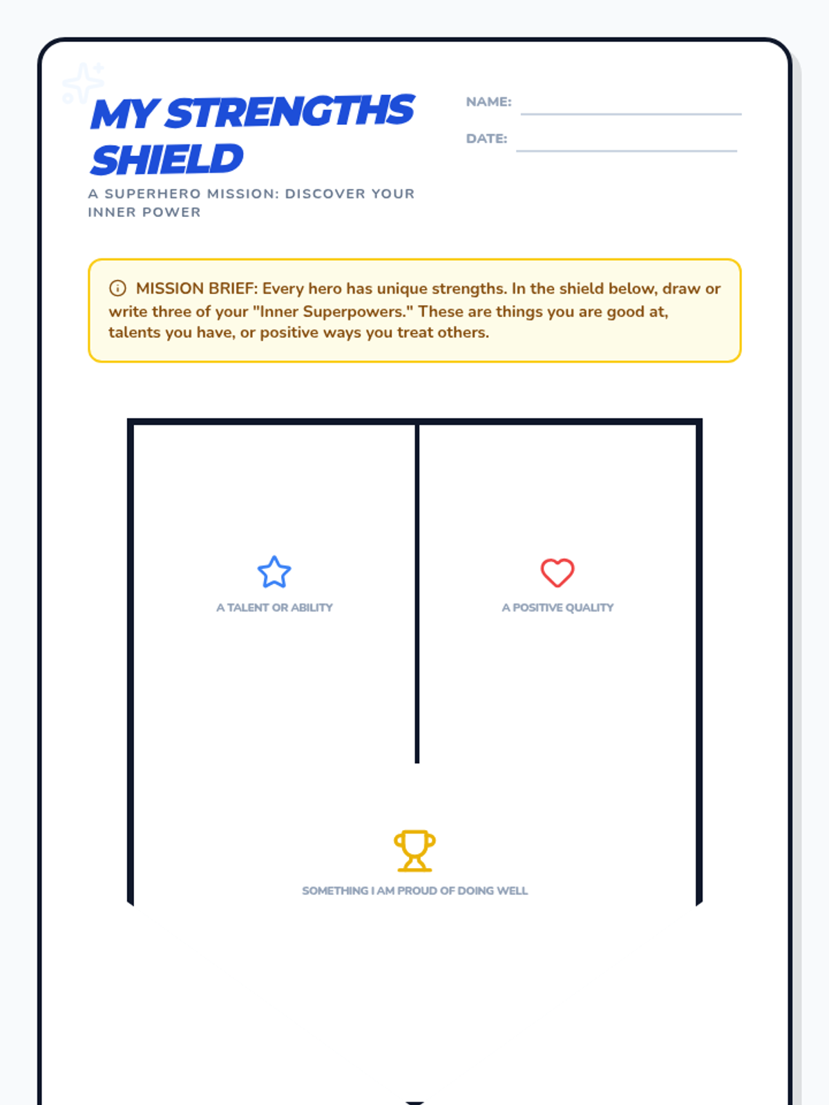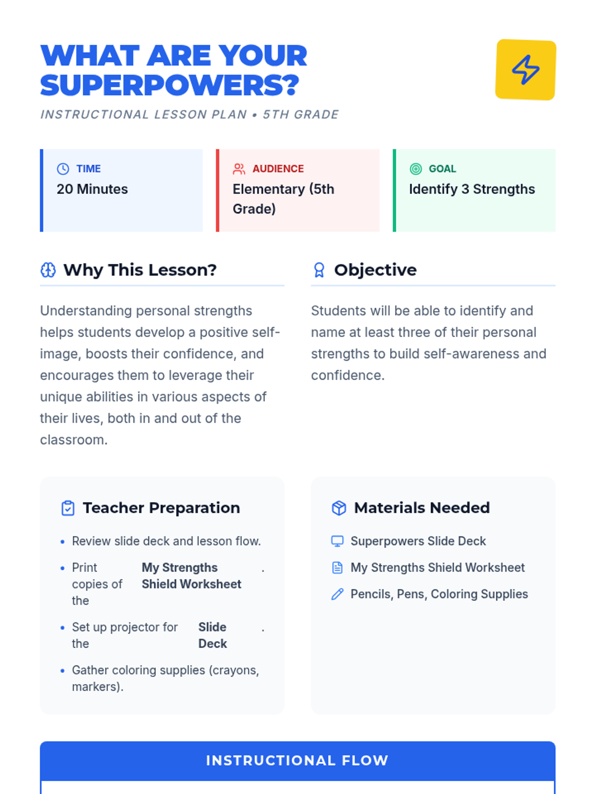 A 20-minute Tier 1 lesson for 5th graders to identify and celebrate their personal 'inner superpowers' (strengths) through discussion and a creative shield activity.