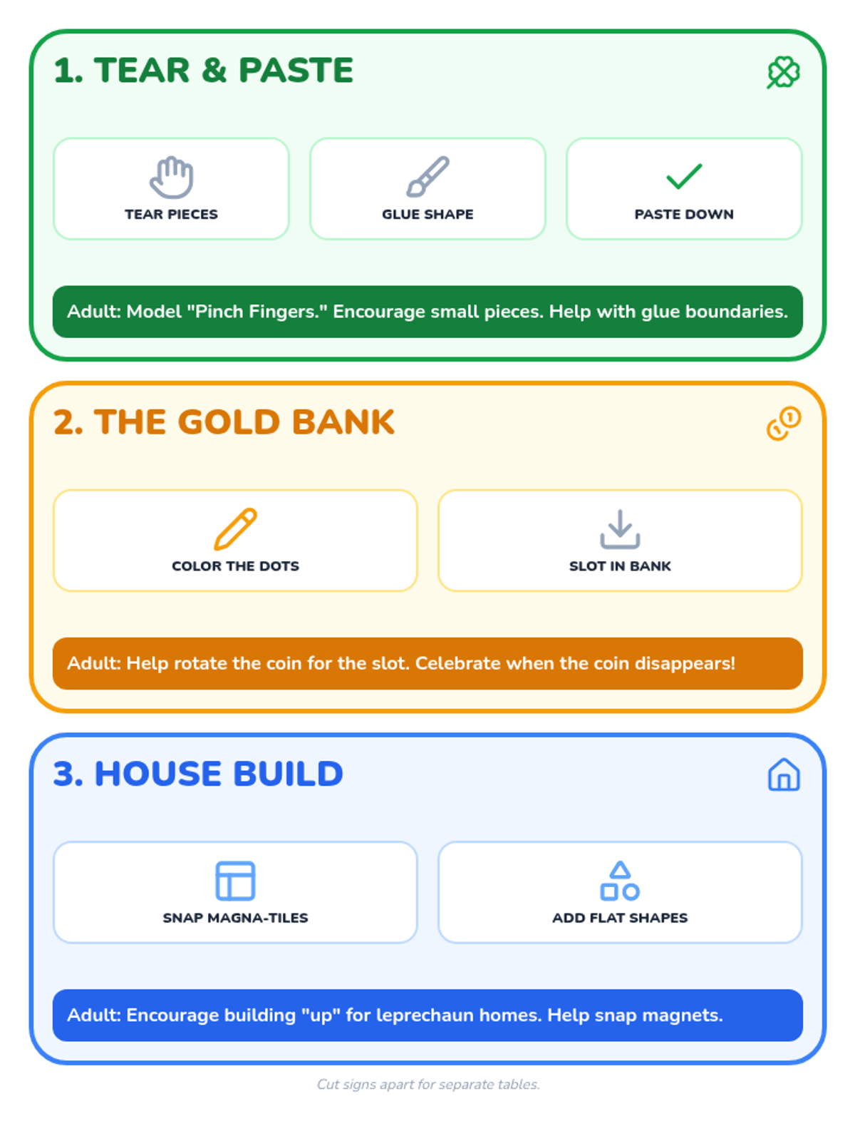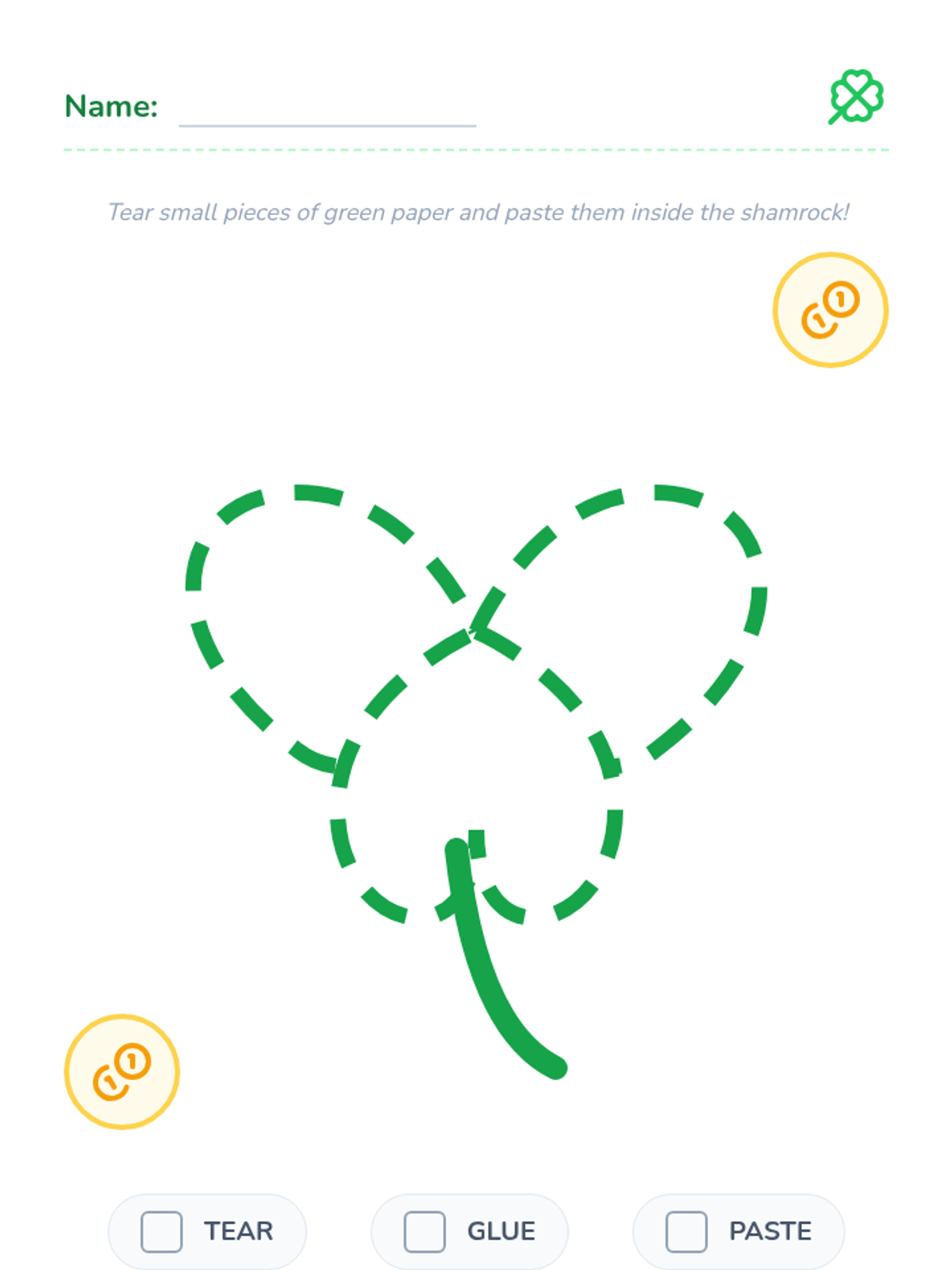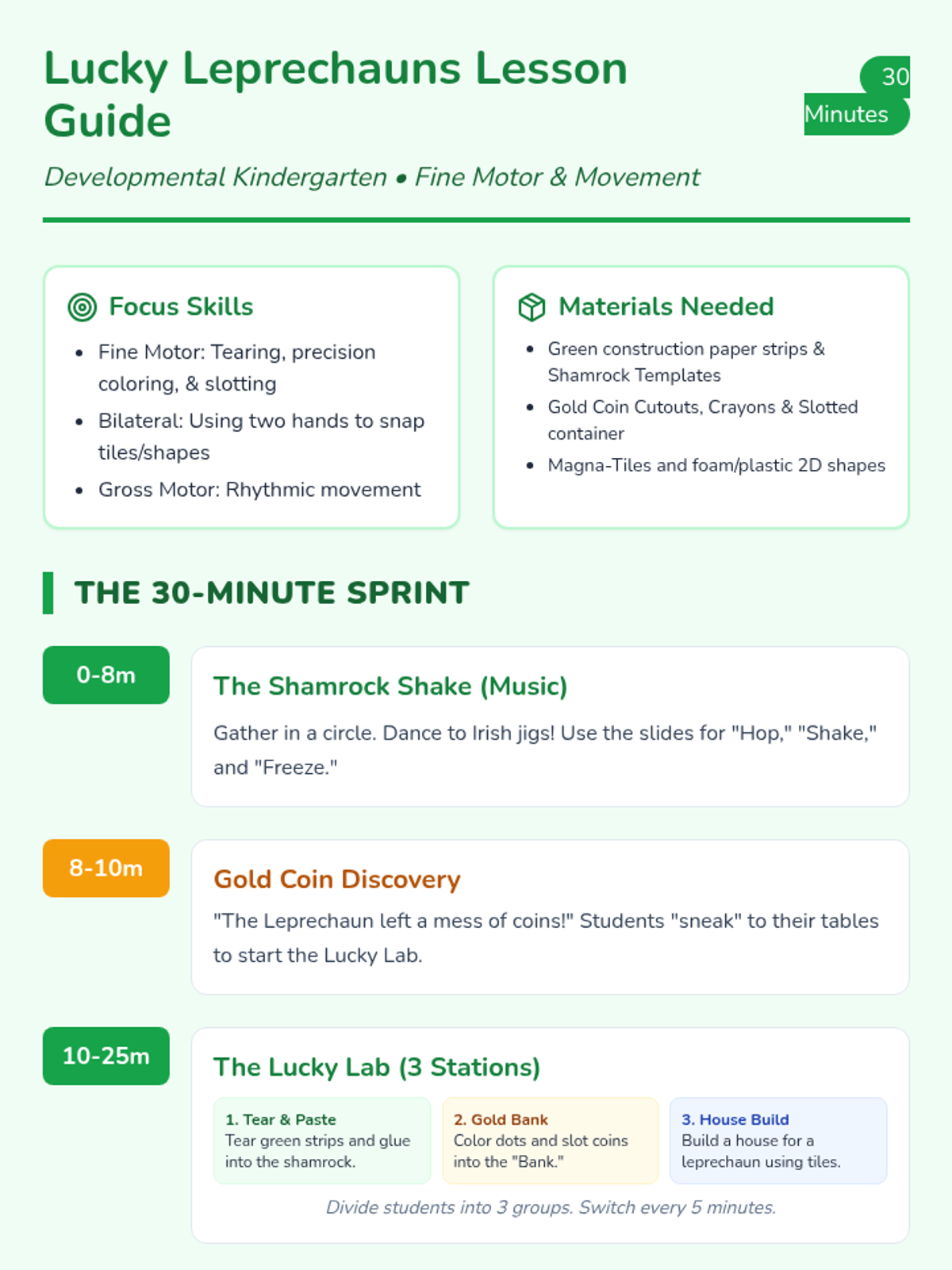 A high-energy, 30-minute St. Patrick's Day lesson focusing on fine motor skills through a 'Tear and Paste' shamrock craft and a 'Shamrock Shake' movement activity. Designed specifically for developmental kindergarteners with short attention spans.