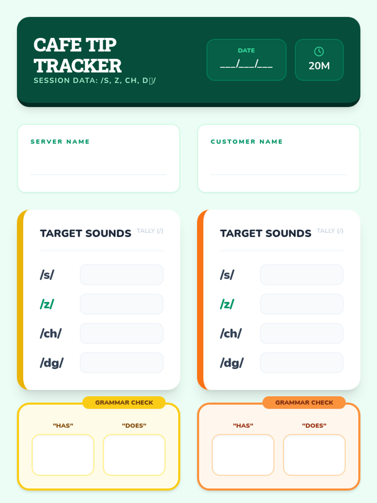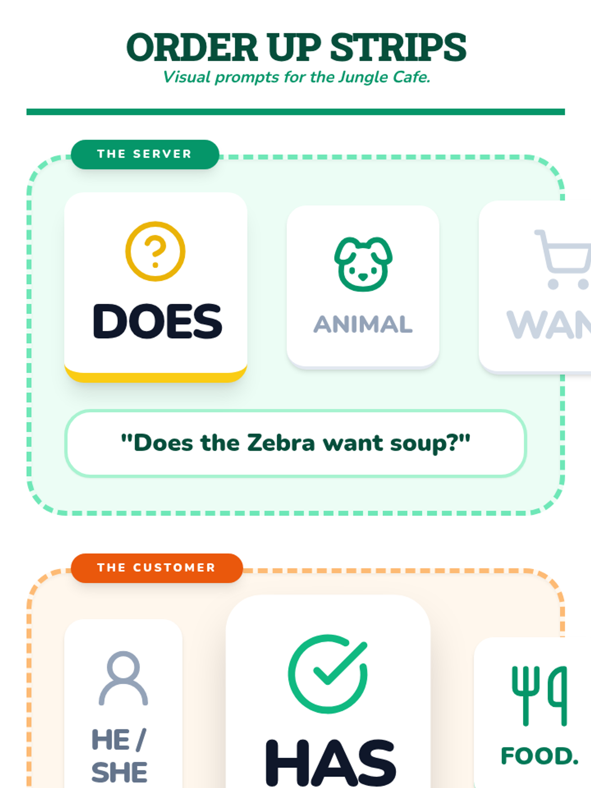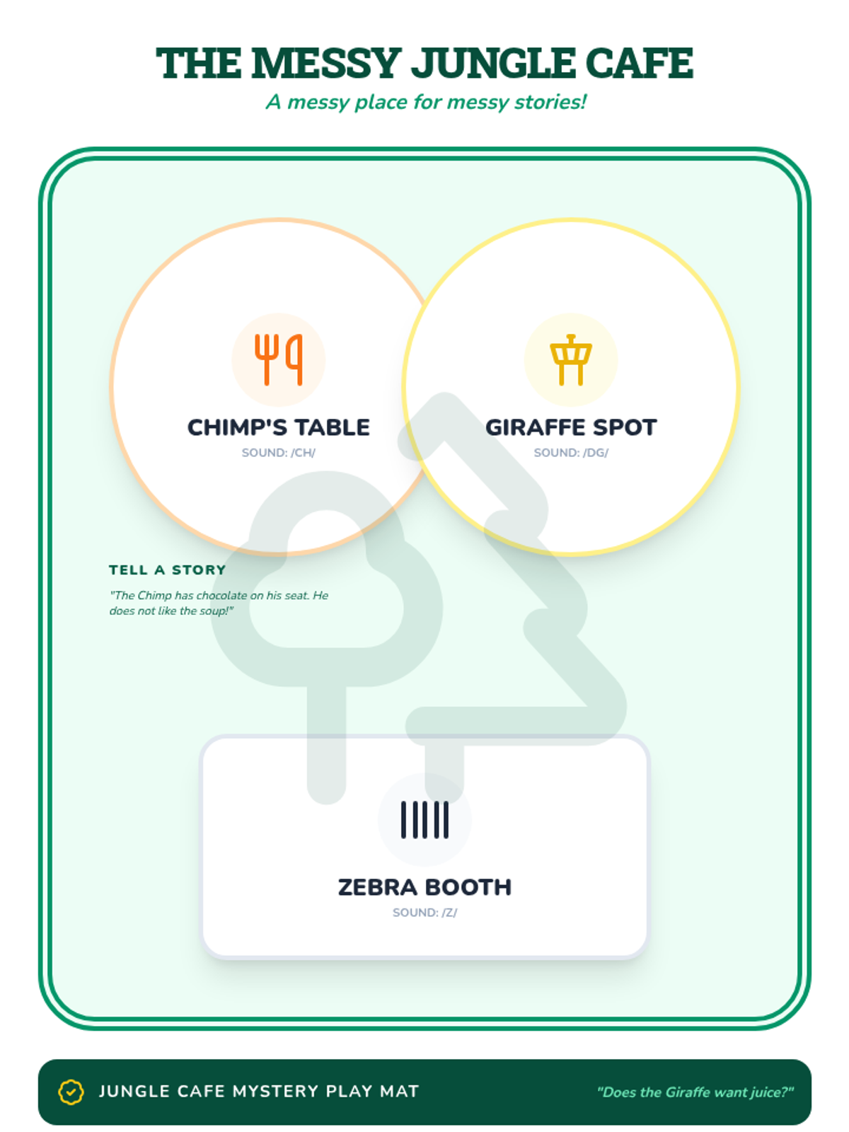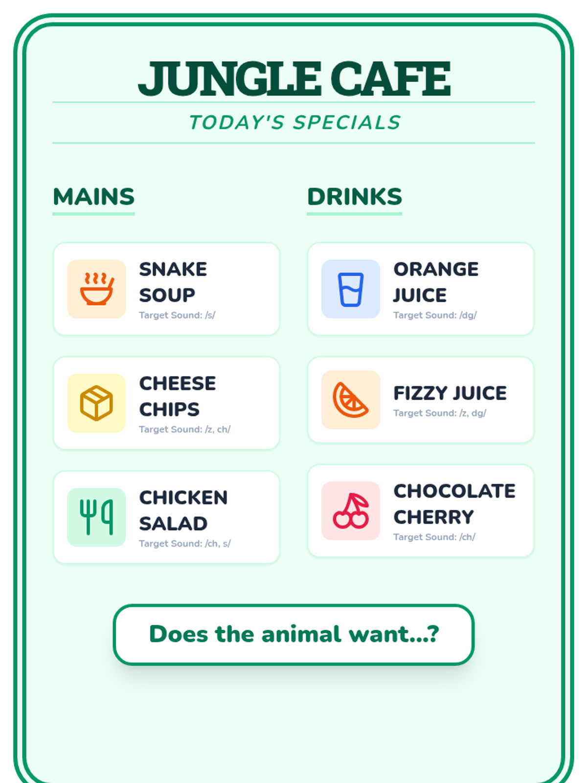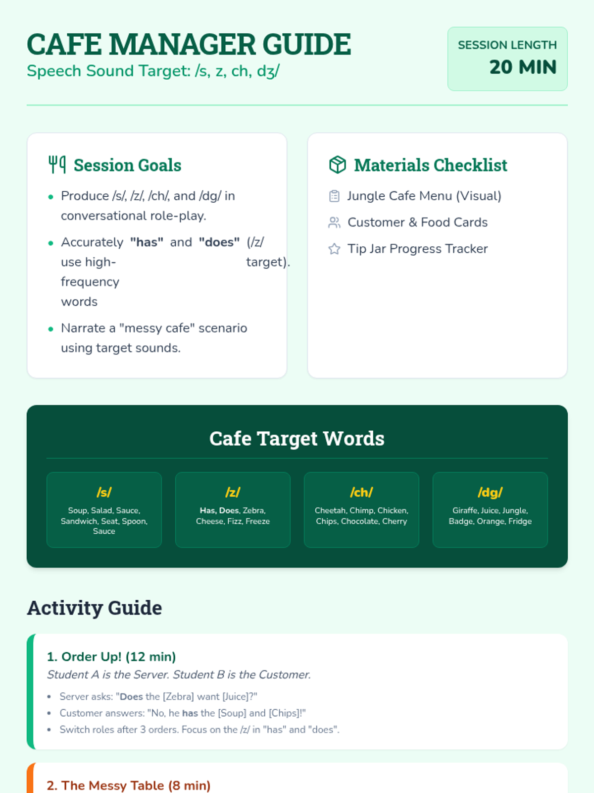 A 20-minute speech therapy lesson for second graders centered on 'The Jungle Cafe.' Students act as cafe workers and customers, using /s/, /z/, /ch/, and /dg/ sounds while taking orders and describing messy meals. Focuses on repetitive 'has' and 'does' questions.