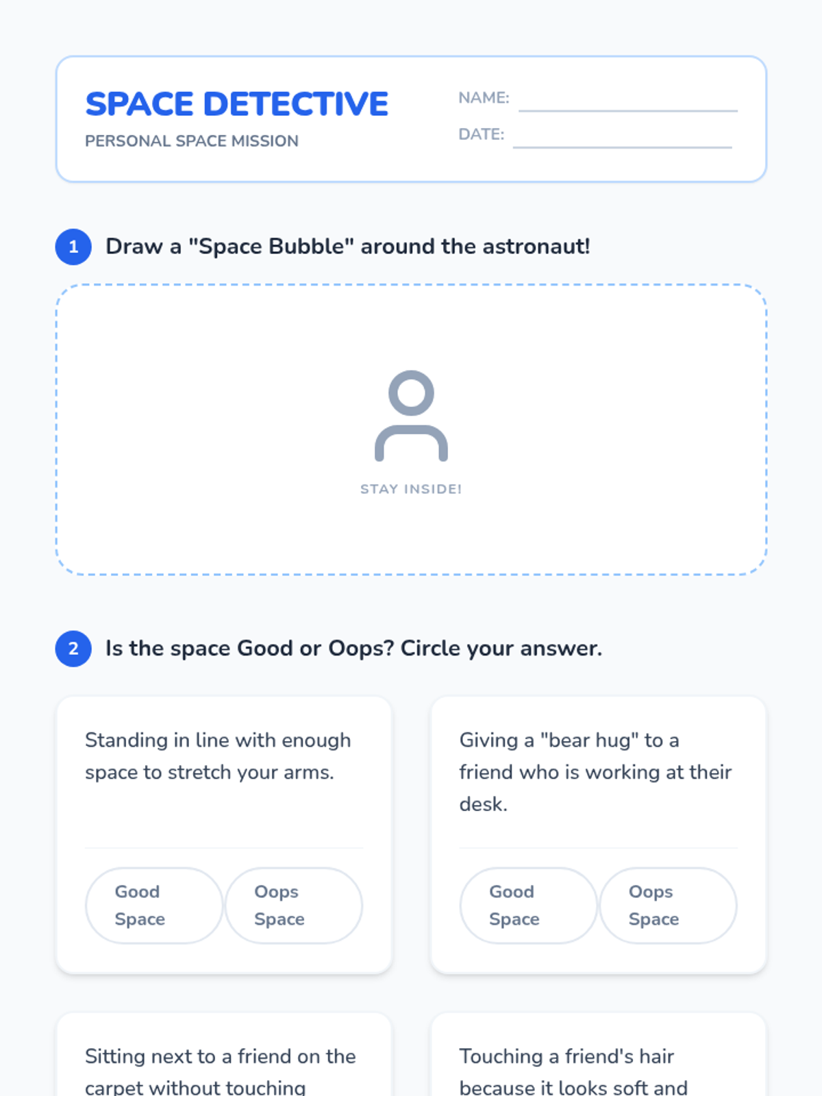A social skills lesson designed for 1st-grade students with ASD, focusing on the concept of the 'Personal Space Bubble' through visual metaphors and concrete examples.