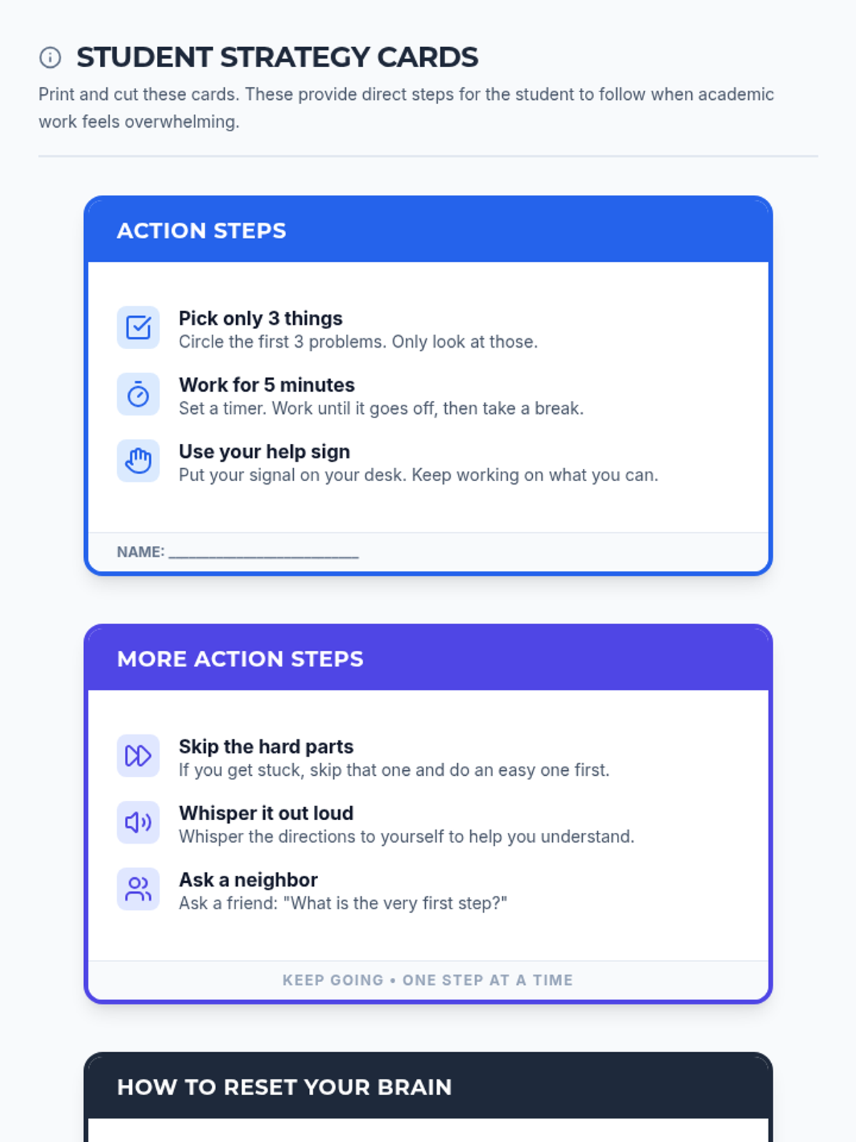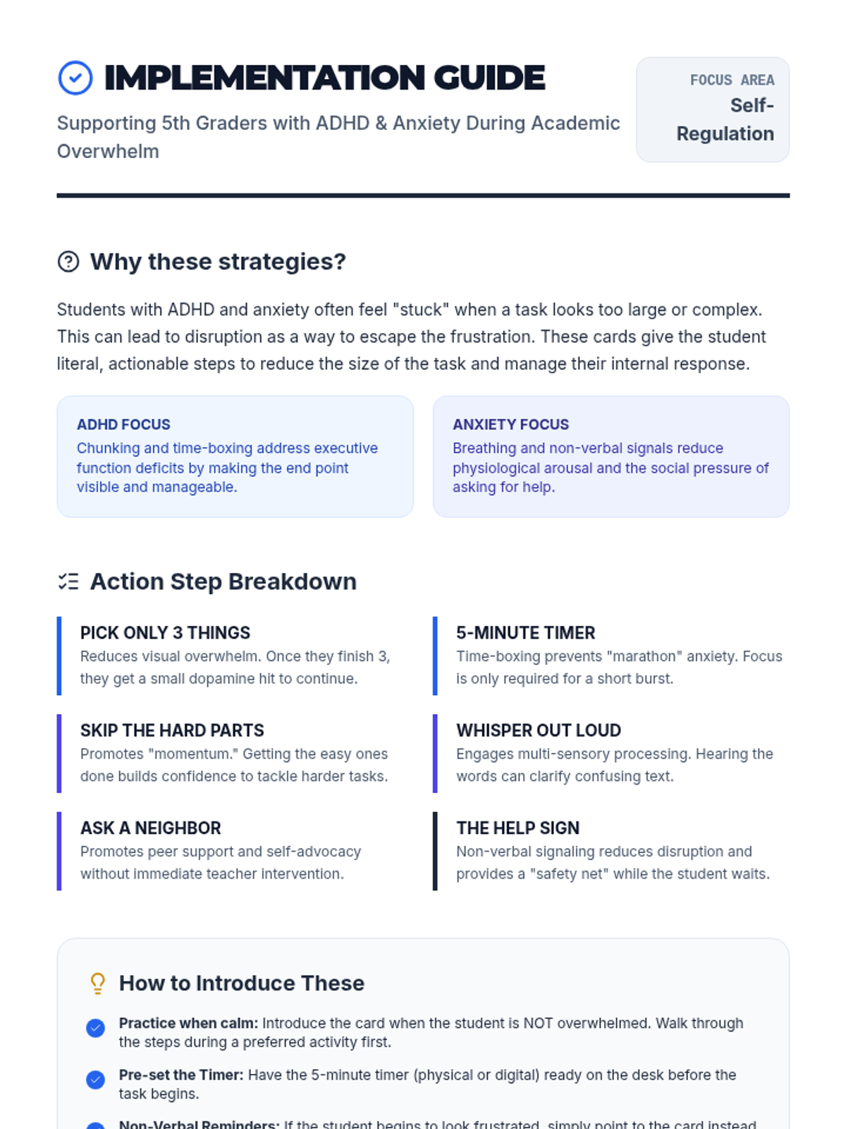 A set of resources centered around a 'Mission Control' theme to help 5th-grade students with ADHD and anxiety manage academic overwhelm. Includes a student reference card and an implementation guide for teachers.