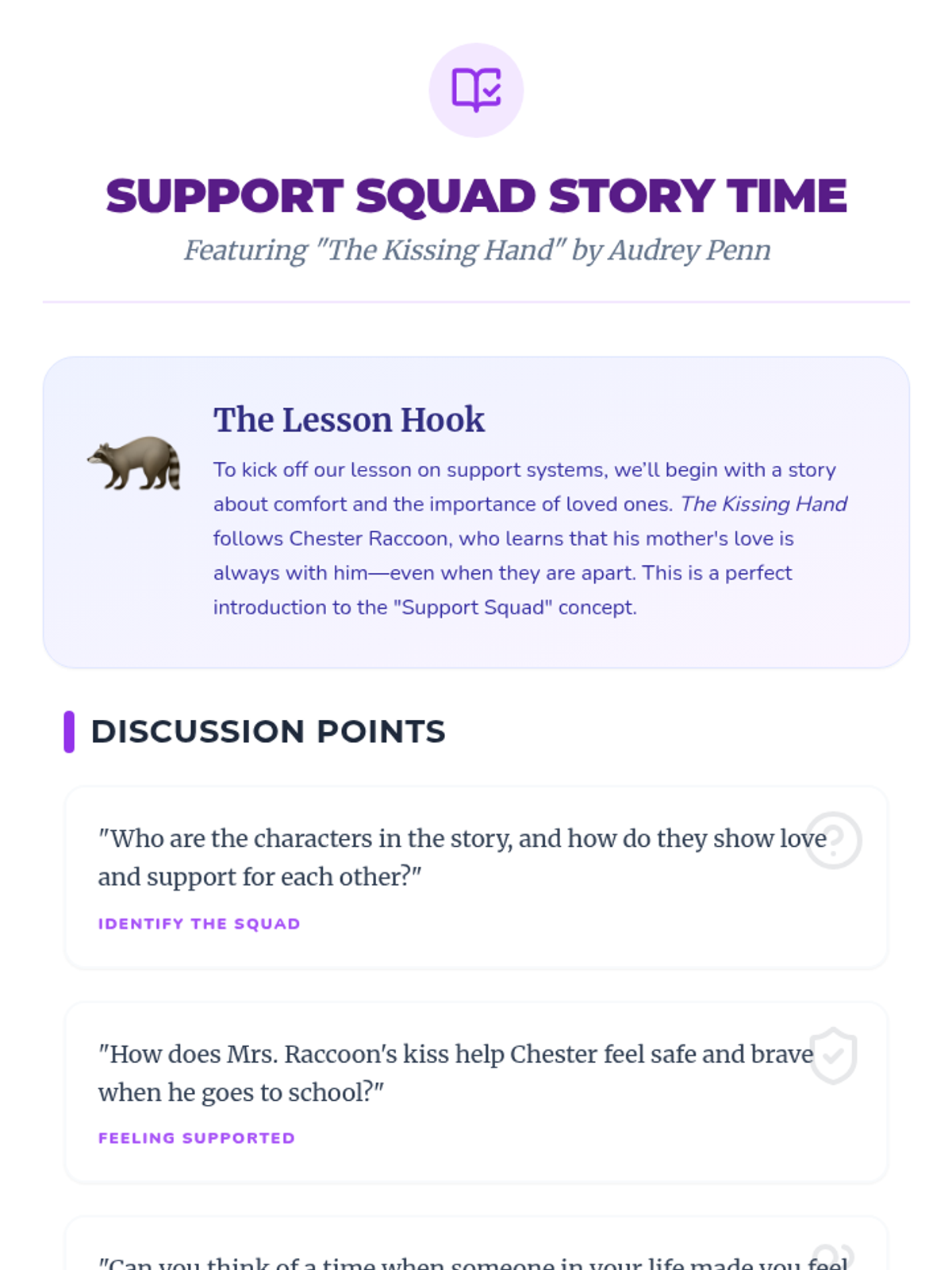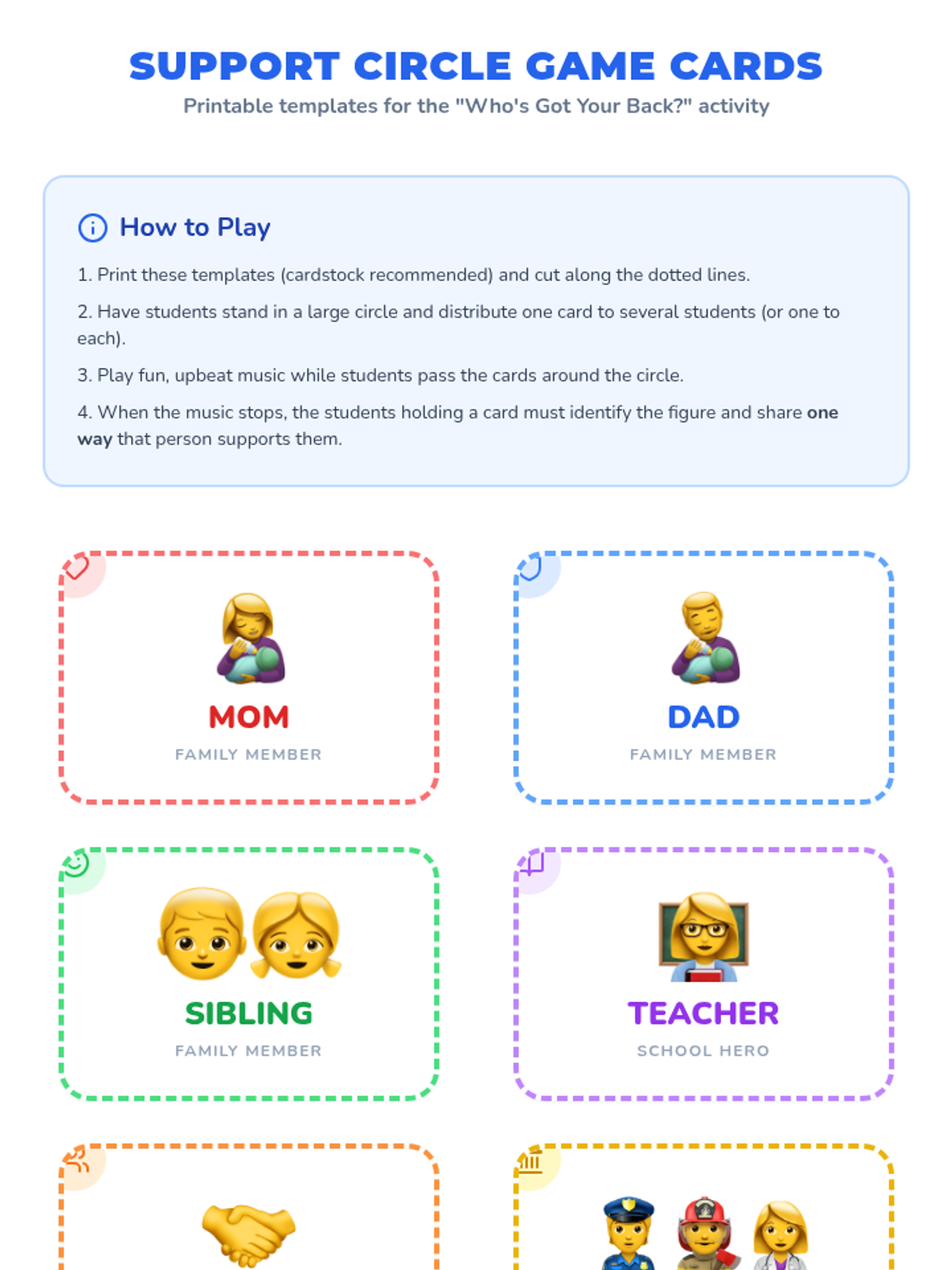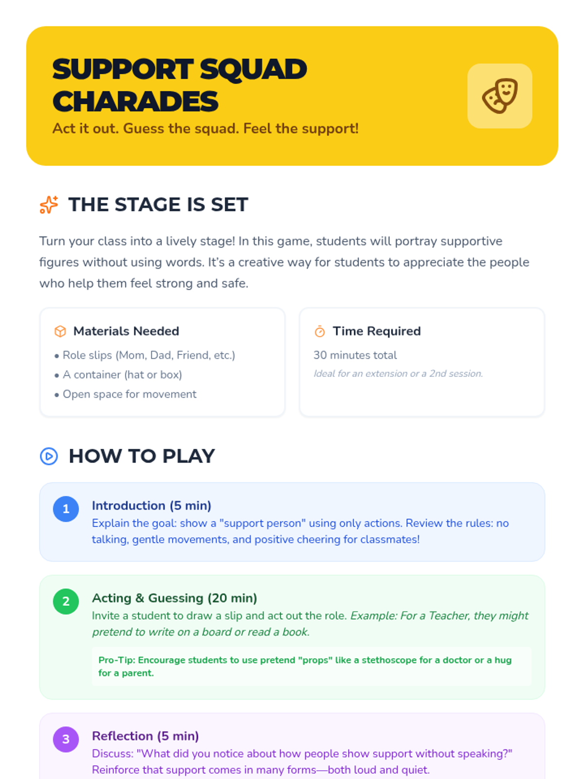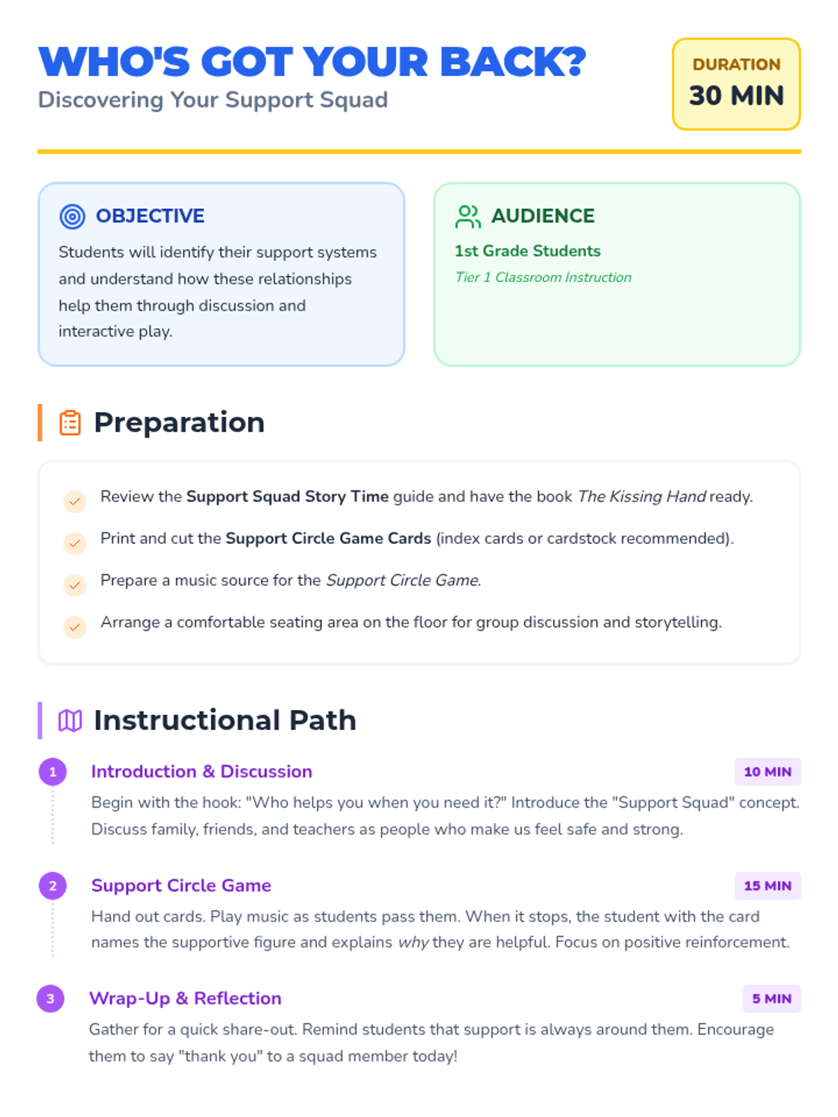 In this engaging 1st-grade lesson, students explore the concept of support systems by identifying the people in their lives who help them, fostering emotional awareness and help-seeking behaviors.