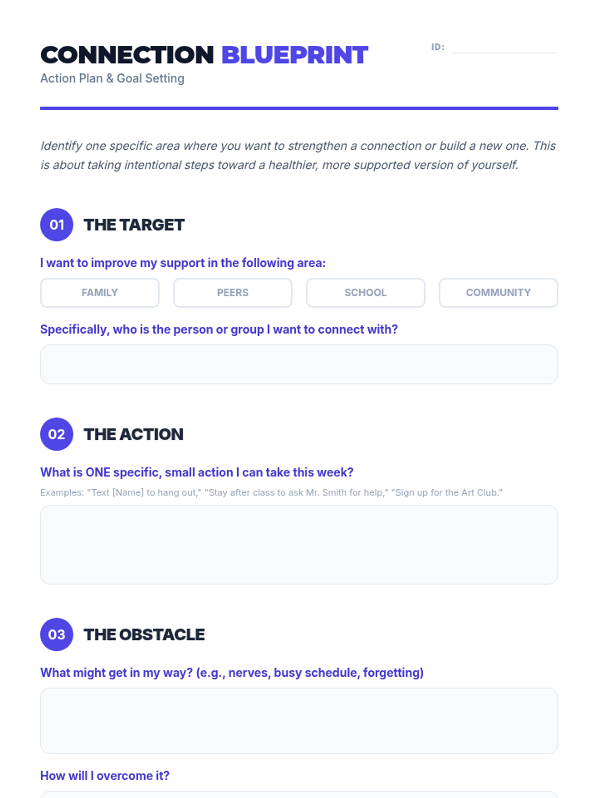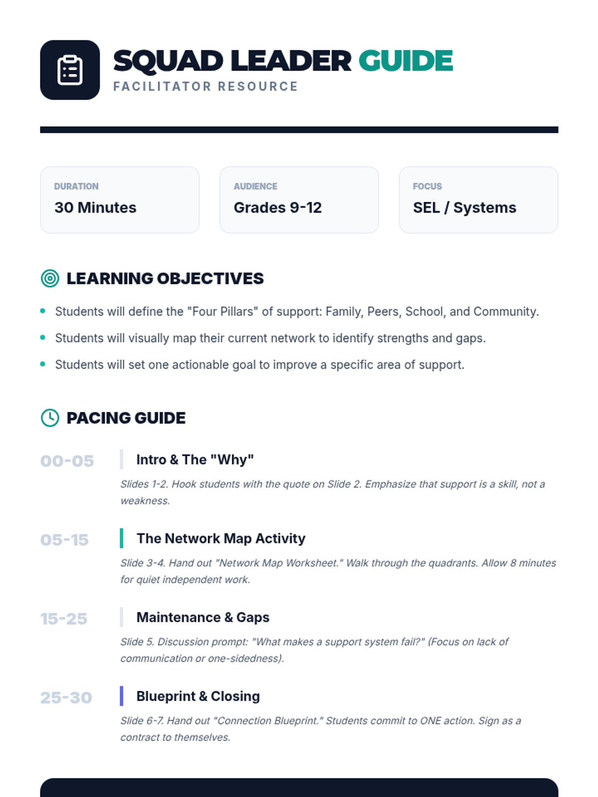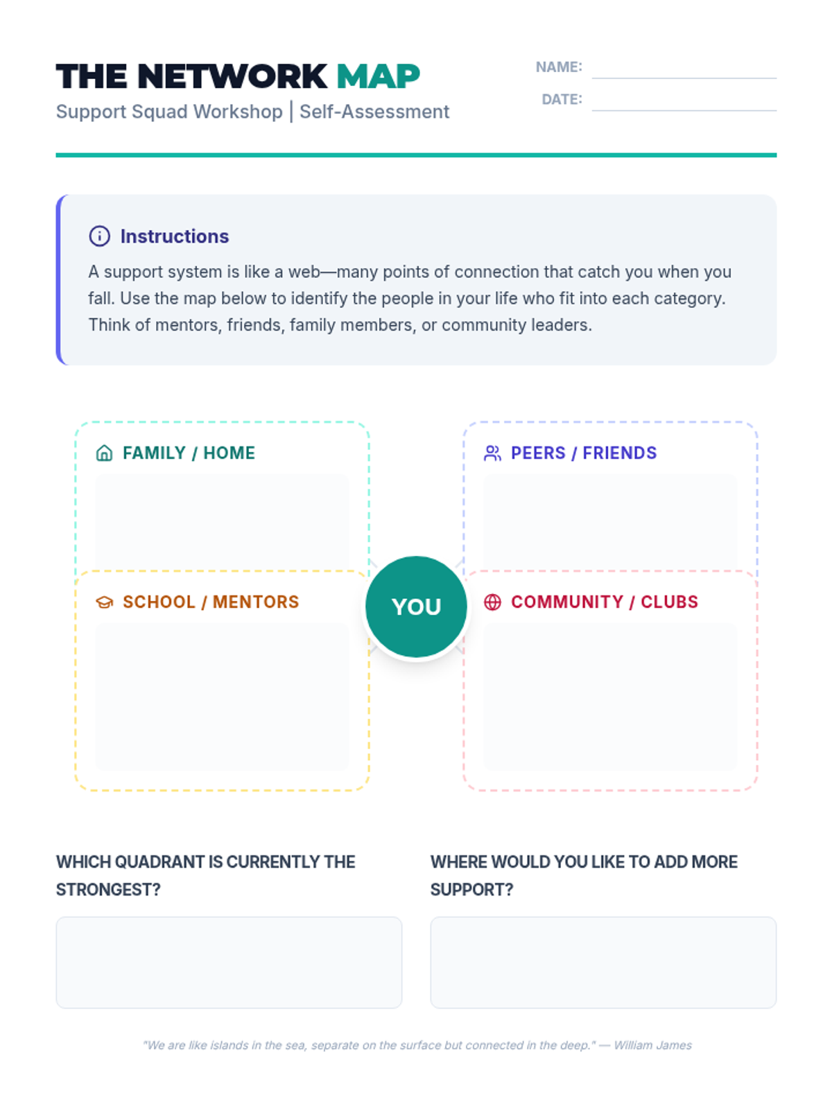 A 30-minute SEL workshop for high schoolers focused on identifying different types of support (family, friends, school, community), self-assessing their current networks, and setting goals to strengthen their connections.