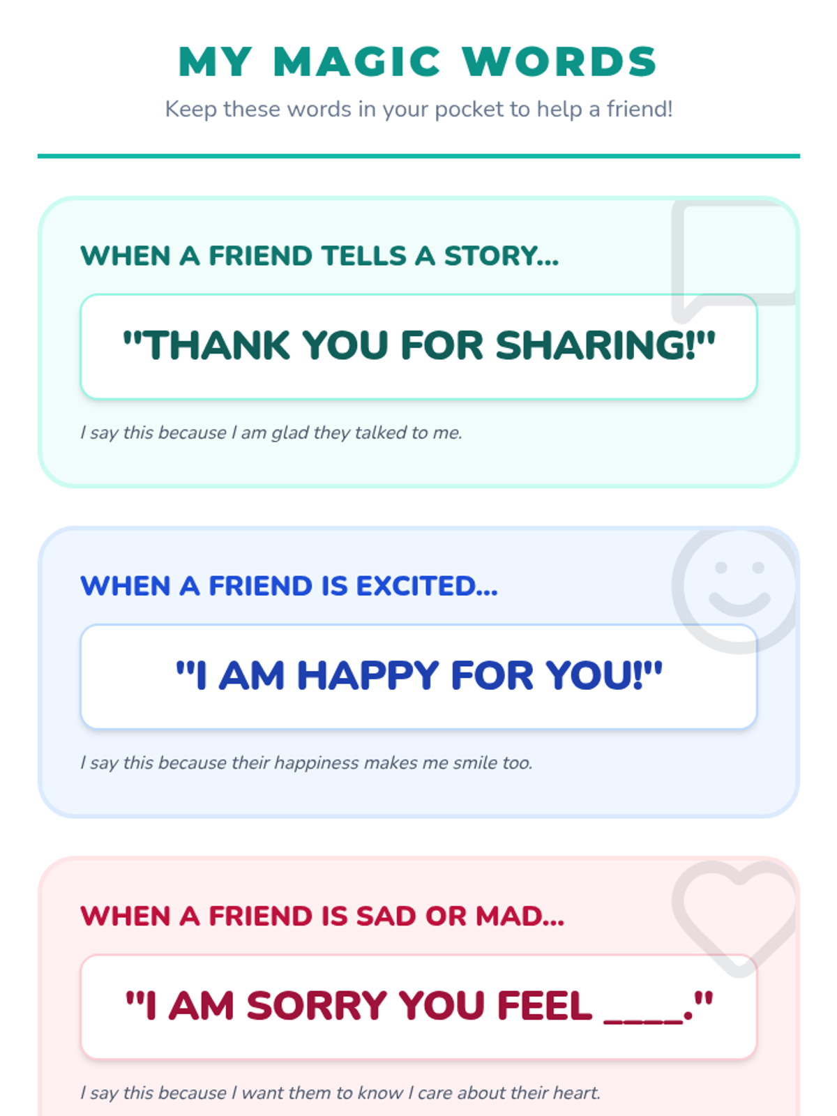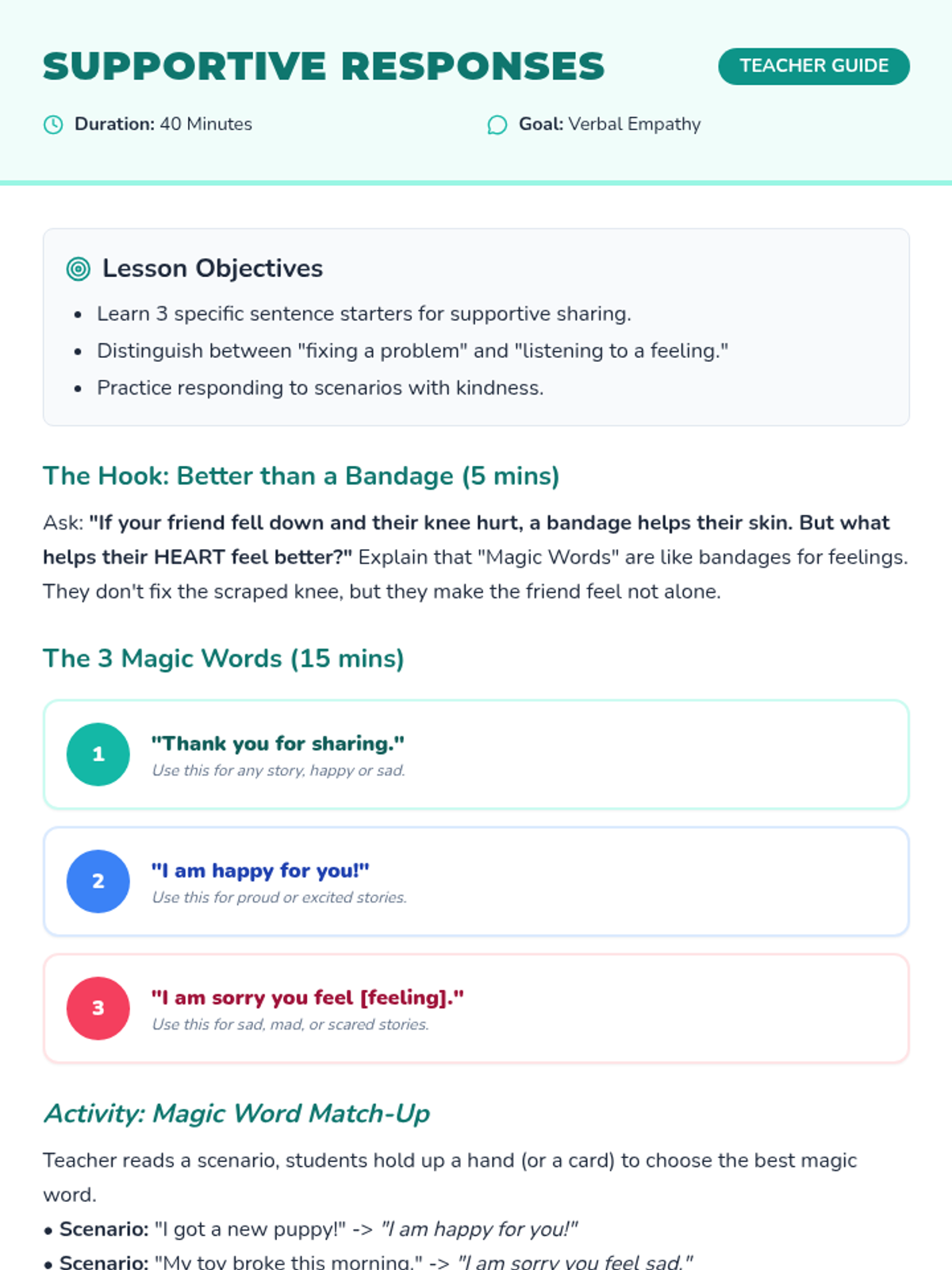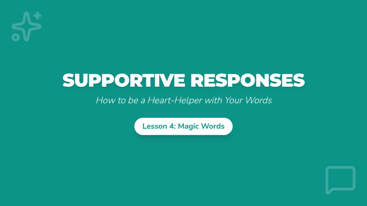 Teaches specific sentence starters and 'magic words' to validate peers' feelings during sharing.