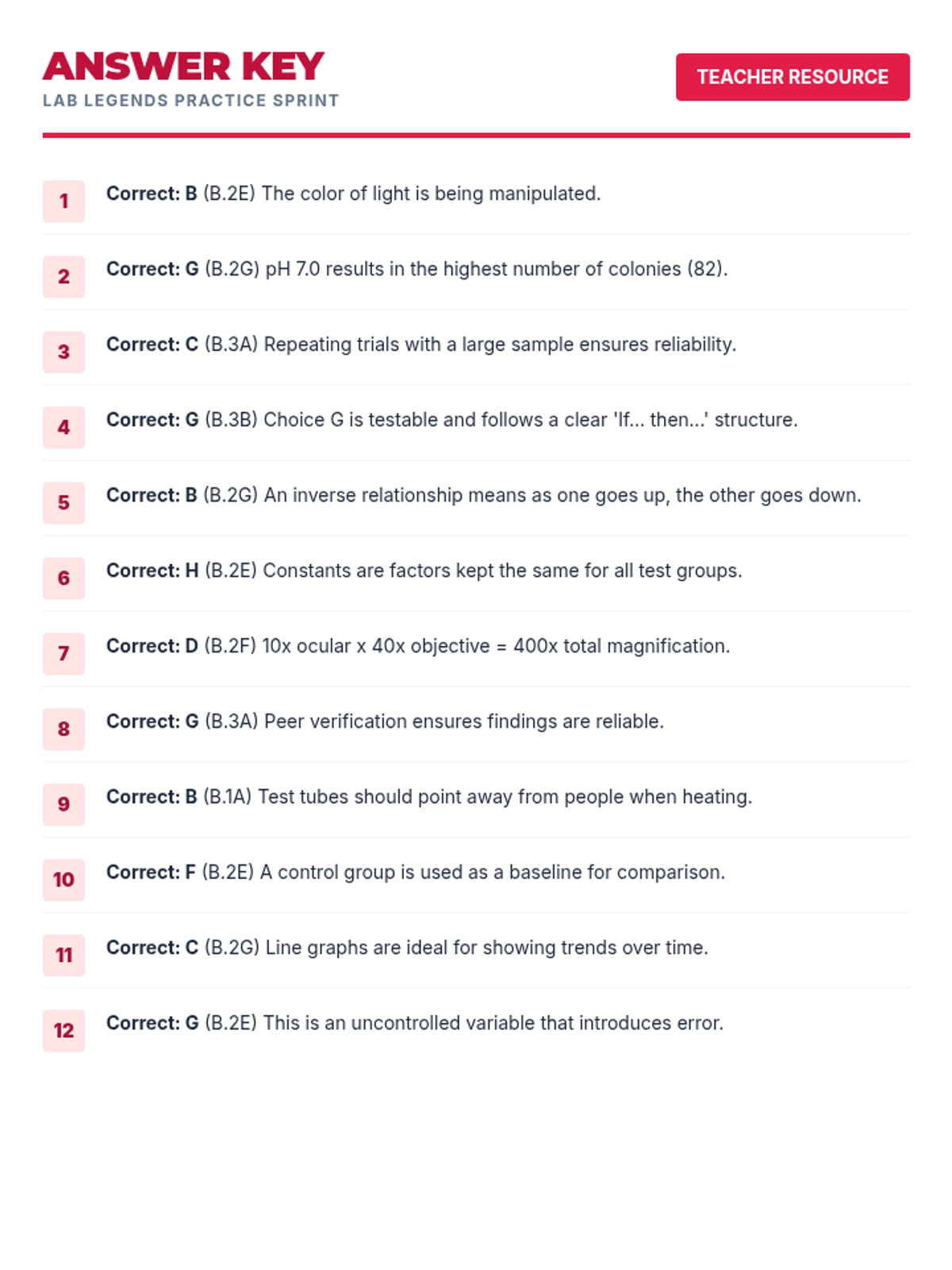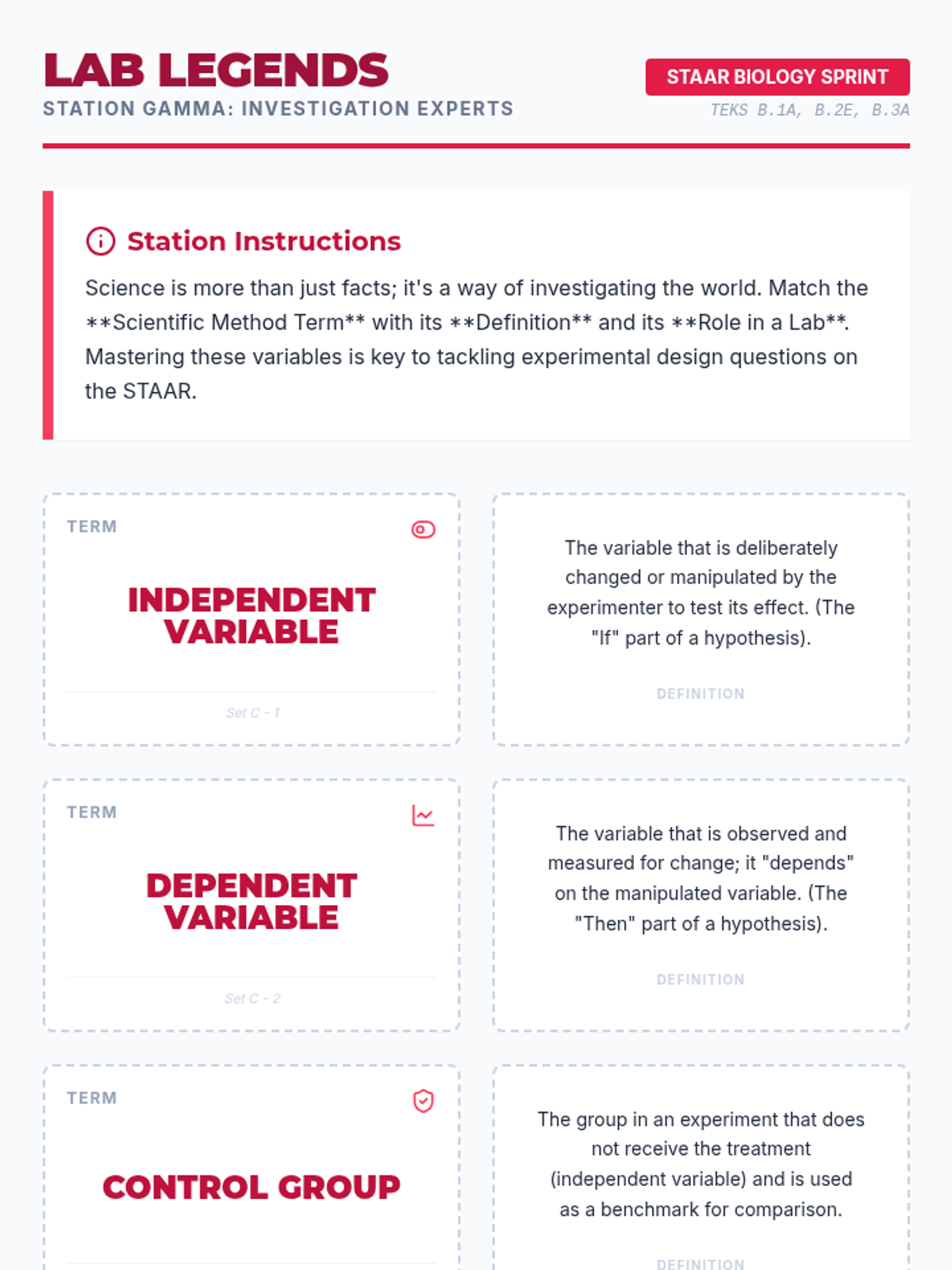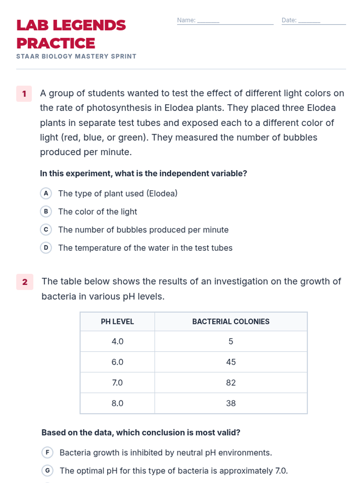 Developing skills in data analysis, hypothesis testing, and variable identification using STAAR-style experimental prompts.