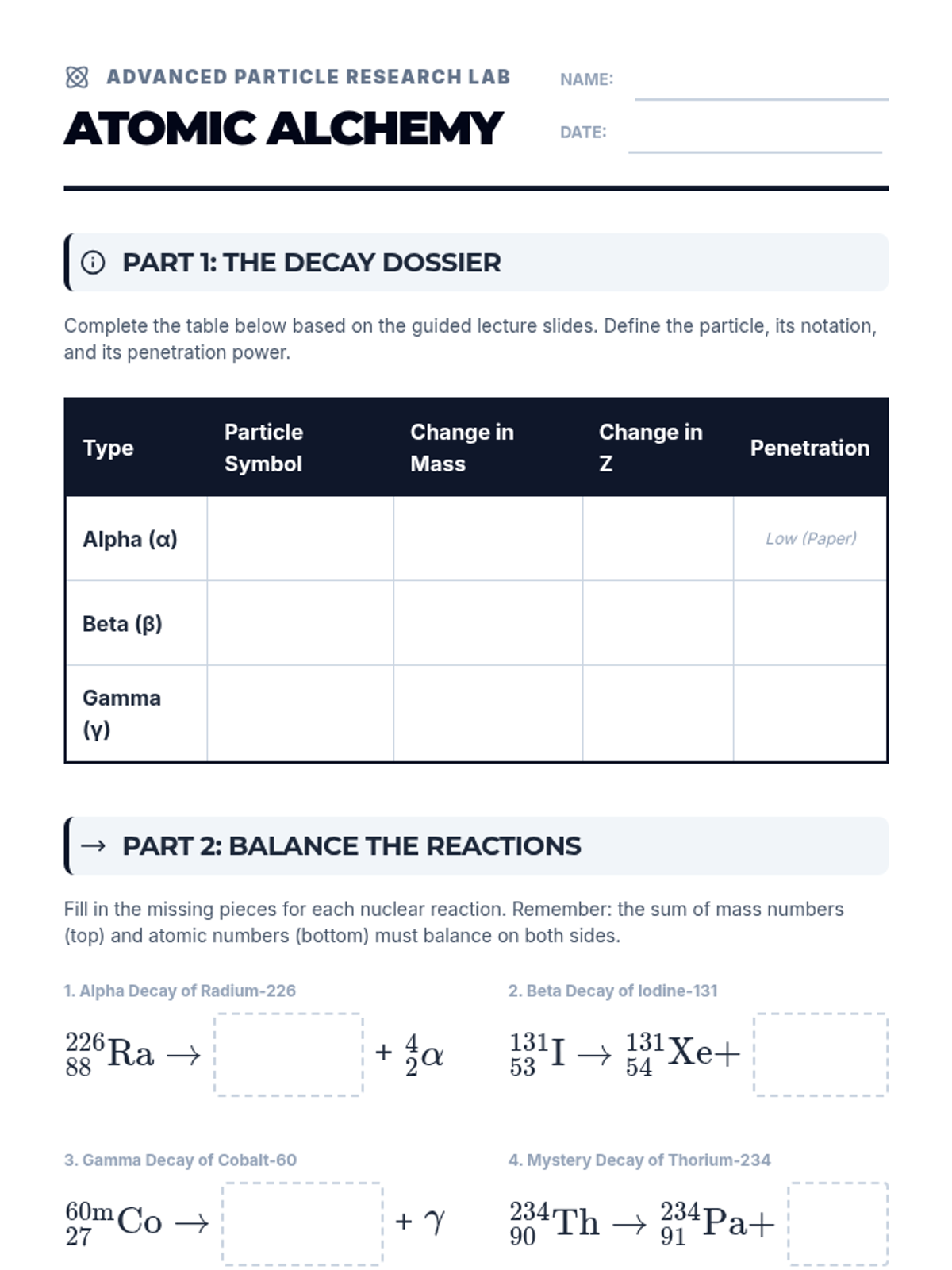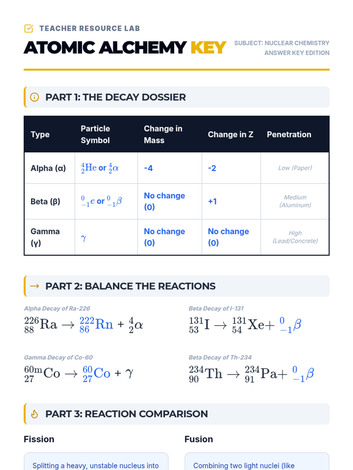 A comprehensive look at nuclear chemistry, covering the three main types of radioactive decay, the energetics of fission and fusion, and the mathematics of half-life.