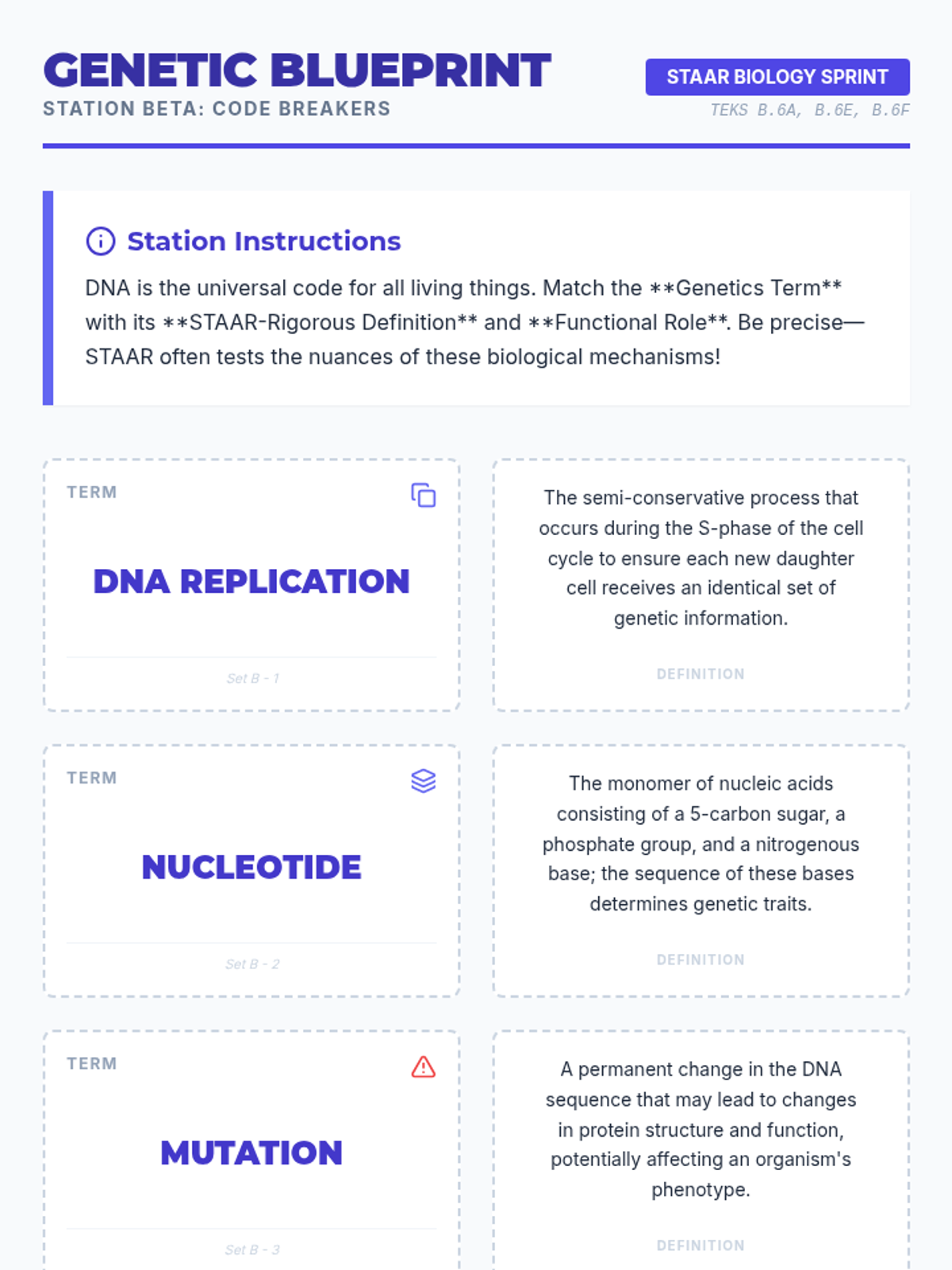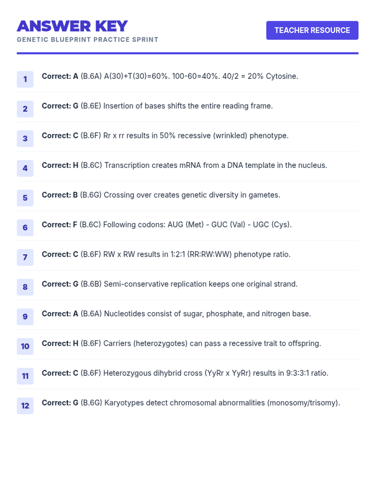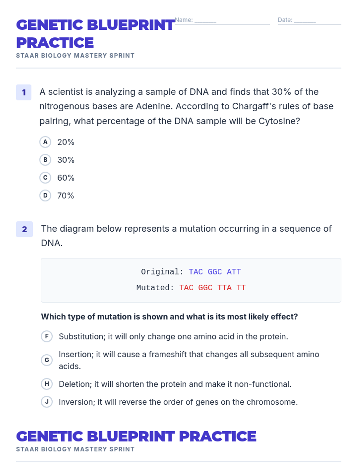 Focusing on DNA structure, replication, mutations, and Punnett squares with high-stakes exam scenarios.