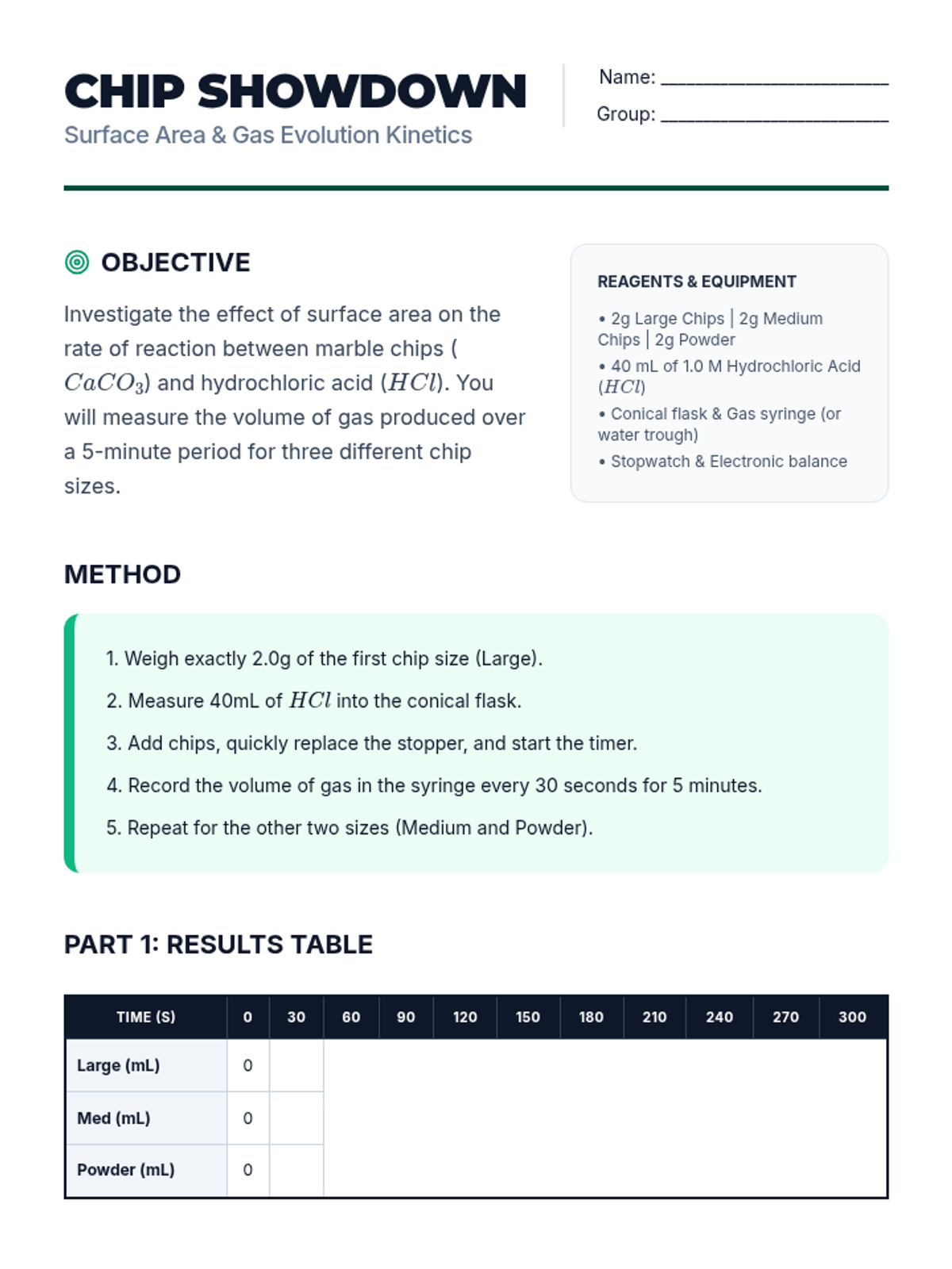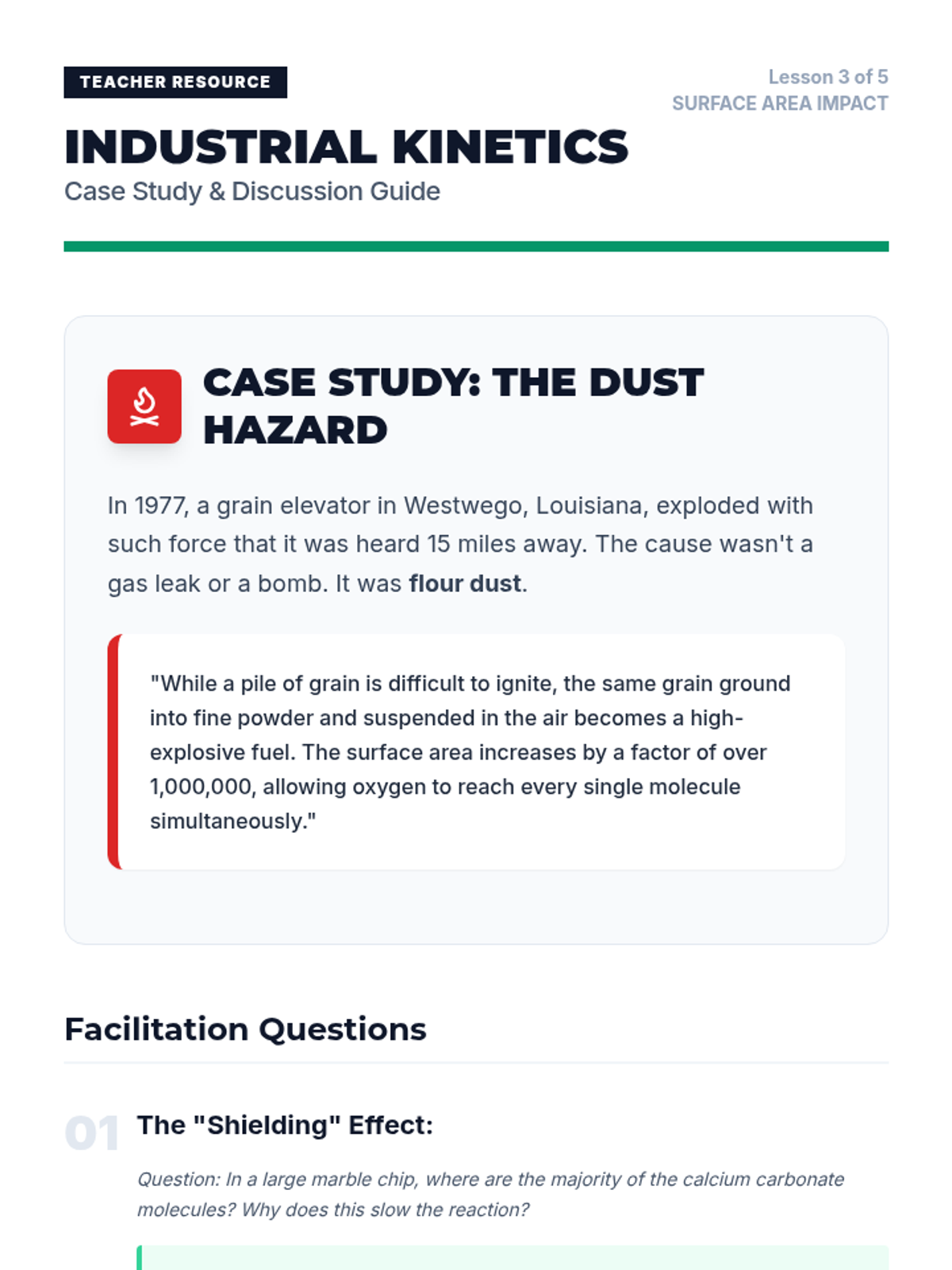 Students explore how surface area influences heterogeneous reaction rates using calcium carbonate chips, while discussing the industrial safety implications of dust and surface area.