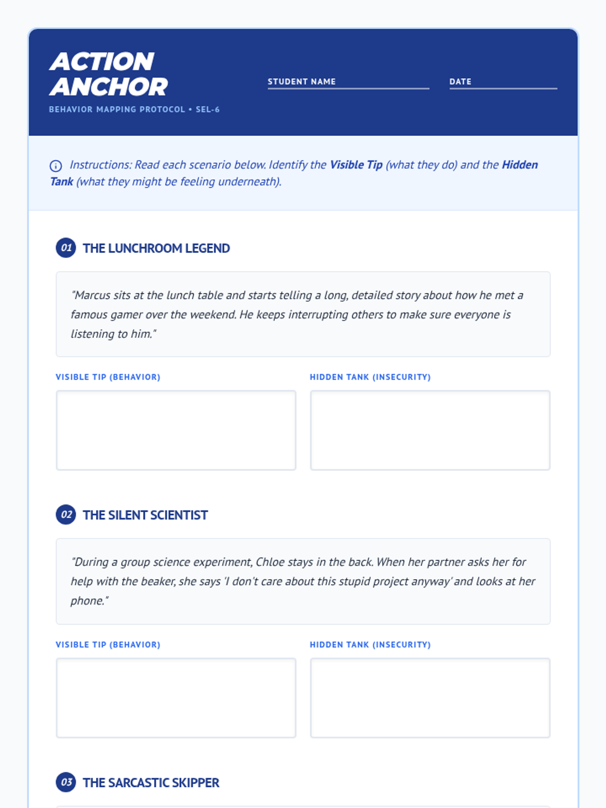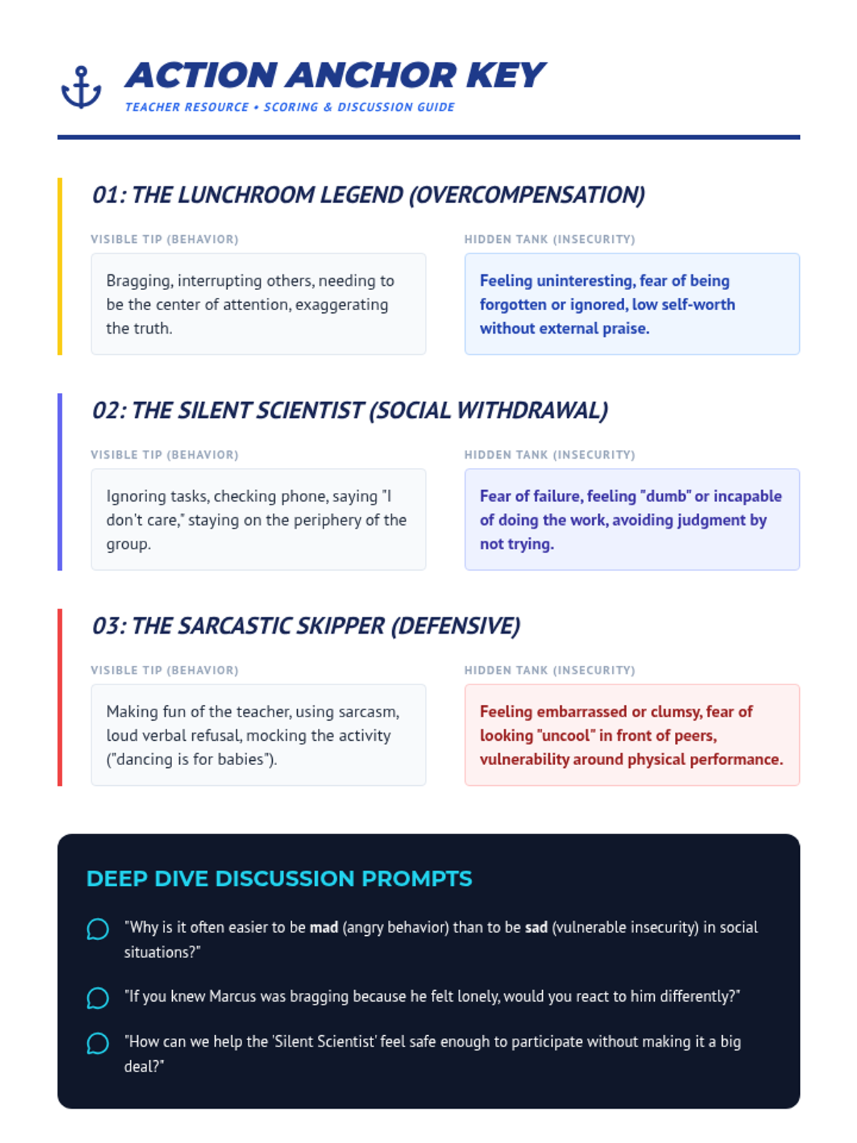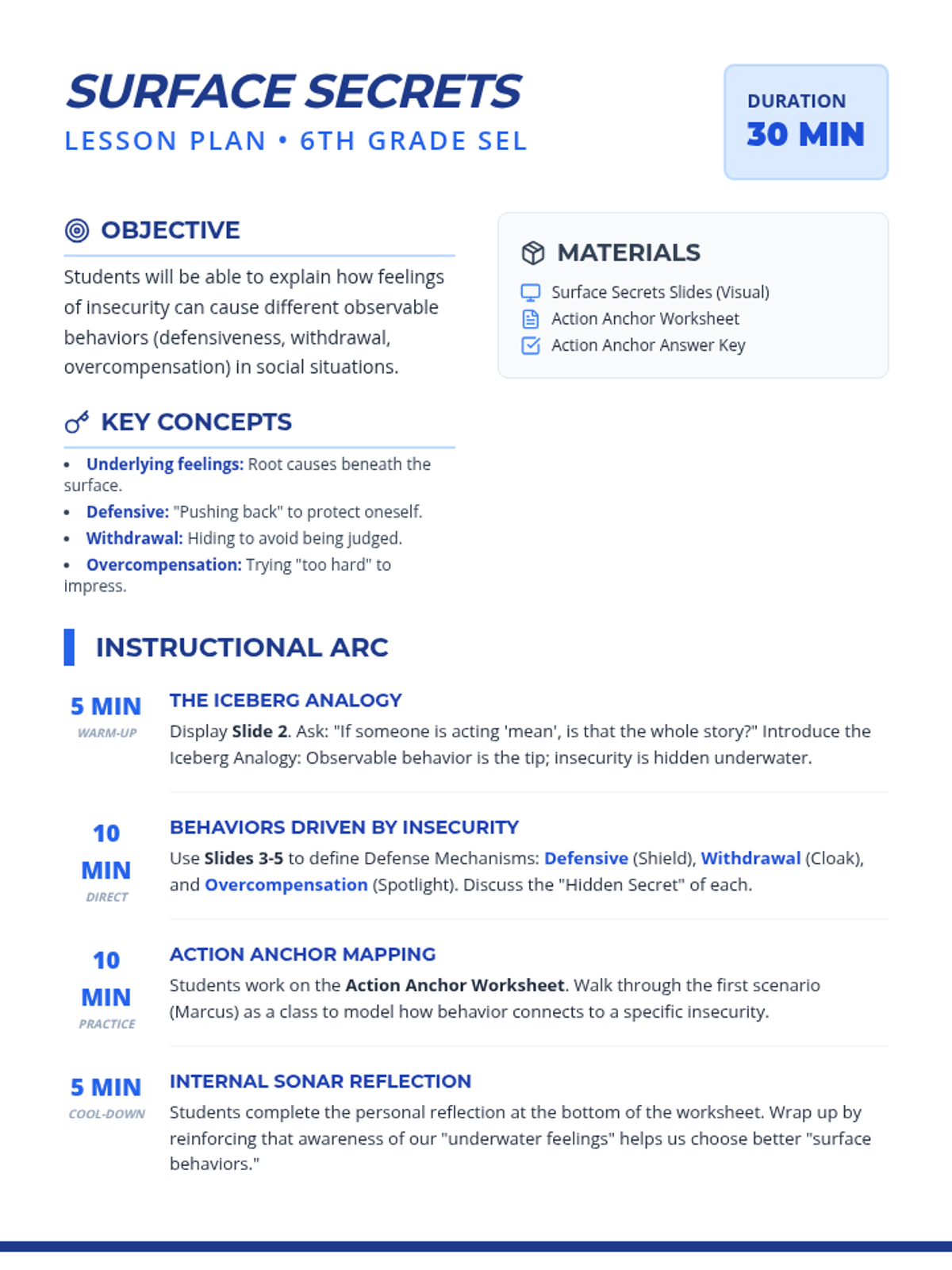 A 30-minute Social-Emotional Learning lesson for 6th graders exploring the relationship between hidden insecurities and observable behaviors using the iceberg analogy.