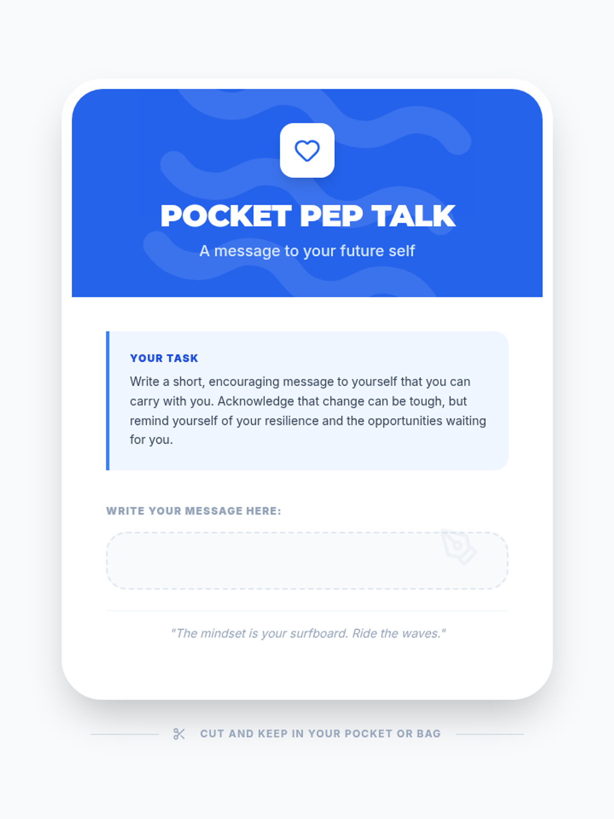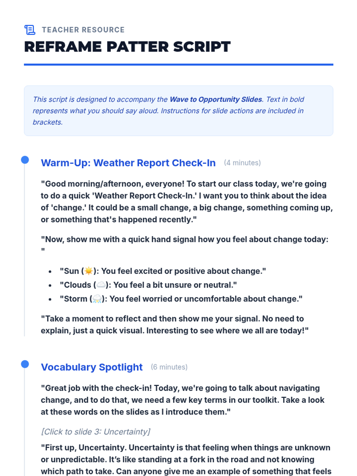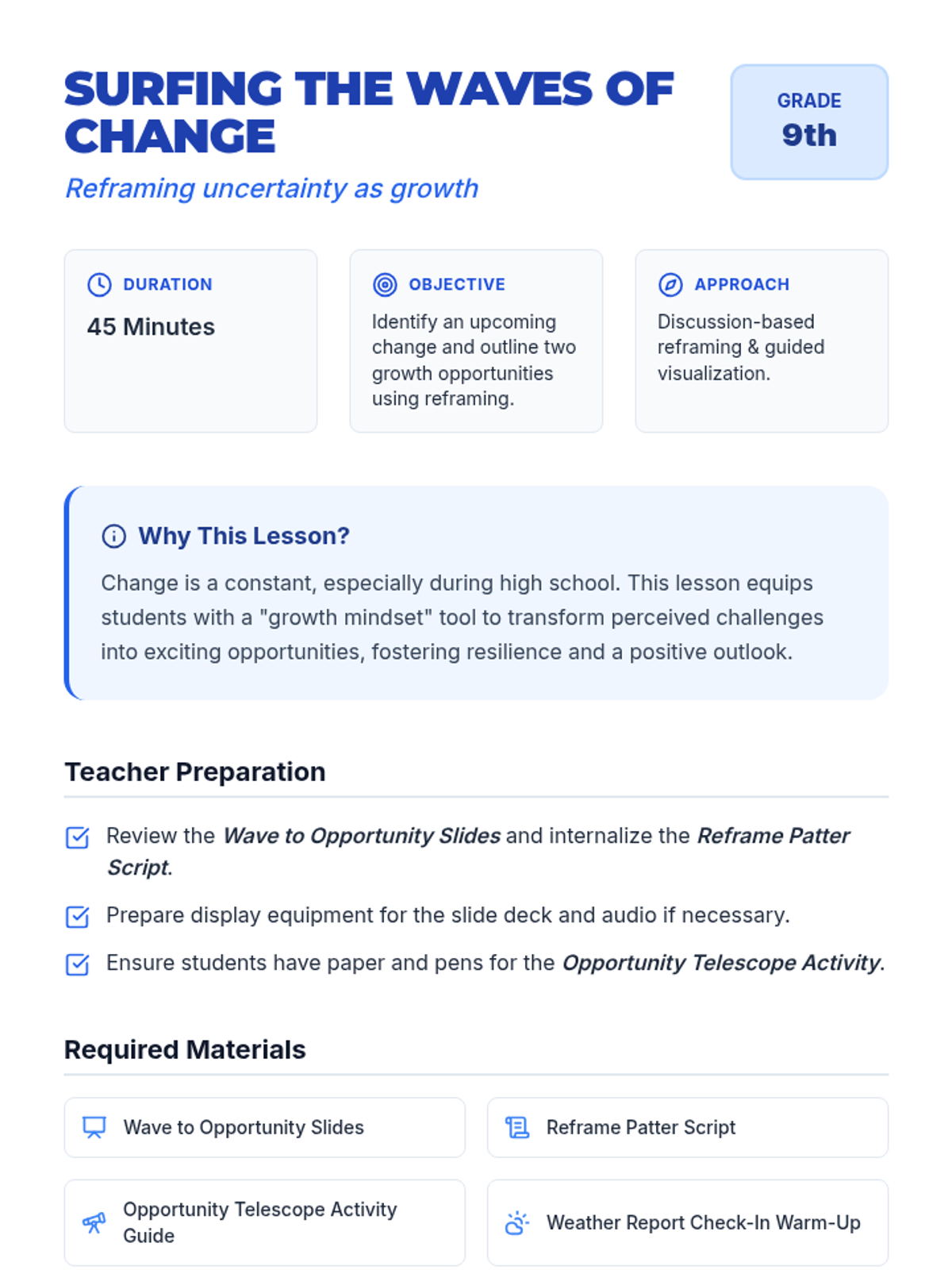 This 45-minute lesson for 9th graders reframes change from a source of anxiety into a growth opportunity. Using a 'surfing' metaphor, students develop vocabulary for resilience and practice a 'reframe' strategy to identify positive outcomes in upcoming life shifts.