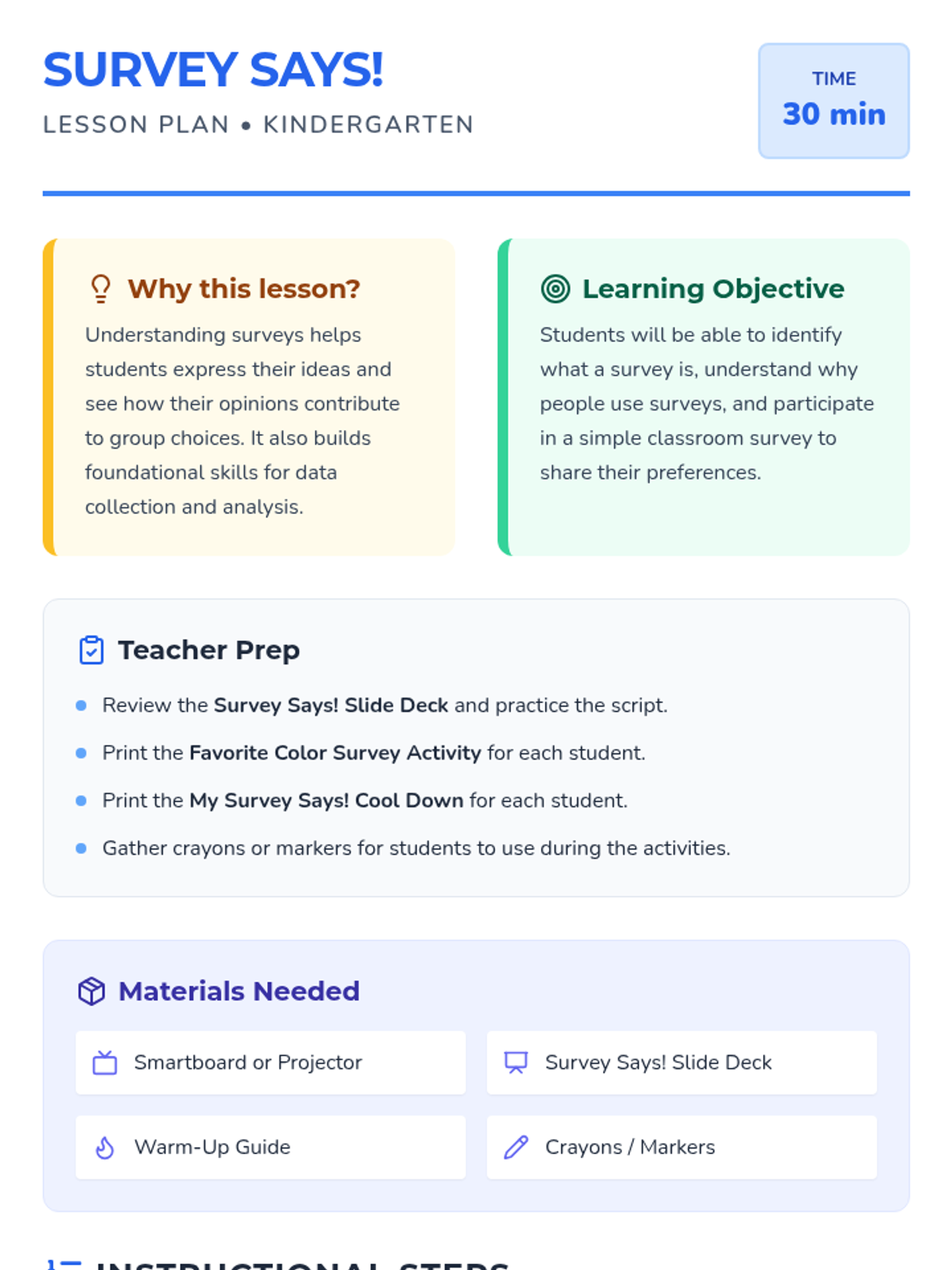 A 30-minute introductory lesson for Kindergarten students on surveys, teaching them how to gather and share information about preferences.