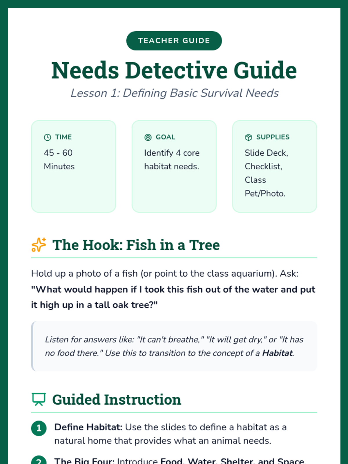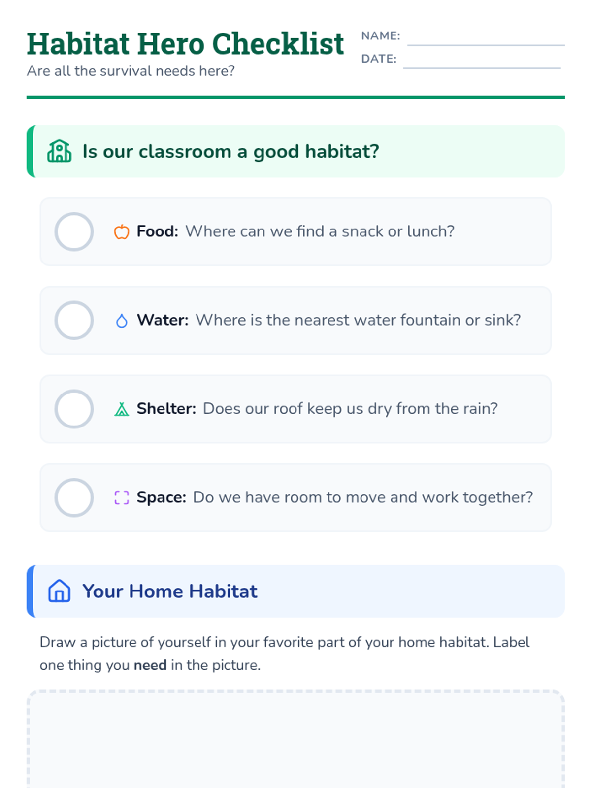 Students identify the four essential components of a habitat: food, water, shelter, and space through discussion and a classroom investigation.