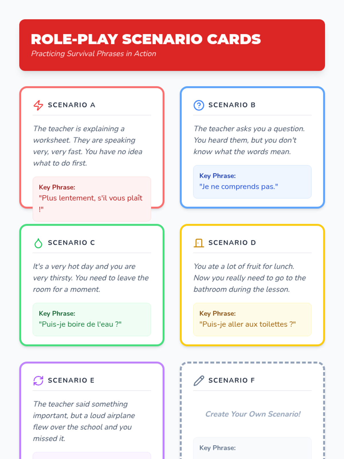 Students learn essential 'survival phrases' to advocate for their needs, such as asking for help, repetition, or permission. They practice through role-play scenarios.
