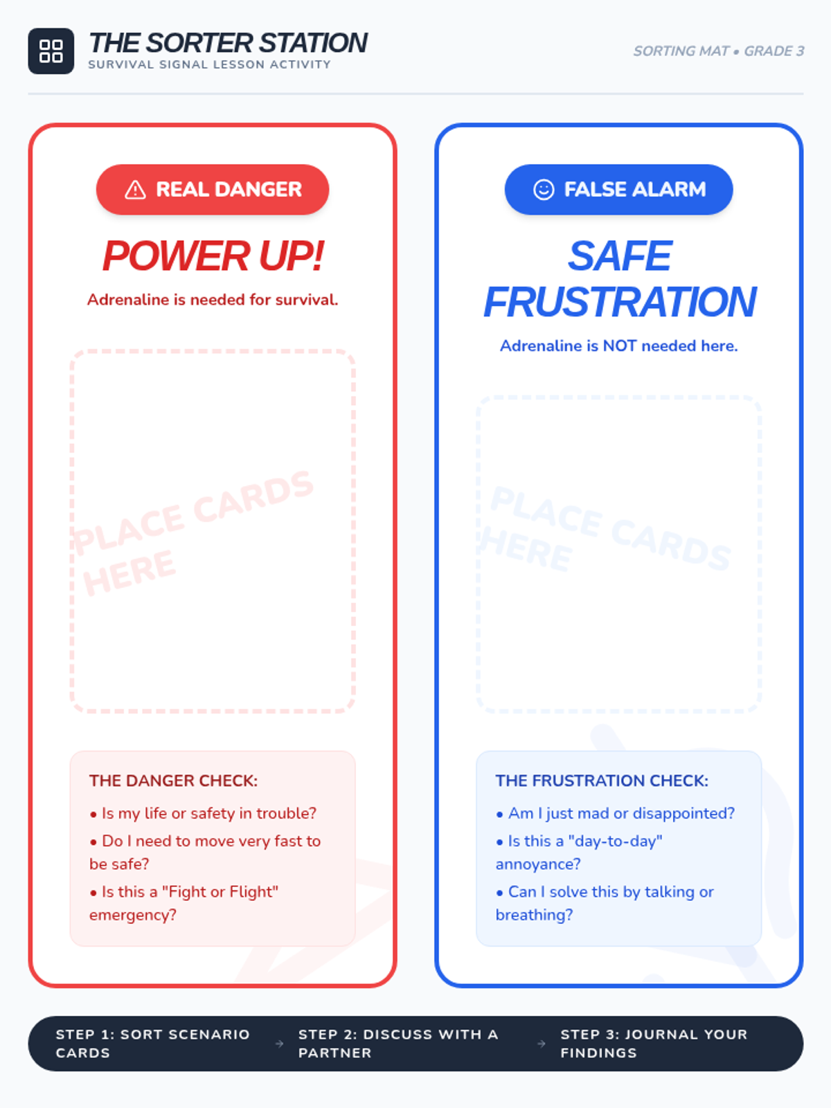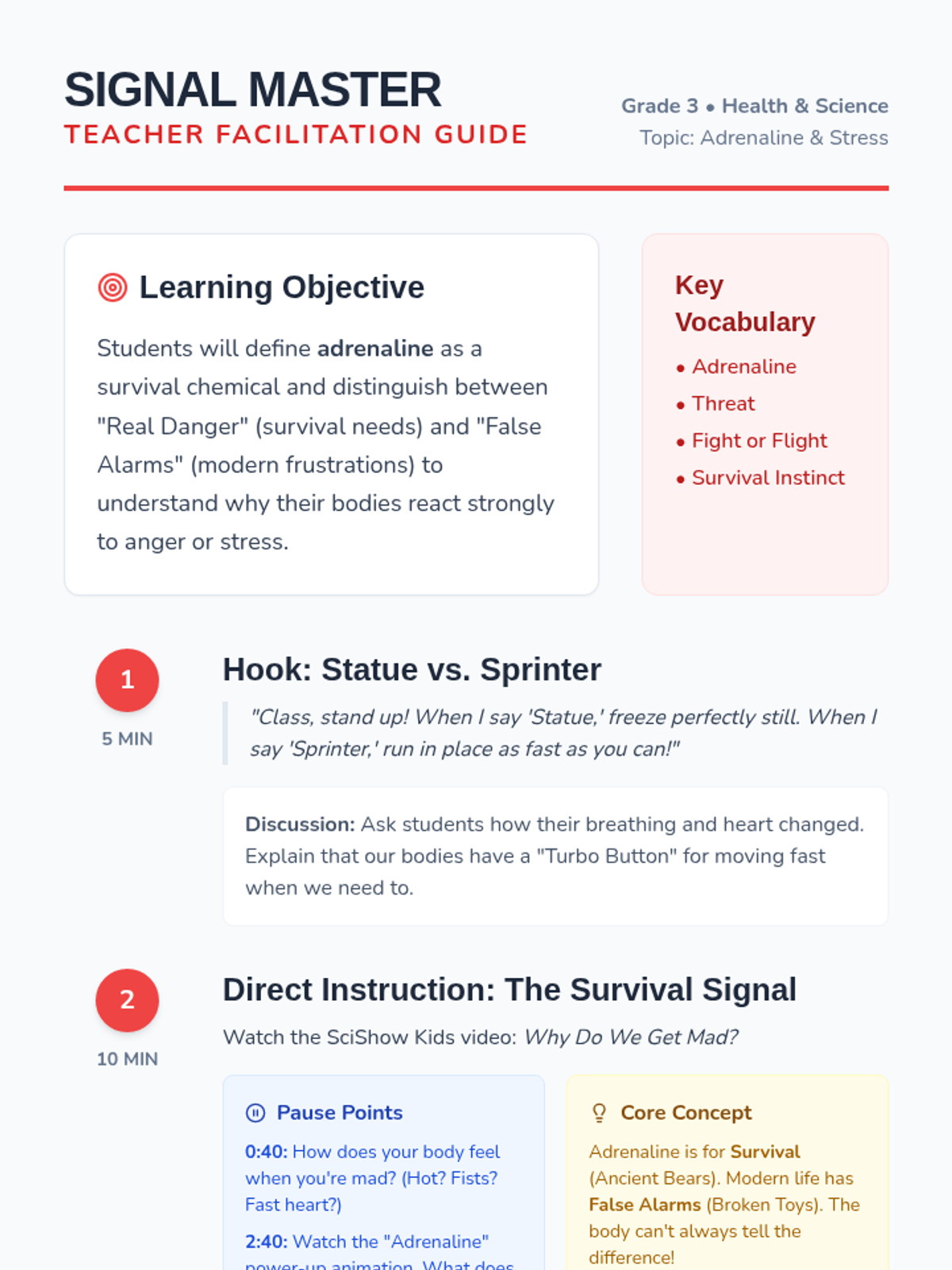 A high-energy lesson exploring how adrenaline acts as a survival signal, helping students differentiate between real danger and modern frustrations.