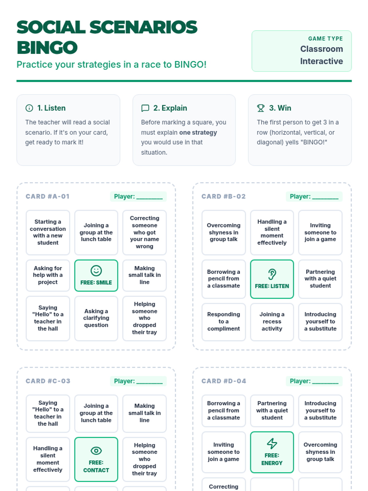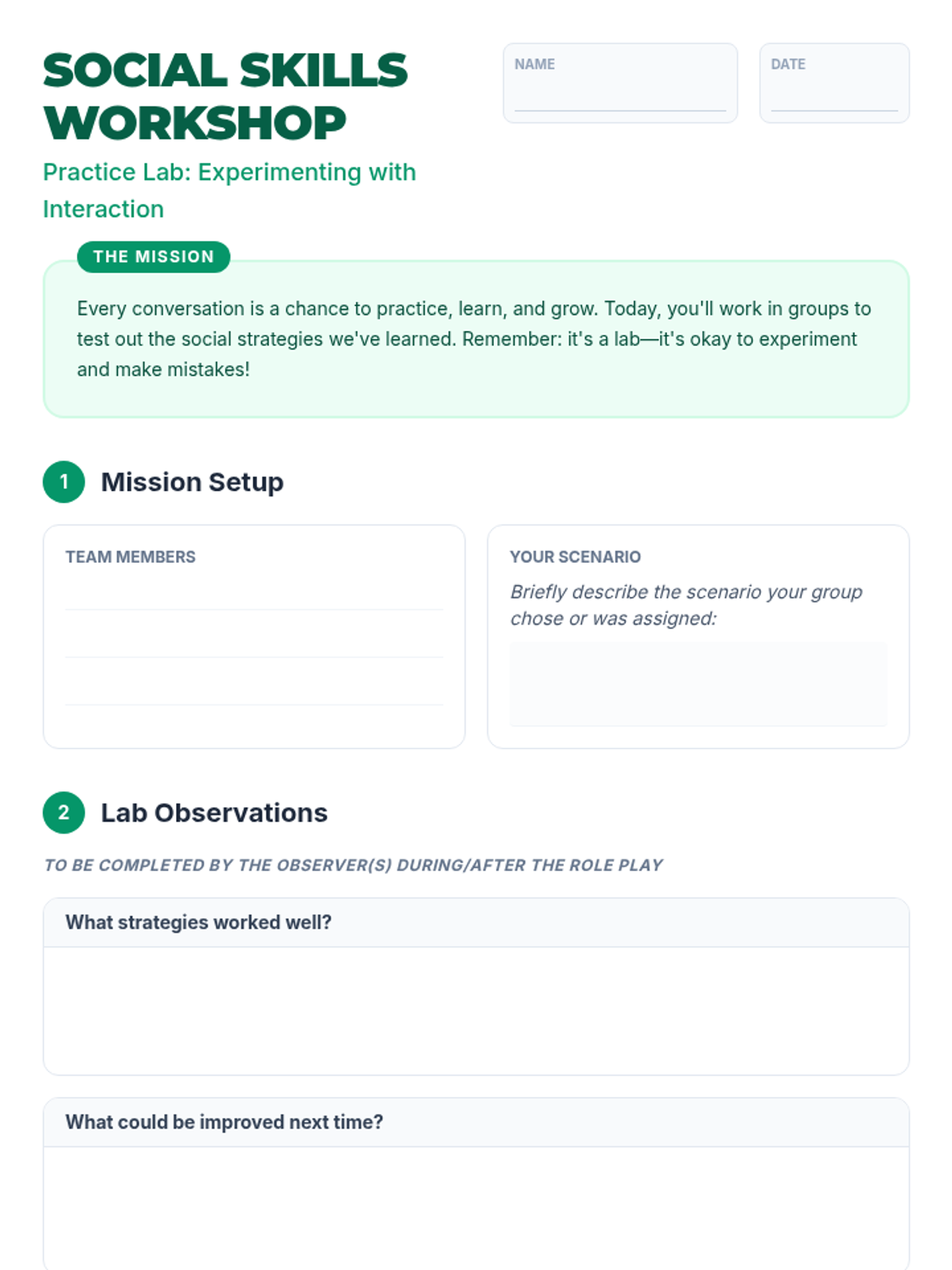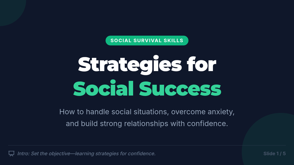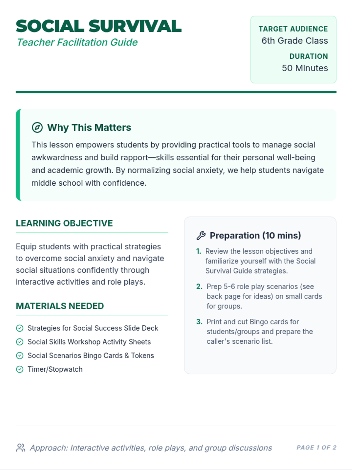 A practical guide for 6th-grade students to handle social interactions, overcome social anxiety, and build rapport through interactive activities and role plays.