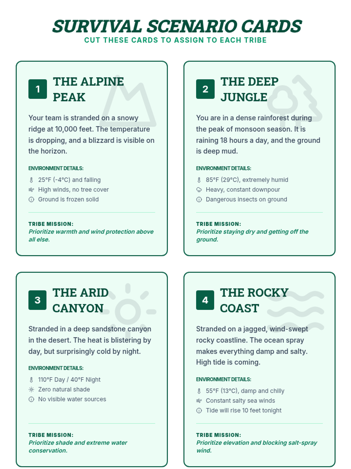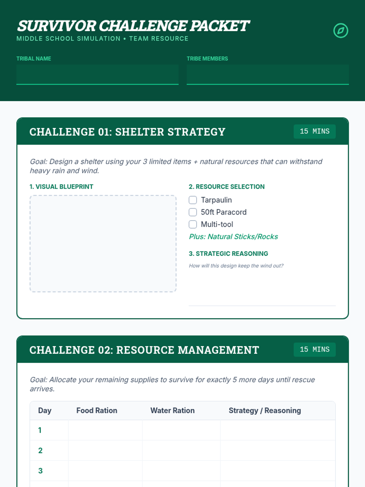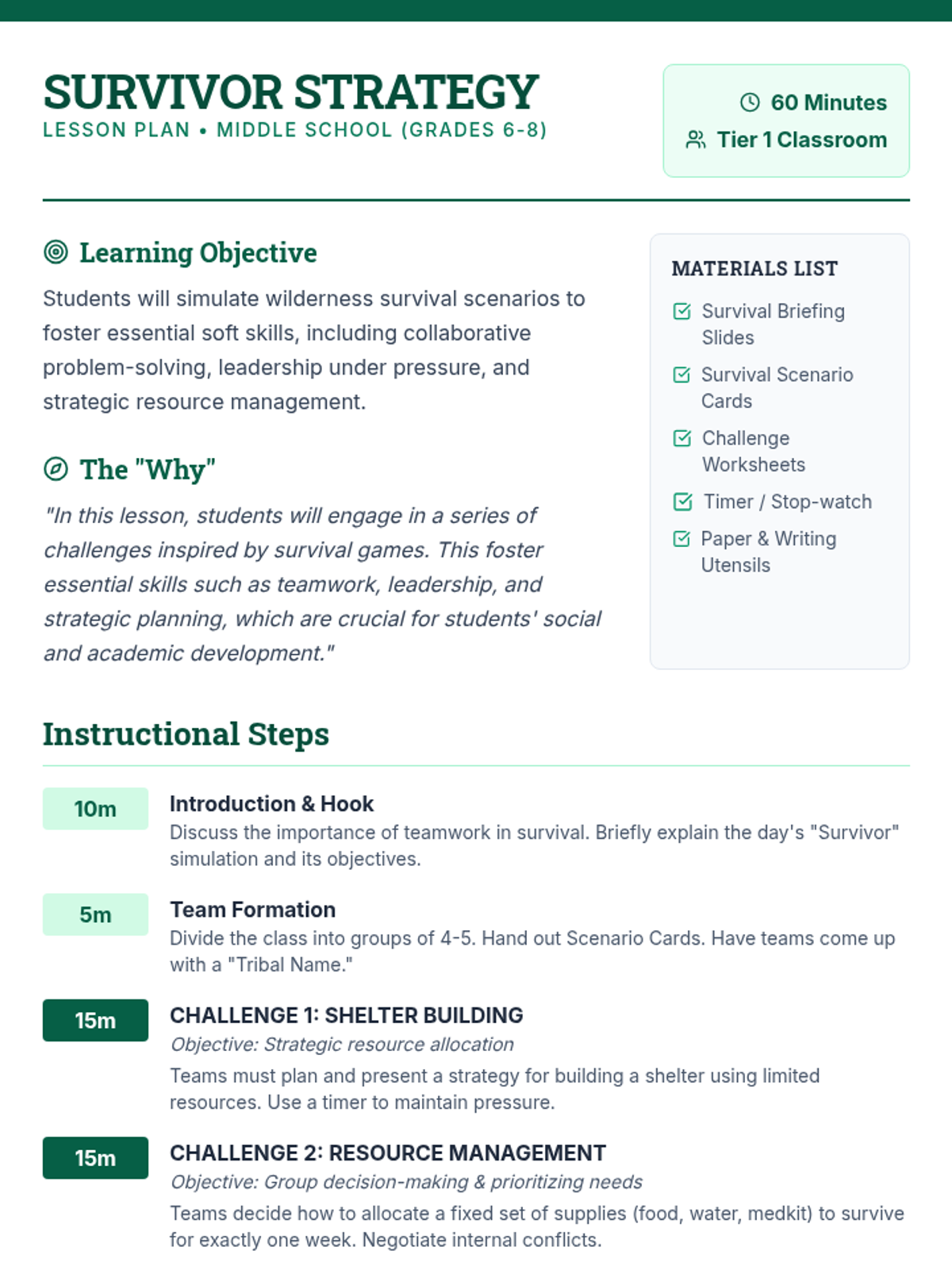 A high-energy, collaborative lesson where students simulate wilderness survival to develop teamwork, leadership, and strategic decision-making skills.