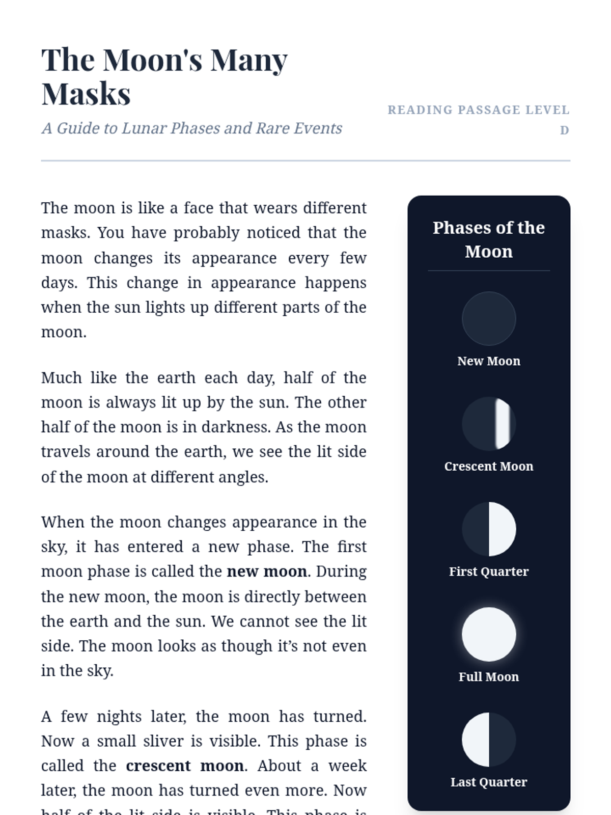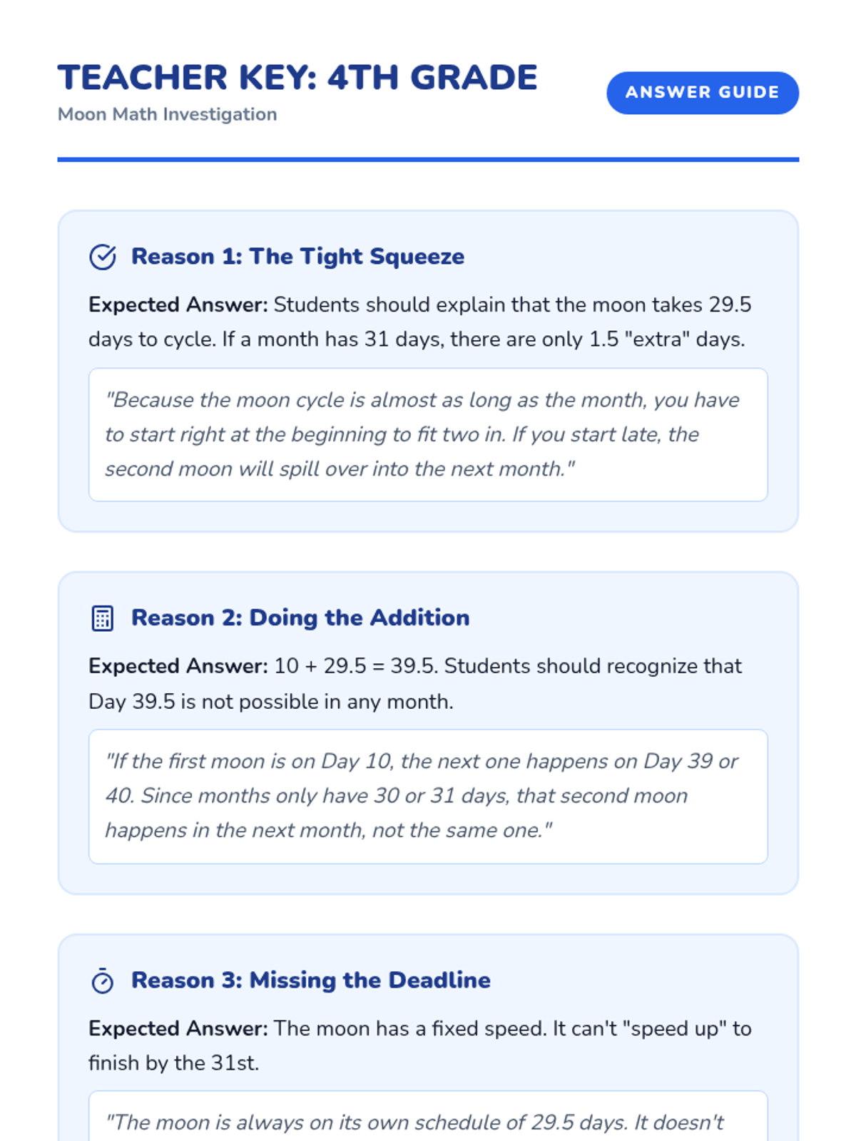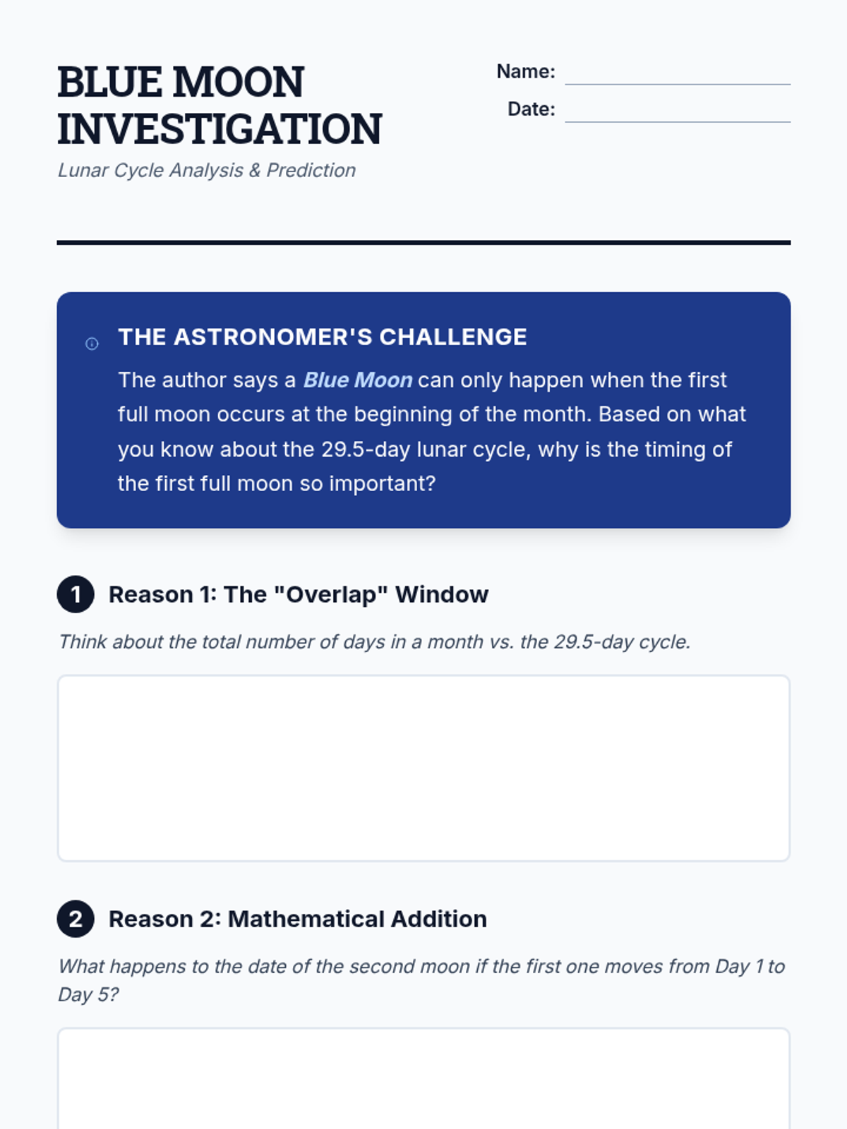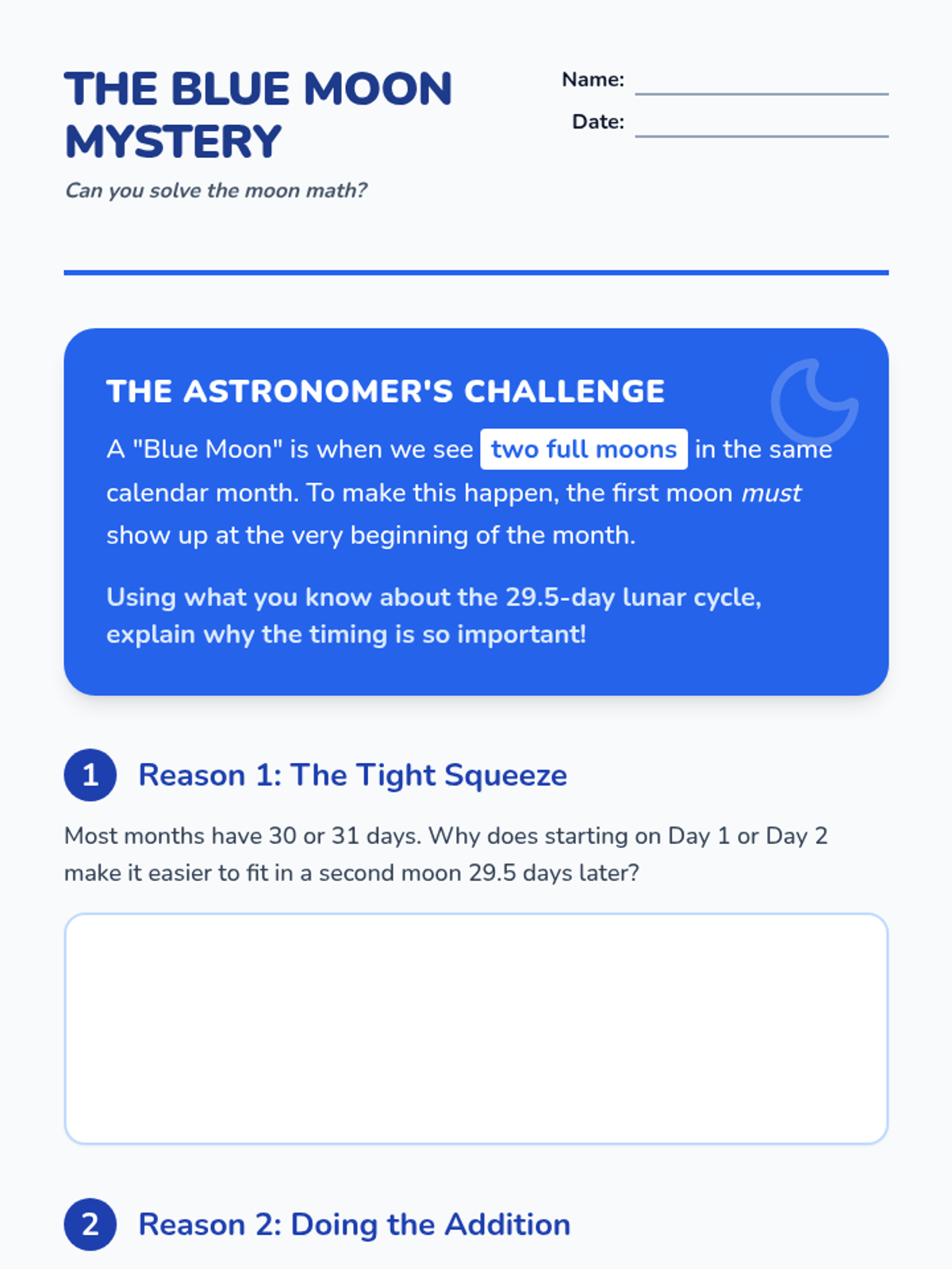 A science and math-focused lesson exploring the lunar cycle, calendar months, and the rare occurrence of 'Blue Moons' through calculation and observation.