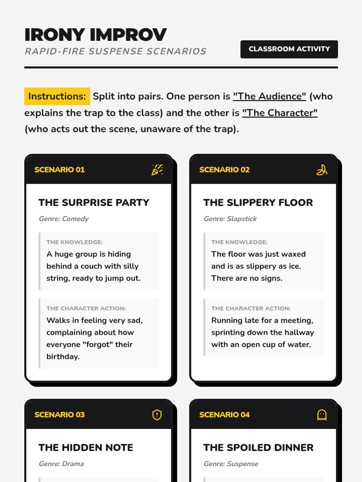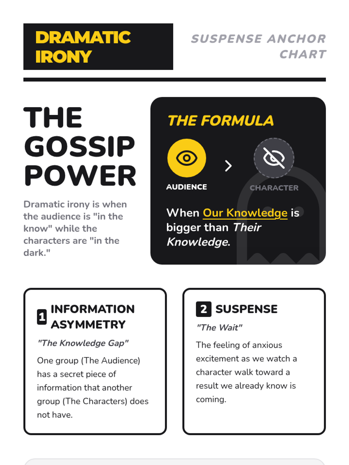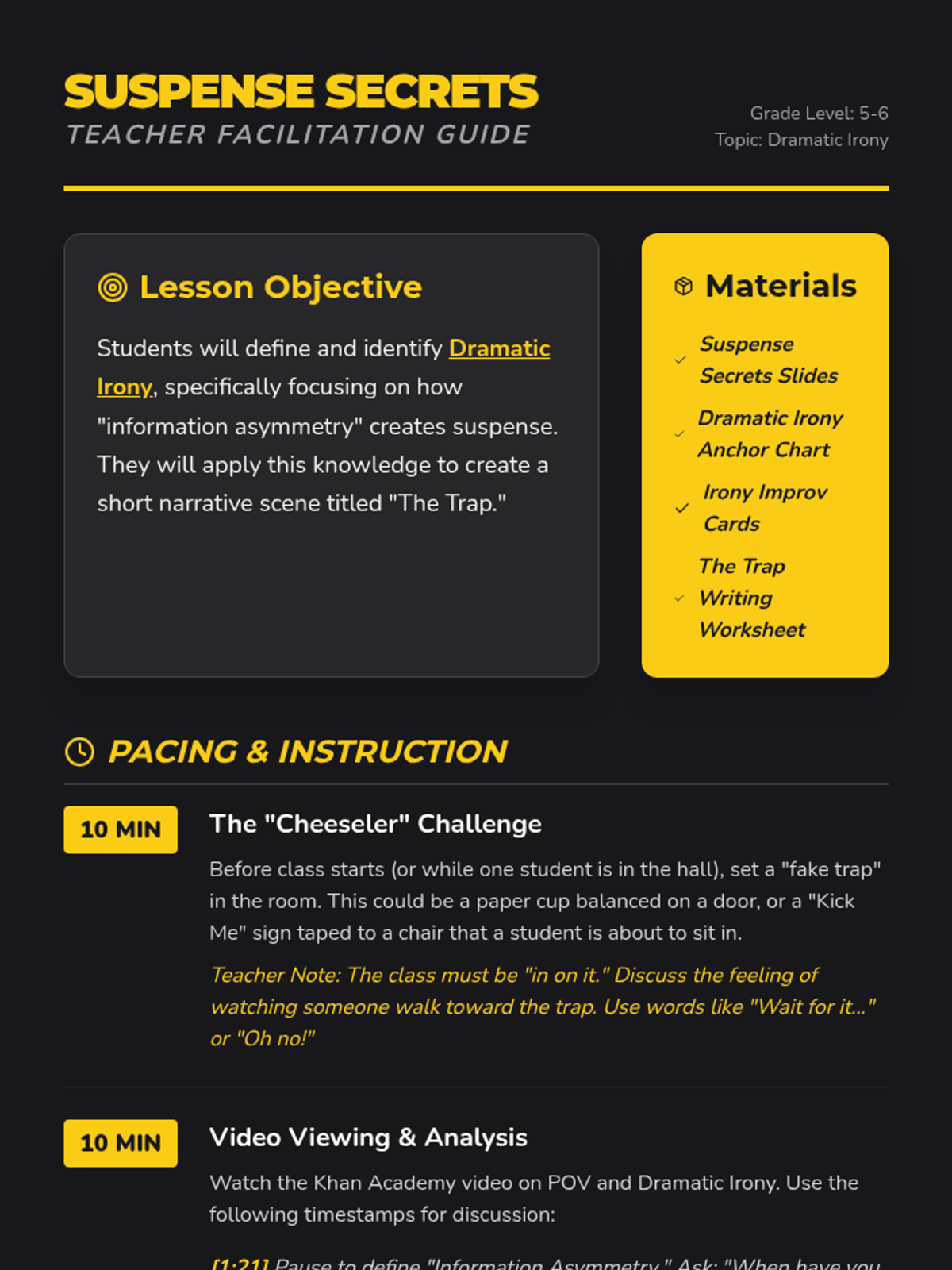 This lesson introduces 5th-6th grade students to dramatic irony through the 'The Cheeseler' scenario. Students will analyze how information asymmetry creates suspense and then write their own narrative scene titled 'The Trap' to apply the concept.