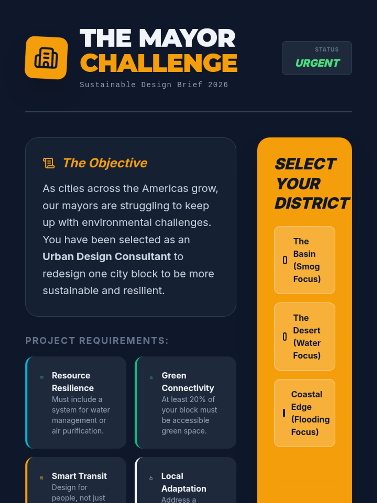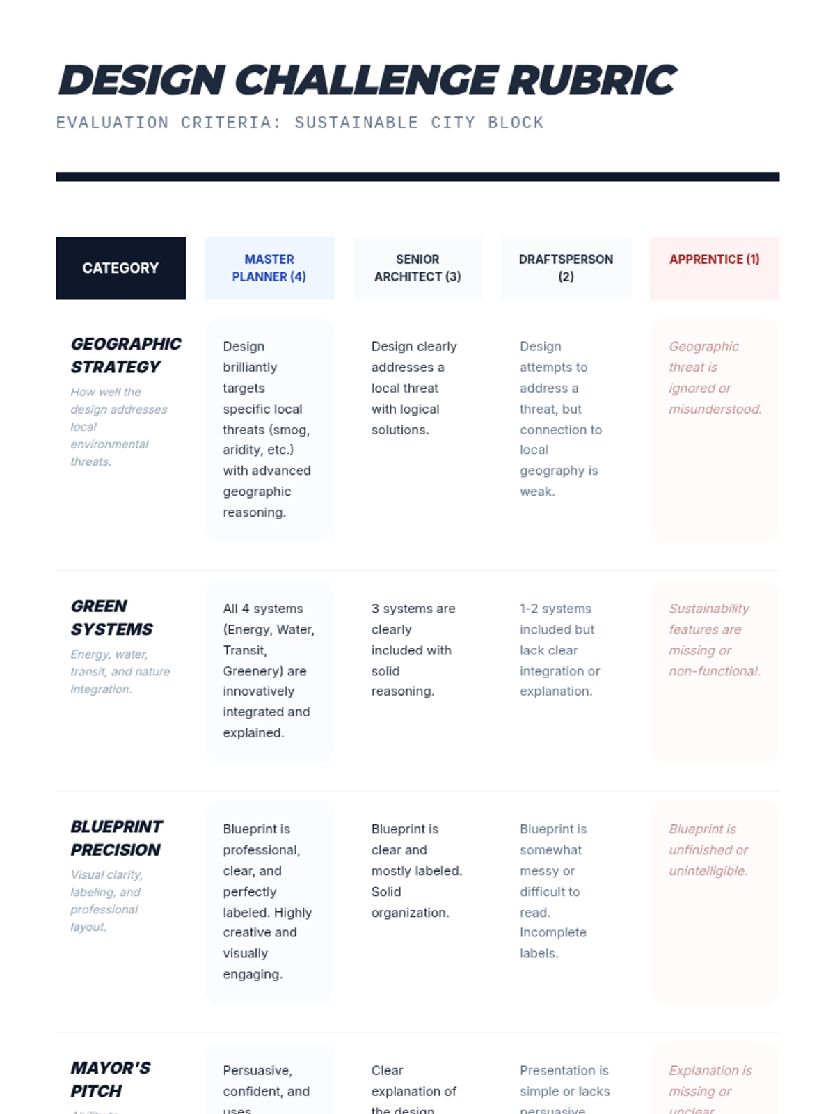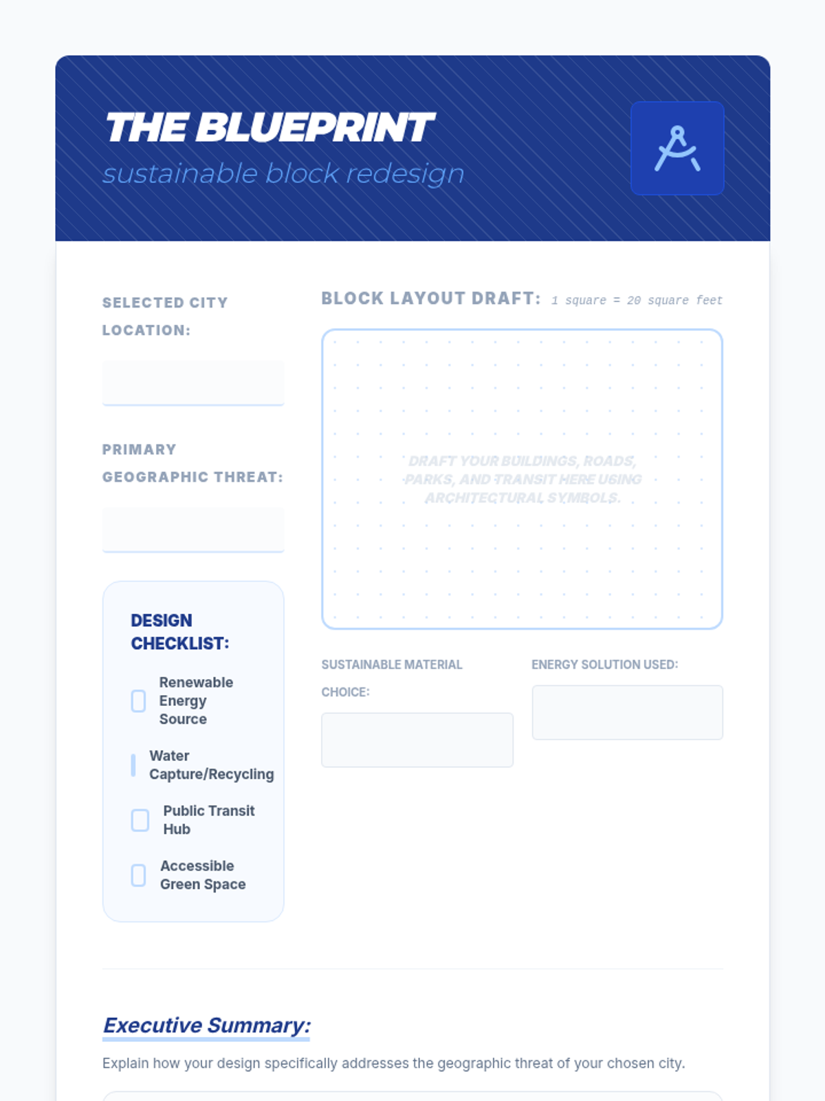 The capstone design challenge where students apply their learning to redesign a city block that addresses specific geographic and environmental needs.