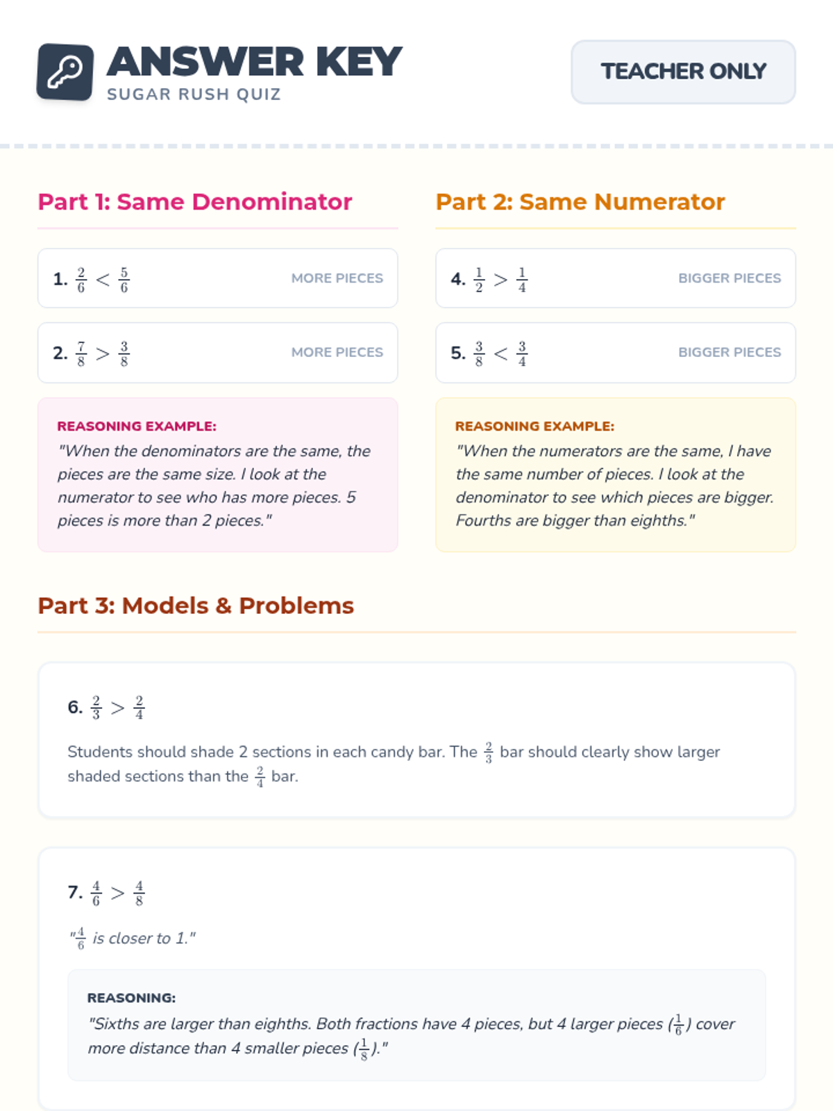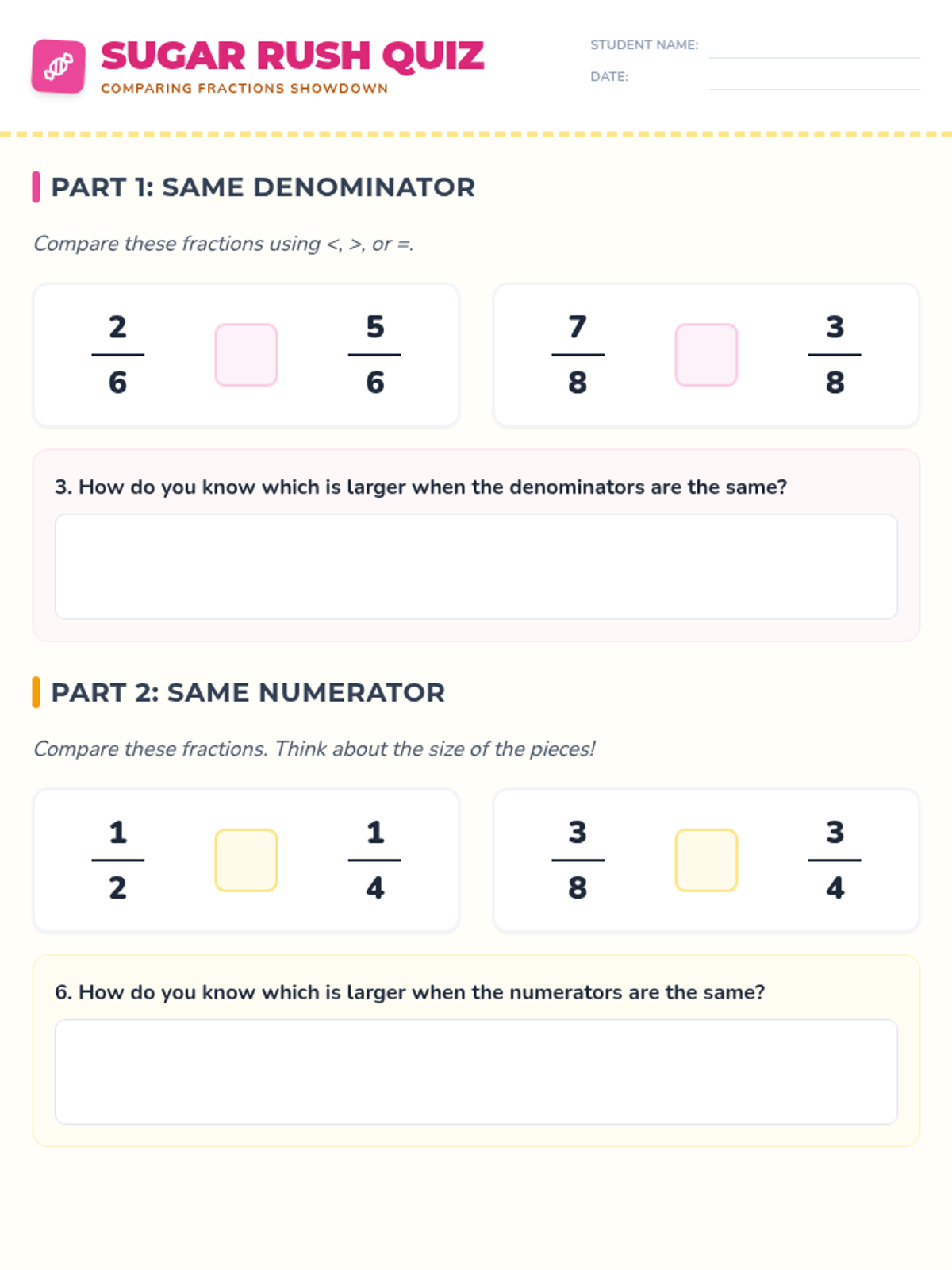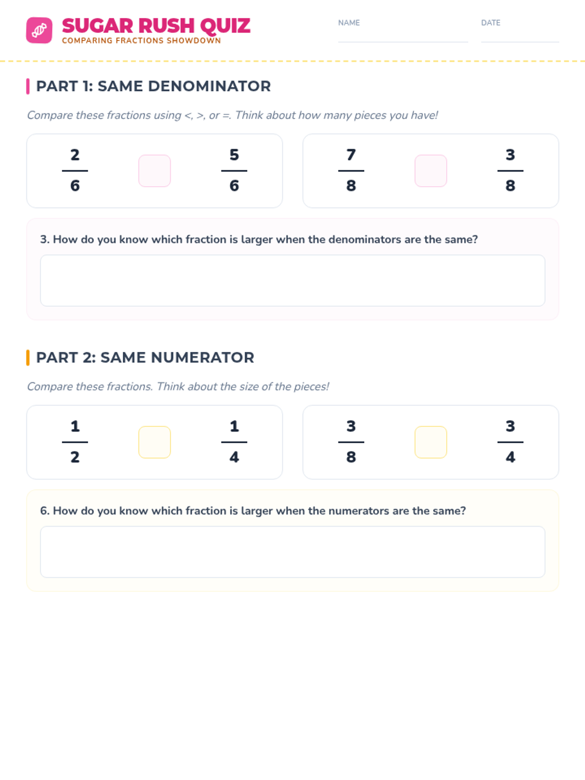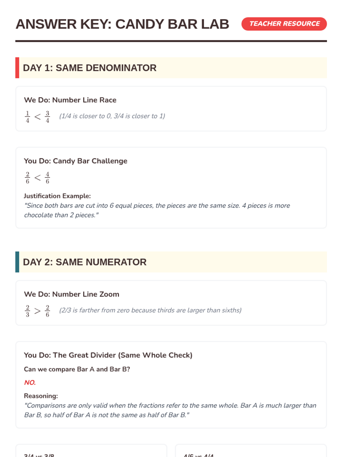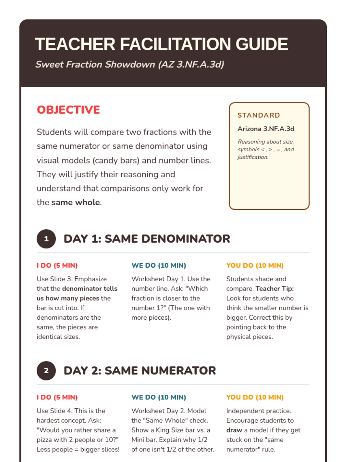 A two-day small group lesson focused on comparing fractions with the same numerator or same denominator using candy bar models and number lines. Includes conceptual modeling, guided practice, and independent work to master Arizona standard 3.NF.A.3d.
