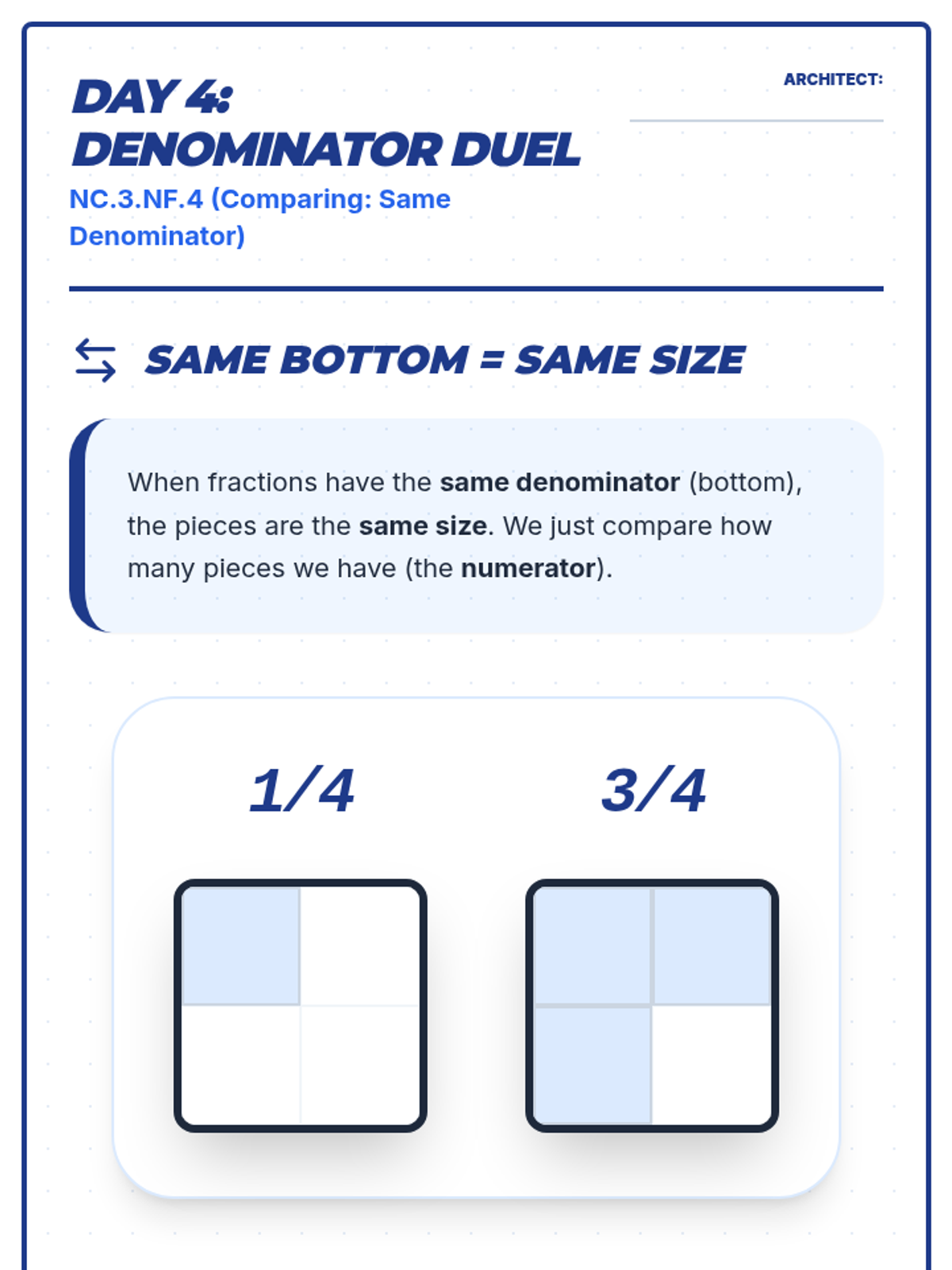 Teaches comparing fractions with the same denominator using area and length models.