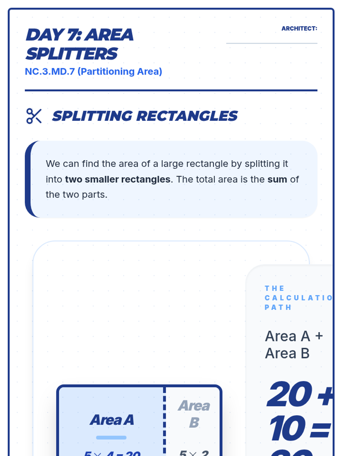 Introduces area through tiling and relates it to multiplication of side lengths.