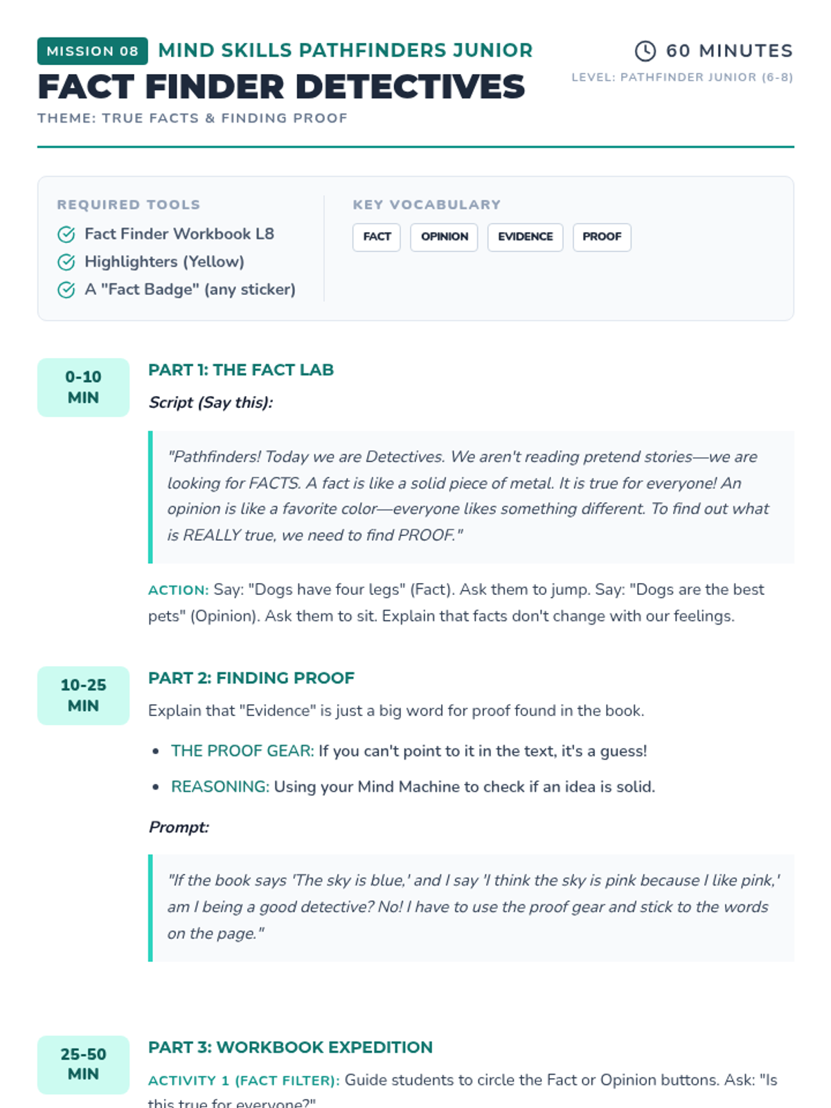 Develops information decoding skills by teaching students to search for facts and evidence within a text, much like a forensic scientist.