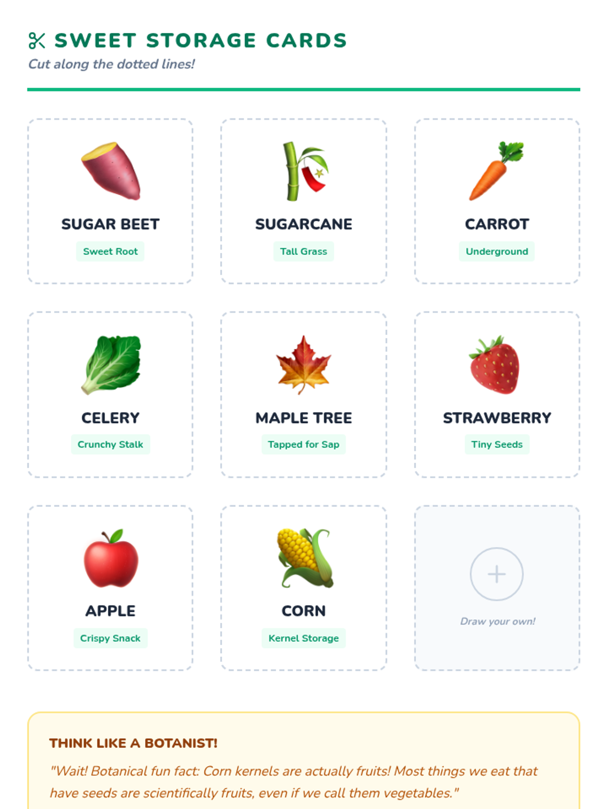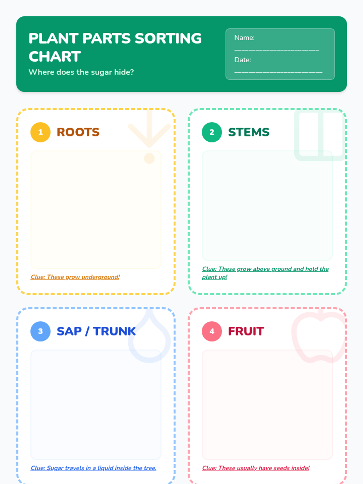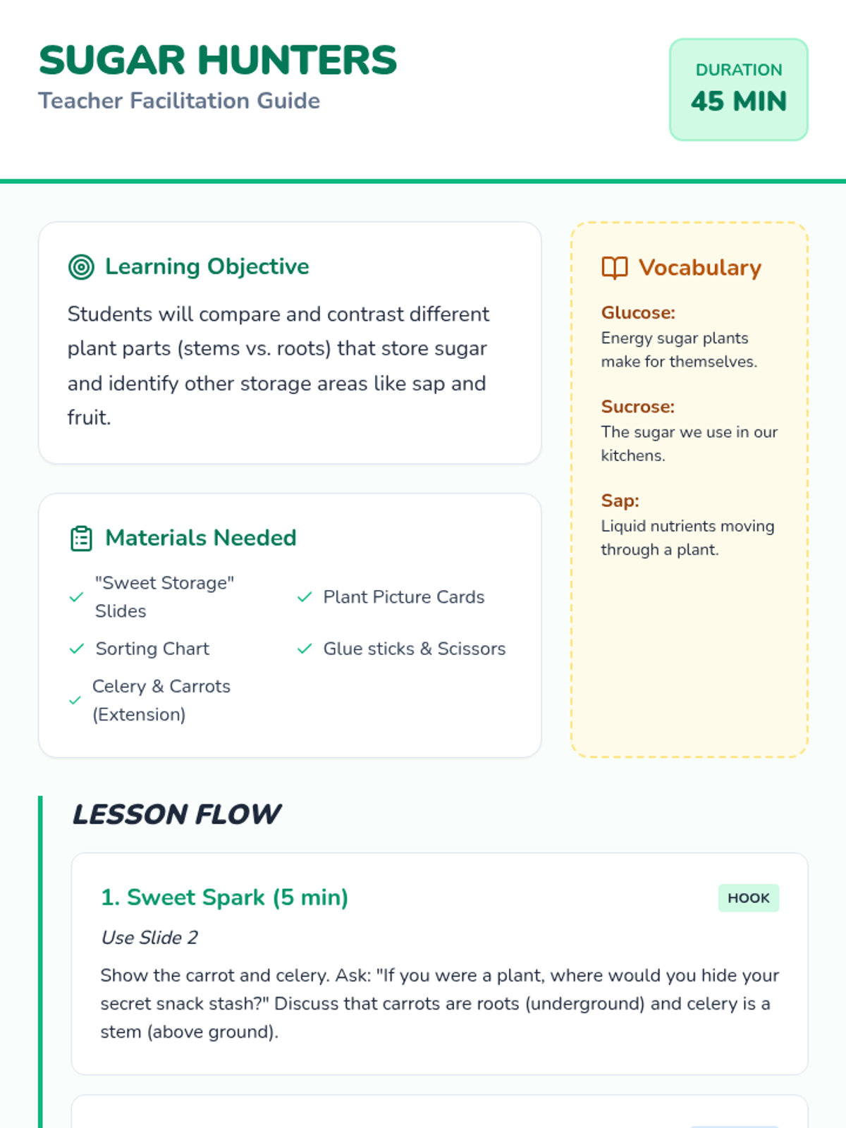 A 3rd-grade science lesson where students explore how plants create and store sugar in different parts, comparing and contrasting roots, stems, and sap.