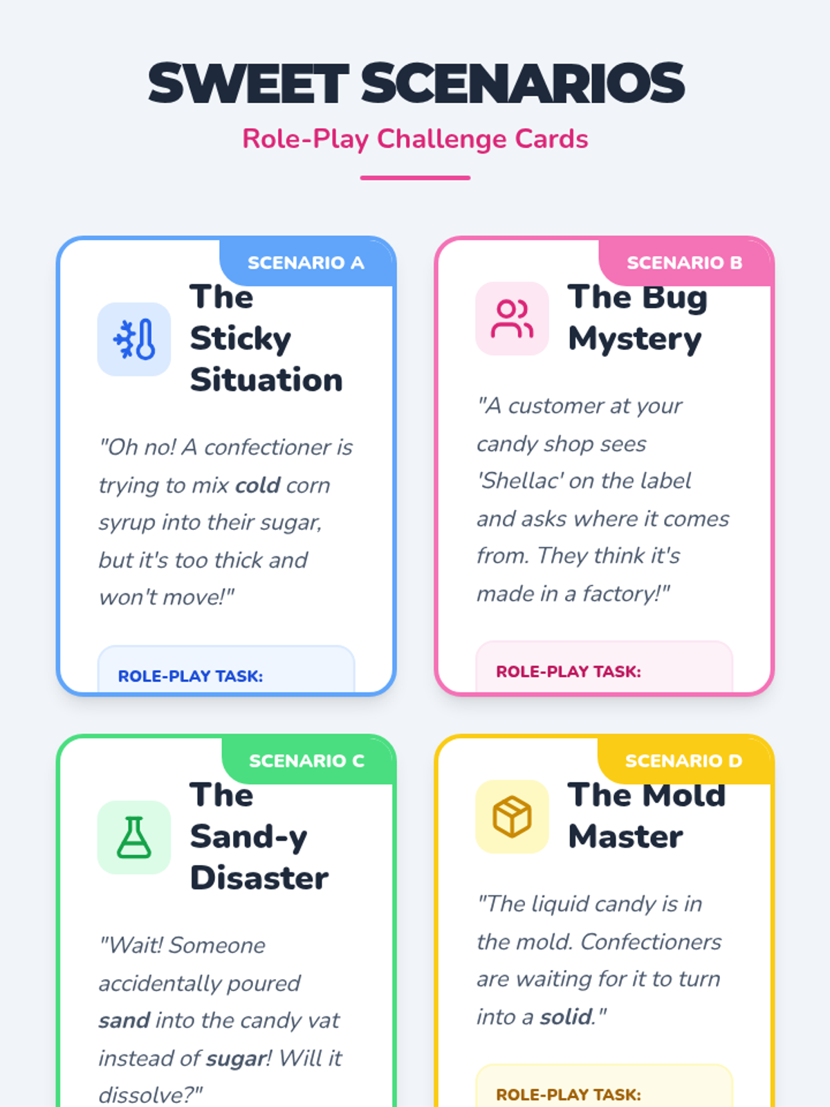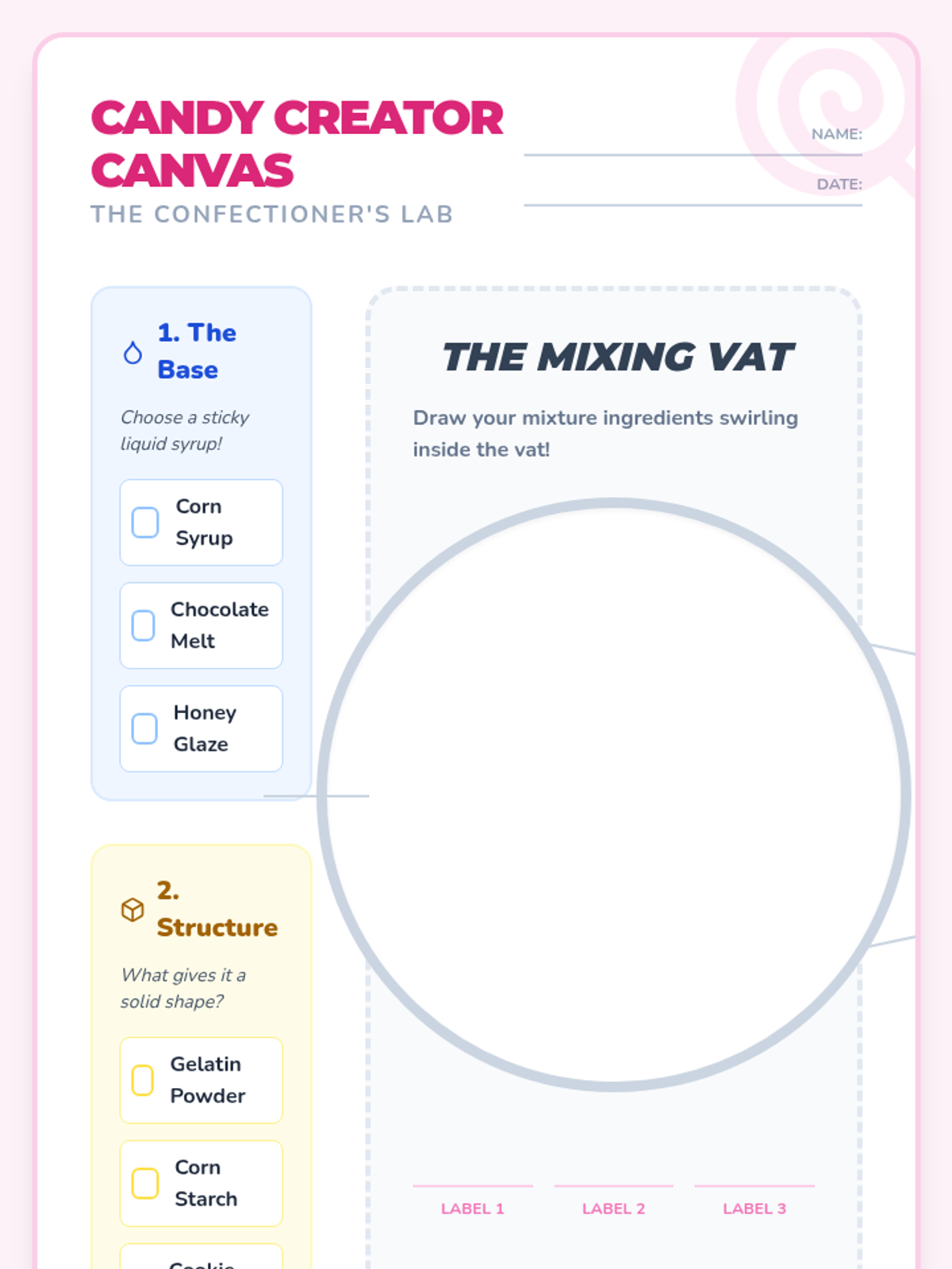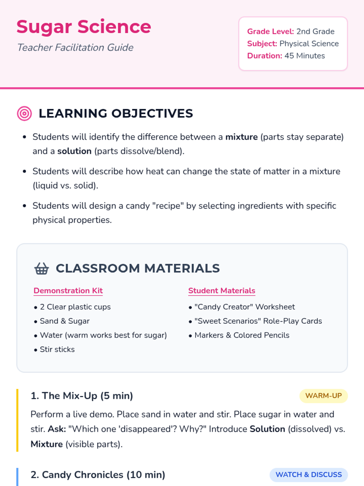 A hands-on science lesson exploring mixtures and solutions through the lens of candy making. Students will investigate how ingredients like sugar, gelatin, and corn syrup combine to create different textures and states of matter.