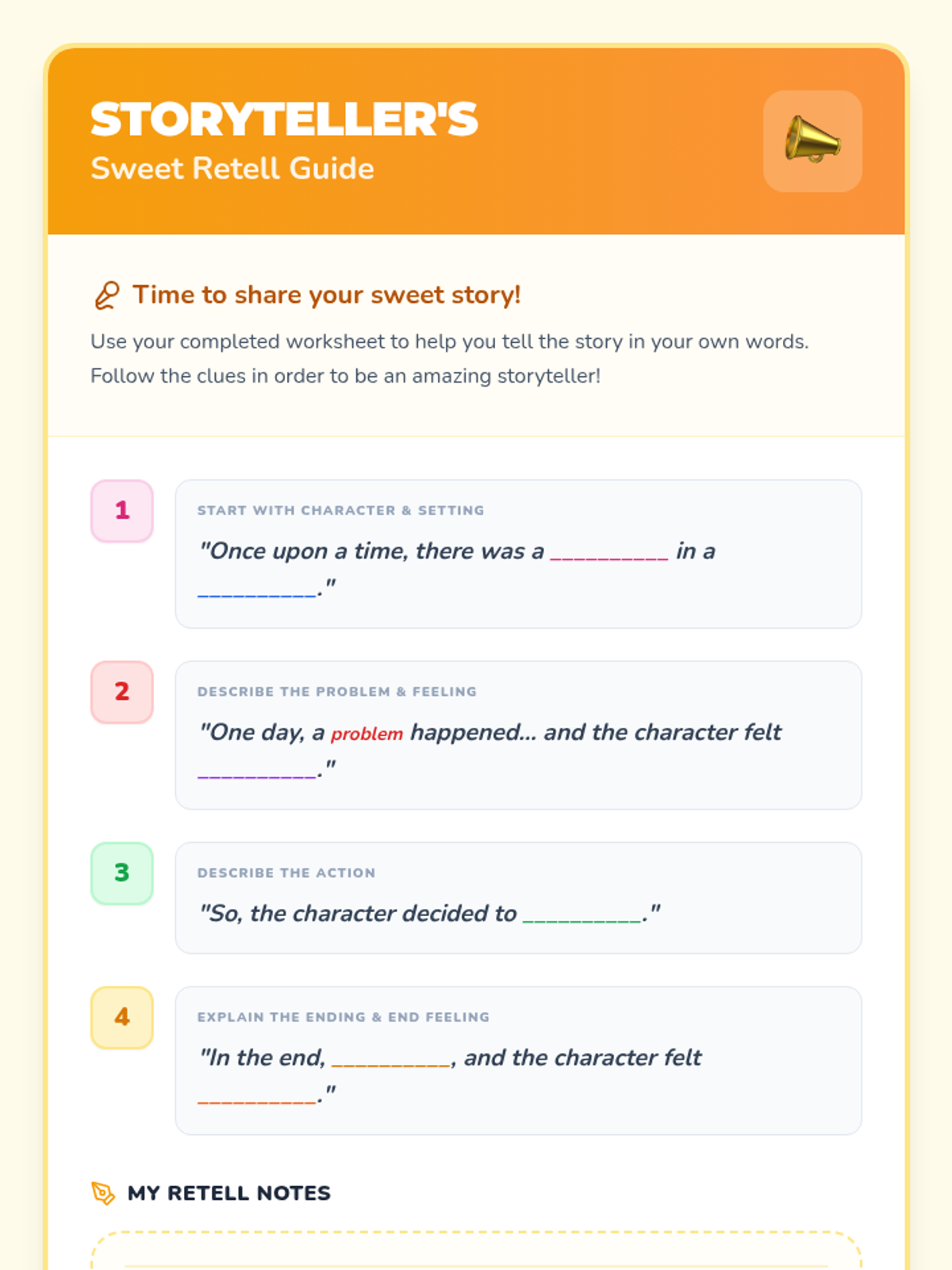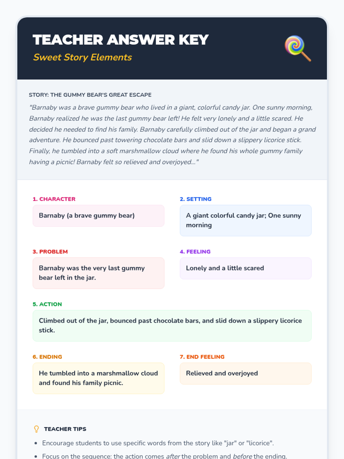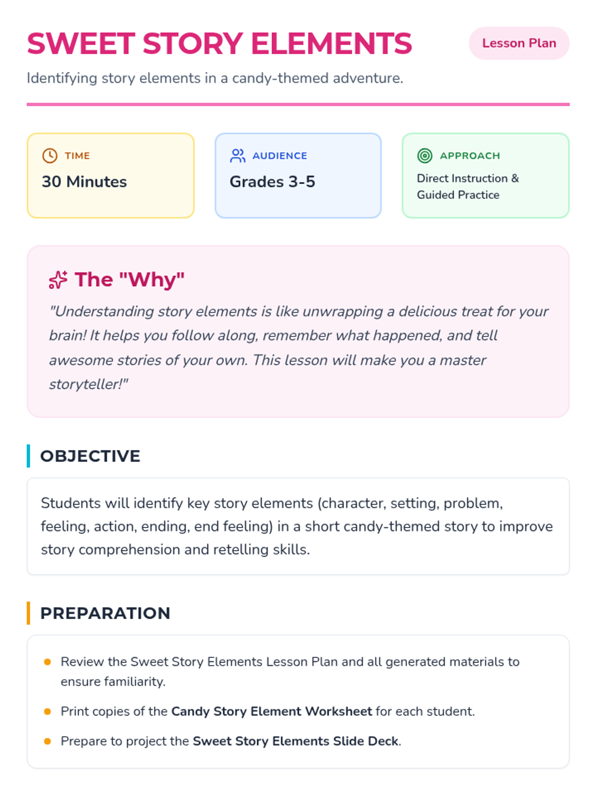 A 30-minute candy-themed lesson for 3rd-5th grade students to identify key story elements (character, setting, problem, feeling, action, ending, end feeling) to improve comprehension and retelling skills.